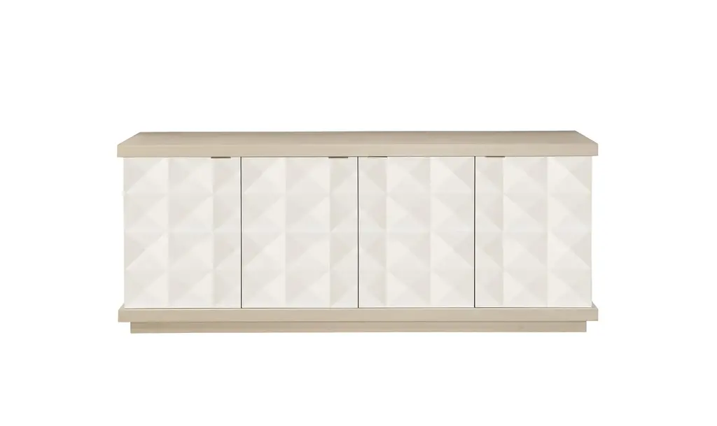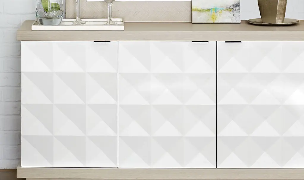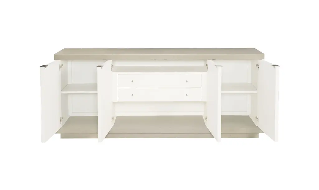 Axiom Buffet by Bernhardt is a masterpiece of modern design and functionality. This buffet bleeds sophistication and elegance, constructed with a blend of poplar solids and engineered faux anigre veneers.The buffet showcases a stunning linear gray finish on the case, perfectly complemented by a linear white finish on the end panels, creating a captivating contrast that will surely enhance any dining space. The four doors feature cast-shaped overlays in a refined White Linen finish.It is equipped with soft/self-closing hinges, and the doors open to reveal a spacious interior. The end doors accommodate an adjustable and removable shelf, providing flexible storage options for your dinnerware and other essentials. The paired center doors conceal two drawers and two open compartments, offering extra organization possibilities.For your comfort, the top drawer of the Axiom Buffet includes a silverware insert, keeping your cutlery neatly organized and easily accessible. The second drawer features a wrapped pad, protecting delicate items. It comes with adjustable glides that provide stability and allow easy positioning, adapting to any flooring surface.