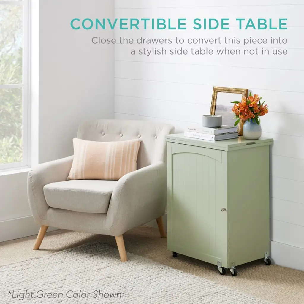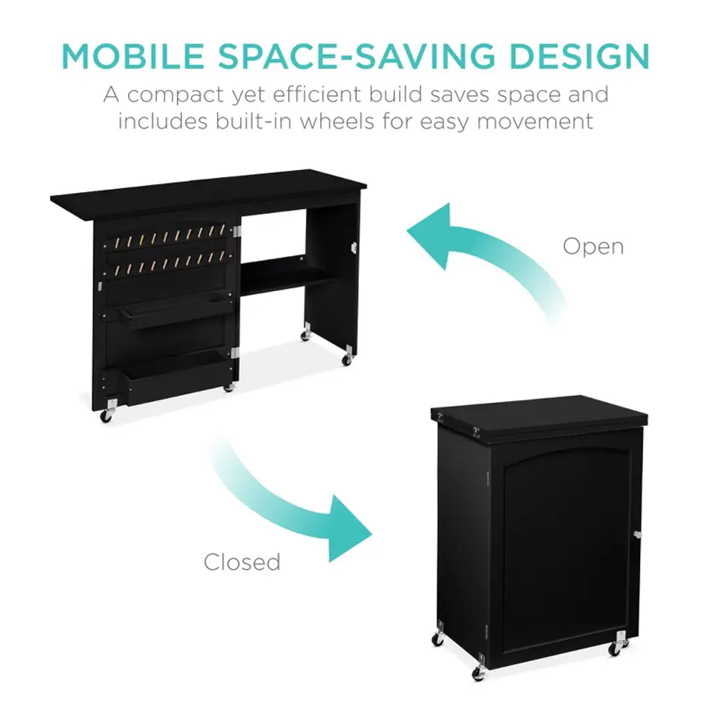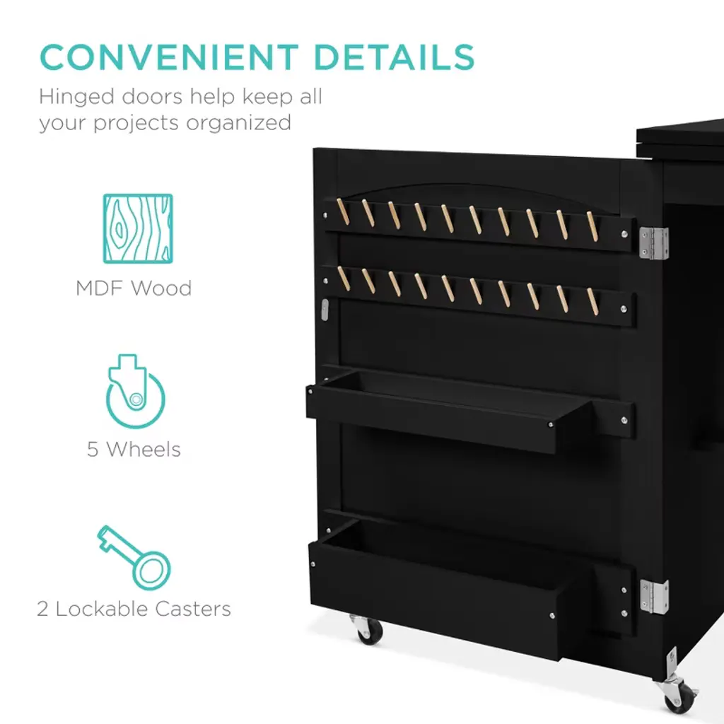 The DIY tailor craze is here to stay. This convertible side and sewing table is the perfect way to keep your home business separate from your home life. Have a designated spot for your yarn, pins, scissors, and machine when not in use. The design features 20 Pegs, 2 attached storage trays, and 1 Large Interior Shelf for maximum convenience. The shelf also has 16 of upper space and 13.25" of lower space for ample storage when in use. Get lost in a project with the help of a designated sewing table, or use it for work or other crafts. Compact but efficient design saves space and is easy to move with built-in wheels. When open, this desk is the pinnacle of convenience. When closed, this table is compact and stylish. Close drawers and convert into a side table when not in use to keep projects organized with the help of hinges. MDF Wood, 5 Wheels, and 2 Lockable Casters mean this table is a strong and sensible addition to any home tailor's arsenal."