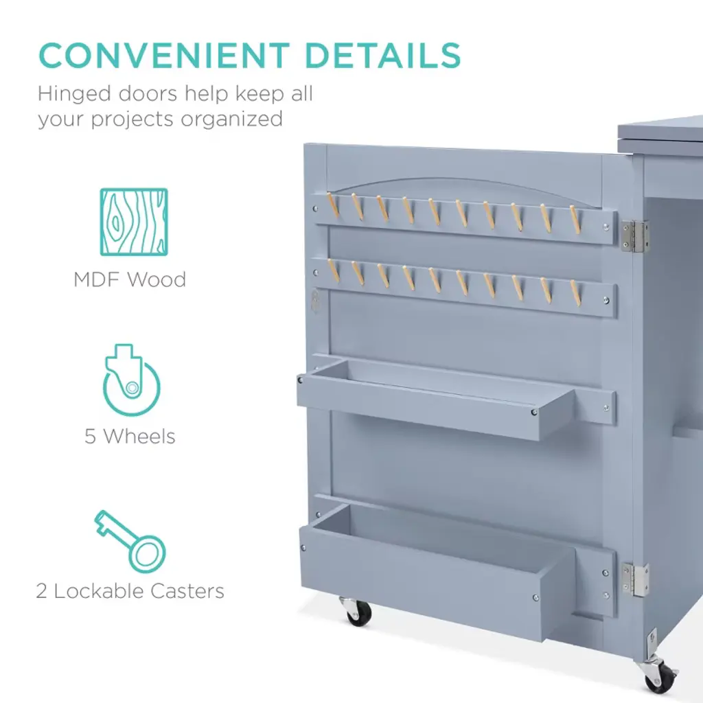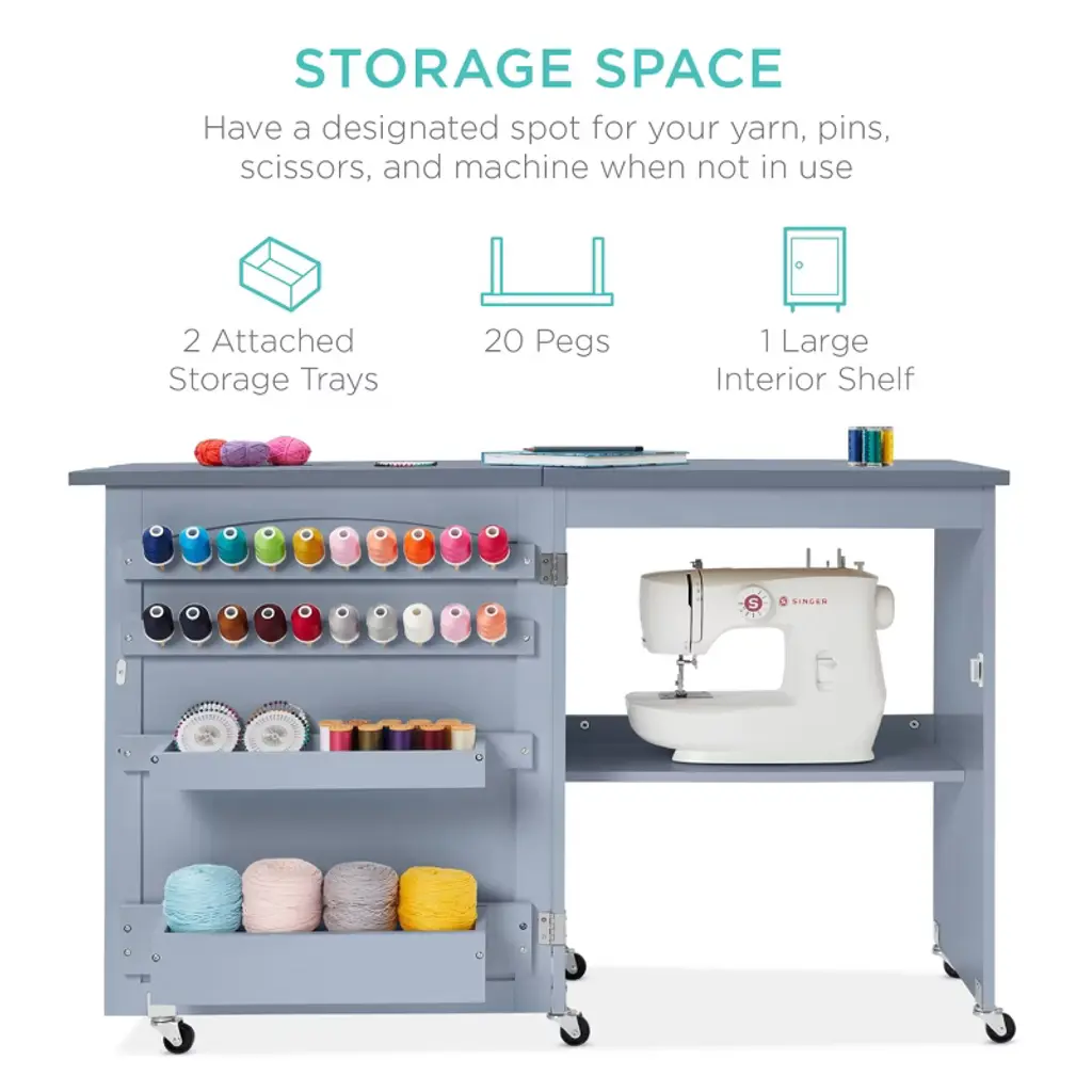 The DIY tailor craze is here to stay. This convertible side and sewing table is the perfect way to keep your home business separate from your home life. Have a designated spot for your yarn, pins, scissors, and machine when not in use. The design features 20 Pegs, 2 attached storage trays, and 1 Large Interior Shelf for maximum convenience. The shelf also has 16 of upper space and 13.25" of lower space for ample storage when in use. Get lost in a project with the help of a designated sewing table, or use it for work or other crafts. Compact but efficient design saves space and is easy to move with built-in wheels. When open, this desk is the pinnacle of convenience. When closed, this table is compact and stylish. Close drawers and convert into a side table when not in use to keep projects organized with the help of hinges. MDF Wood, 5 Wheels, and 2 Lockable Casters mean this table is a strong and sensible addition to any home tailor's arsenal."
