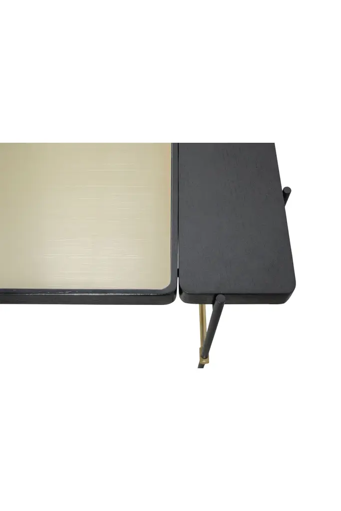 Elevate your living room with the Versmissen's Highline Coffee Table, a statement piece that exudes both modernity and simplicity. It features a captivating combination of materials, with a stainless steel frame and a rich oak veneer, creating a blend of durability and elegance. The black legs and brushed gold steel criss-cross accents at the bottom of the legs add a touch of opulence to any bedroom decor. It boasts reversible tray tops, providing a stylishly unique solution for keeping knick knacks organized.