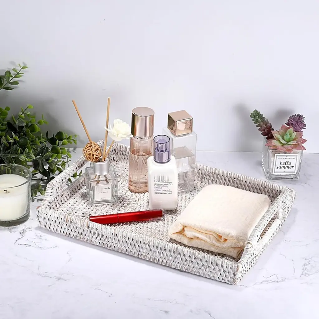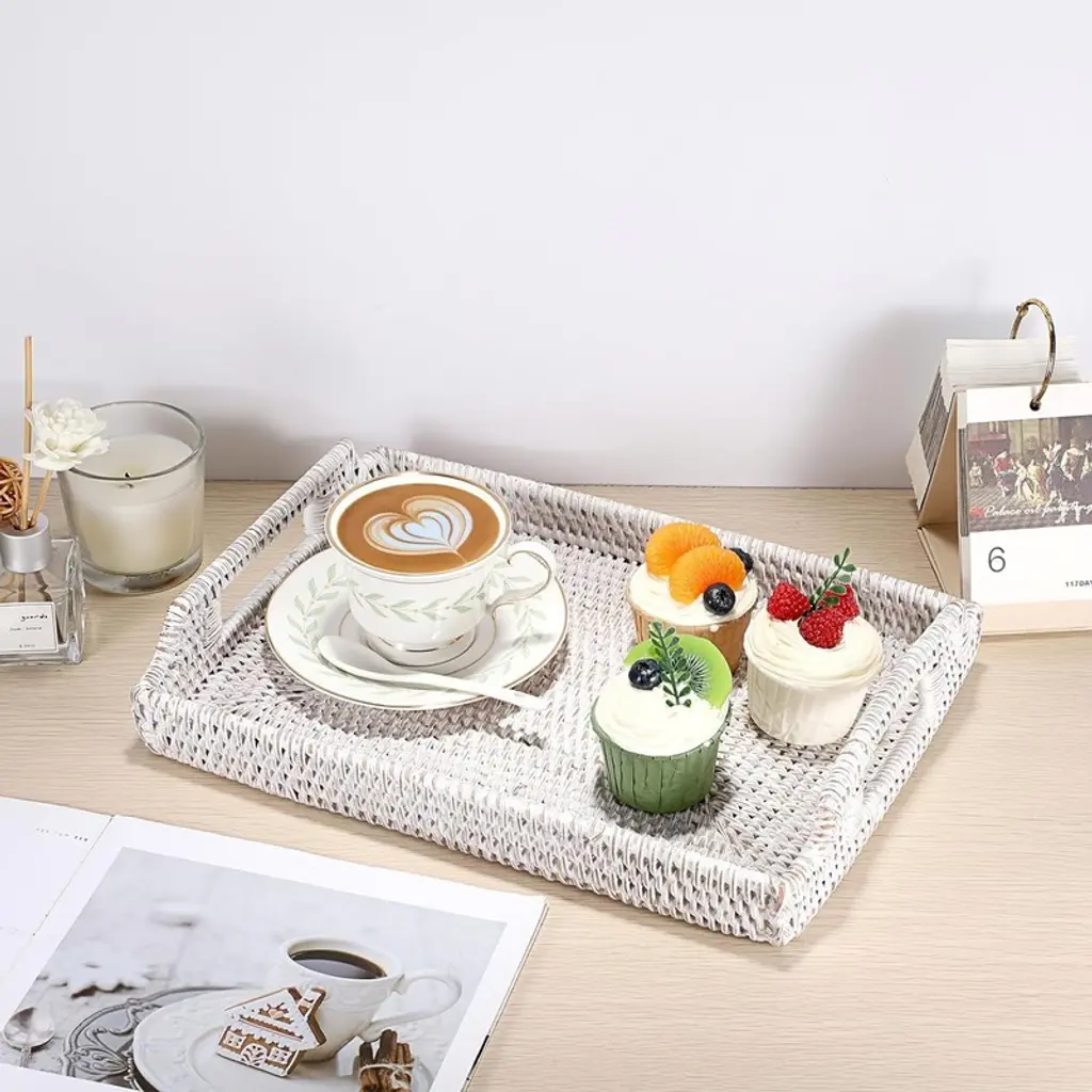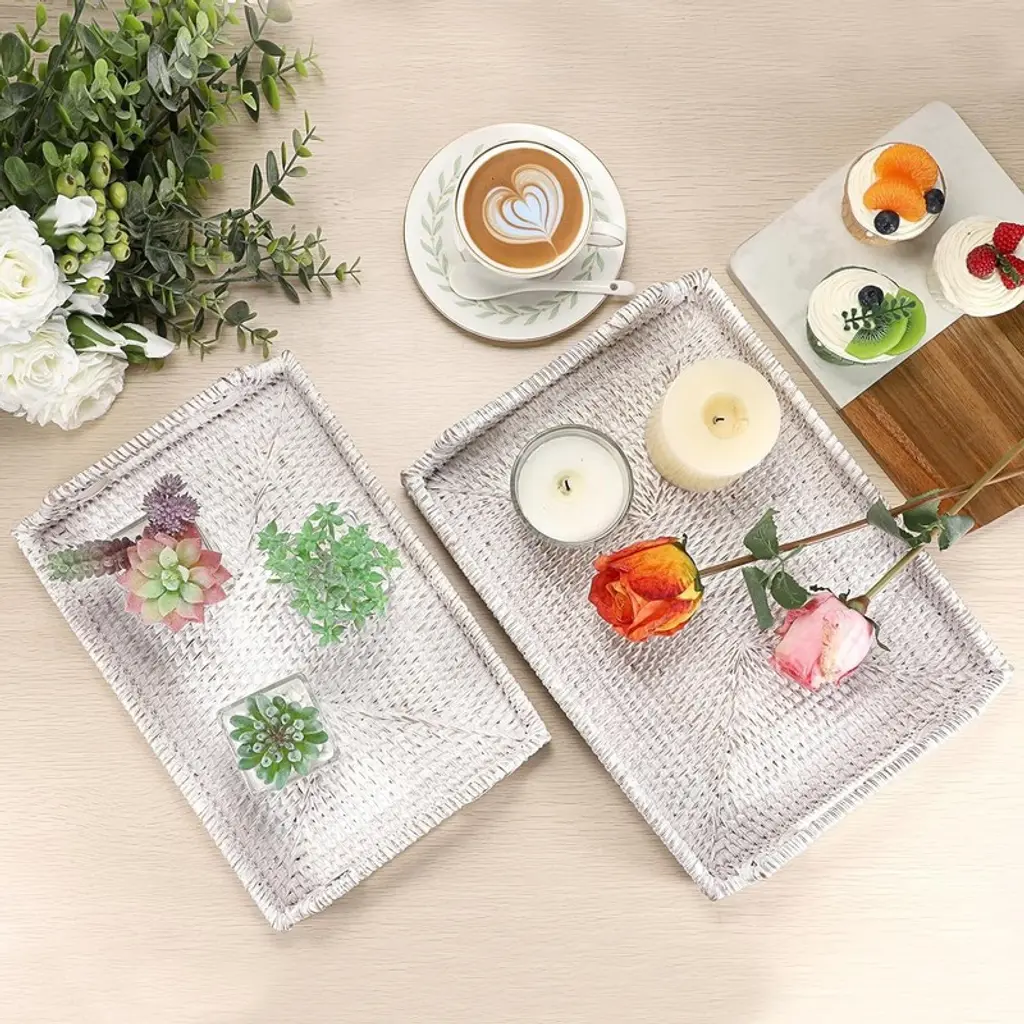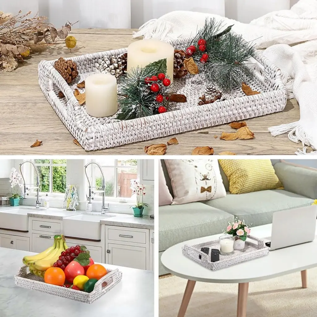 This exquisitely handcrafted rectangular rattan tray combines artisanal elegance with practical functionality. Measuring 13.6" L x 9.8" W, this beautifully crafted tray features natural wooden handles and a pristine white finish, meticulously woven from natural rattan using traditional techniques. The sturdy base and carefully woven fibers ensure durability while the white finish brightens any space. Perfect for coffee tables, ottomans, or kitchen counters, this tray provides a versatile surface for serving, organizing, or decorative displays while adding a touch of coastal or farmhouse charm to your decor. Designed for both aesthetic appeal and everyday use, this handwoven tray serves as an ideal solution for keeping items organized or presenting food and beverages. The smooth white surface protects furniture while the natural wooden handles add warm contrast. Whether used for remote control organization or as a serving tray for gatherings, this handcrafted piece combines functionality with sophisticated style. Product Selling Points: Artisanal Handwoven Construction Each tray is meticulously handcrafted using traditional weaving techniques with natural rattan, ensuring unique character and exceptional quality in every piece. Elegant White Finish with Wooden Handles Features a pristine white finish complemented by natural wooden handles, creating a perfect blend of coastal charm and rustic warmth. Generous 13.6x9.8 Inch Size Spacious rectangular dimensions provide ample room for serving platters, organizing essentials, or creating beautiful decorative displays. Multi-Functional Serving & Organization Ideal for serving food and beverages, organizing household items, or as a decorative accent piece in living rooms, bedrooms, or kitchens. Easy Maintenance & Cleaning The finished surface resists debris and can be quickly wiped clean with a damp cloth, maintaining its fresh appearance with minimal effort.
