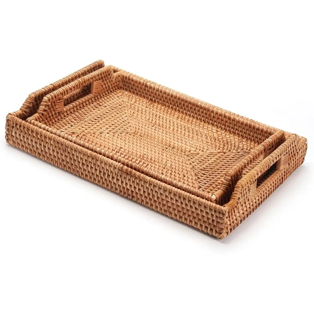 Brinjoy Rectangular Rattan Tray With Handle - 17x11.4x1.8 Inch Woven Basket Tray For Coffee Table, Dining Room & Bathroom Organization