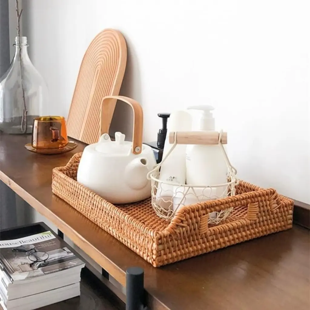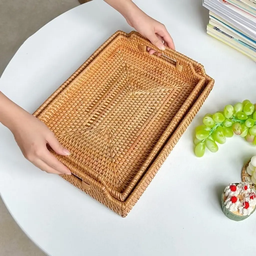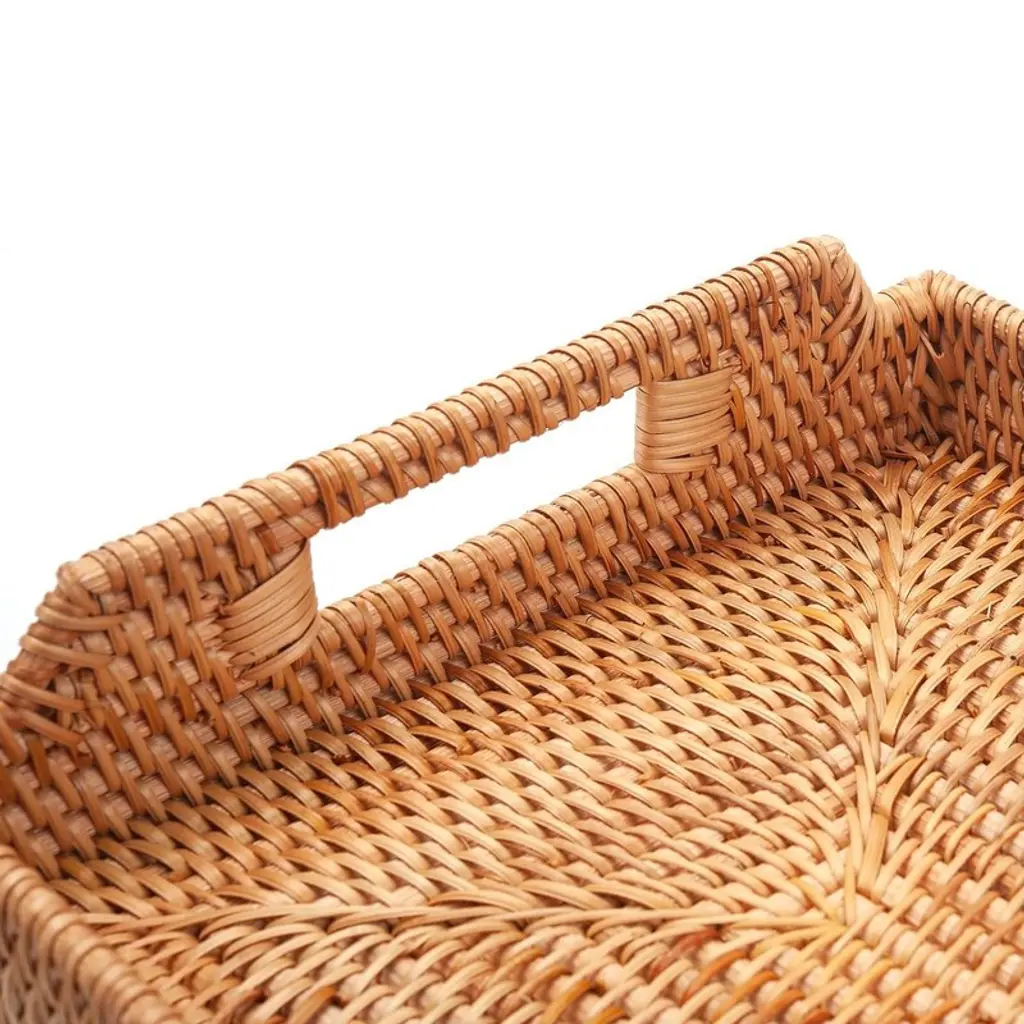 BRINJOY's rectangular woven tray combines artisanal craftsmanship with everyday functionality. Handcrafted from 100% natural rattan, this tray features a textured weave, warm tonal variations, and side handles for easy carrying. Measuring 17" long ¡Á 11.4" wide ¡Á 1.8" deep, it offers a versatile surface for serving snacks, organizing remotes, or displaying decor in living rooms, bedrooms, or kitchens. The lightweight yet durable construction complements bohemian, coastal, and farmhouse styles, while the natural materials bring organic warmth to any space.
