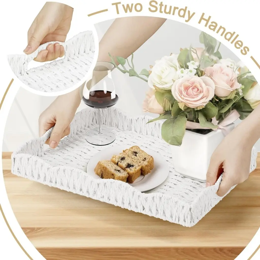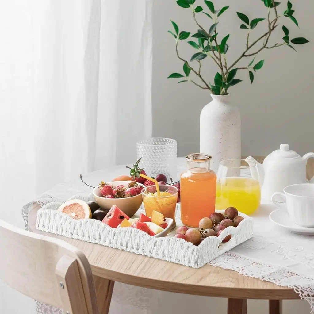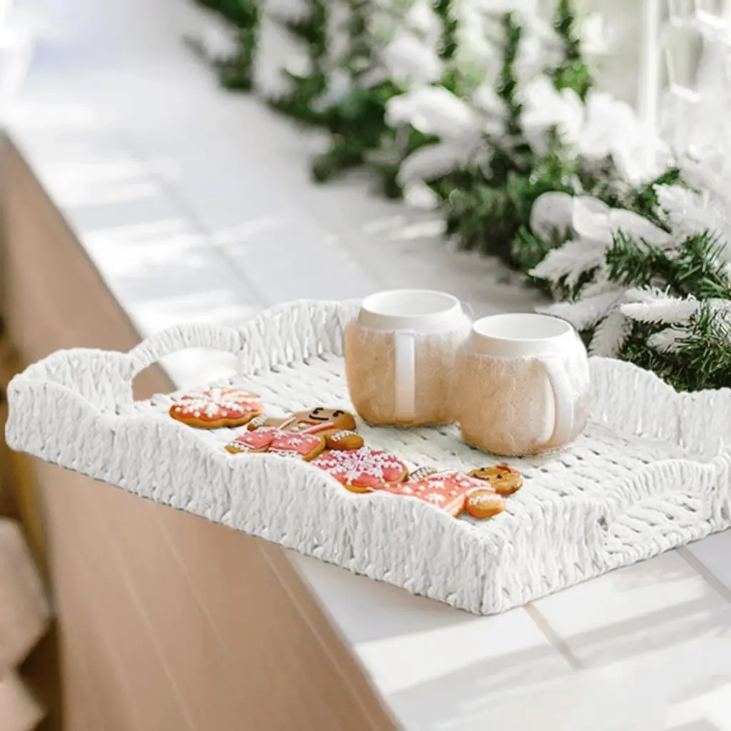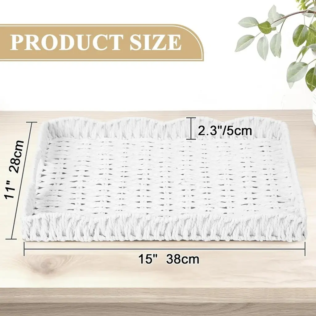 BRINJOY's scalloped-edge rectangular tray combines natural seagrass weaving with a sturdy internal iron frame for lasting durability. Handwoven in a traditional pattern with modern appeal, this tray features softly curved edges and built-in handles for easy carrying. Measuring 15" long ¡Á 11" wide ¡Á 2.3" deep, it offers a generous surface for organizing remotes, serving snacks, or displaying decor while resisting cracks and chips. The crisp white hue and organic texture complement coastal, farmhouse, or bohemian styles, making it ideal for coffee tables, vanities, or kitchen islands.