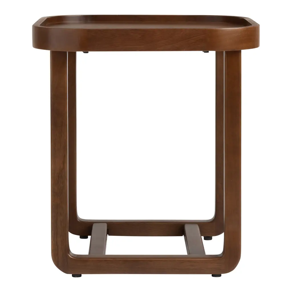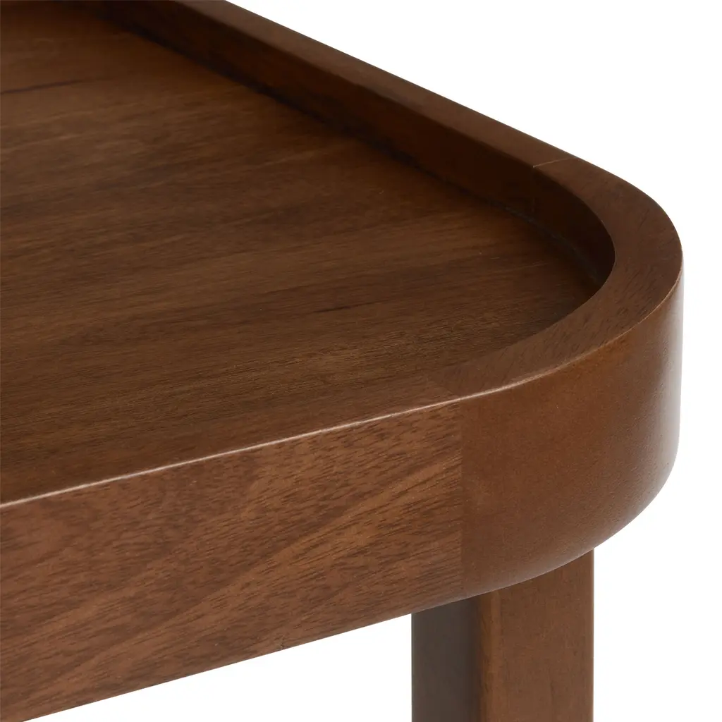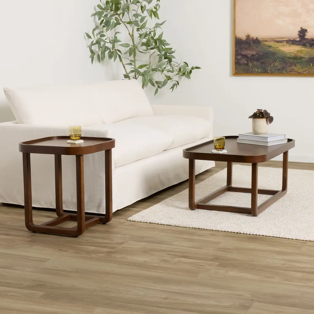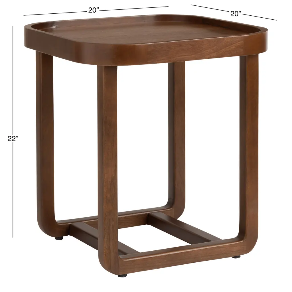 Crafted of solid wood in a deep walnut finish, our Brinley end table harmonizes the airy curves of an open base with the rounded edges of a tray top. The perfect small-space accent table to pair with your sofa or favorite reading chair, its raised edge creates a protective rim for the decor, plants, accessories, or cocktails on its surface. Its modern lines, mid-century finish, and contemporary curves are a cohesive complement for any decor.