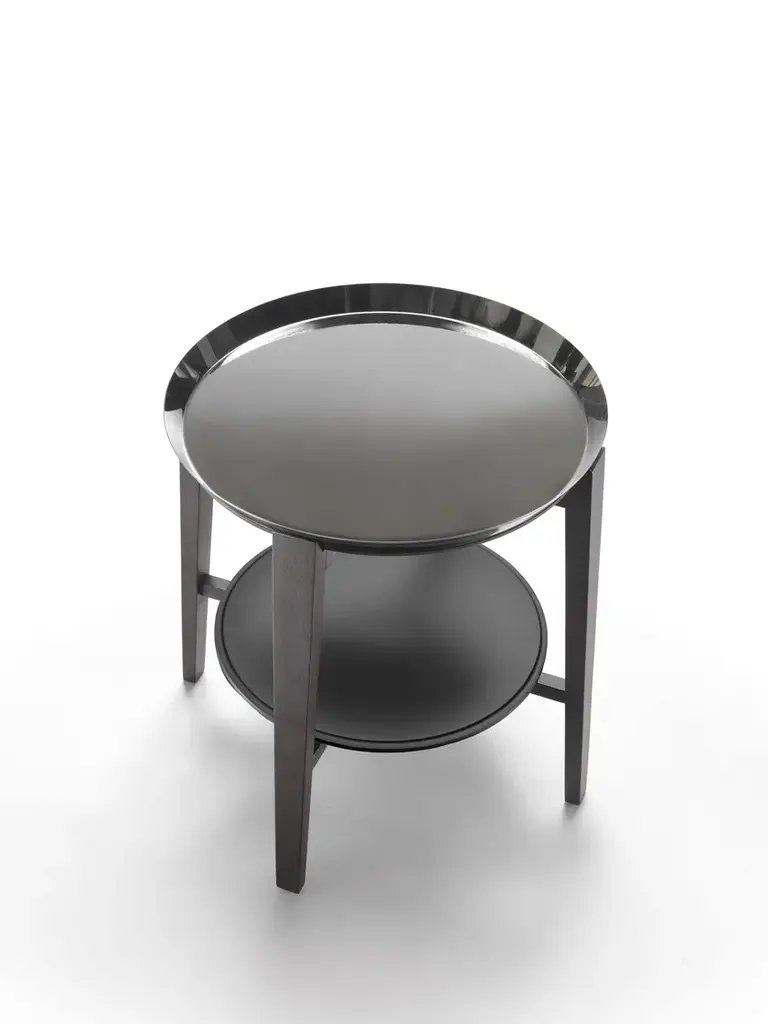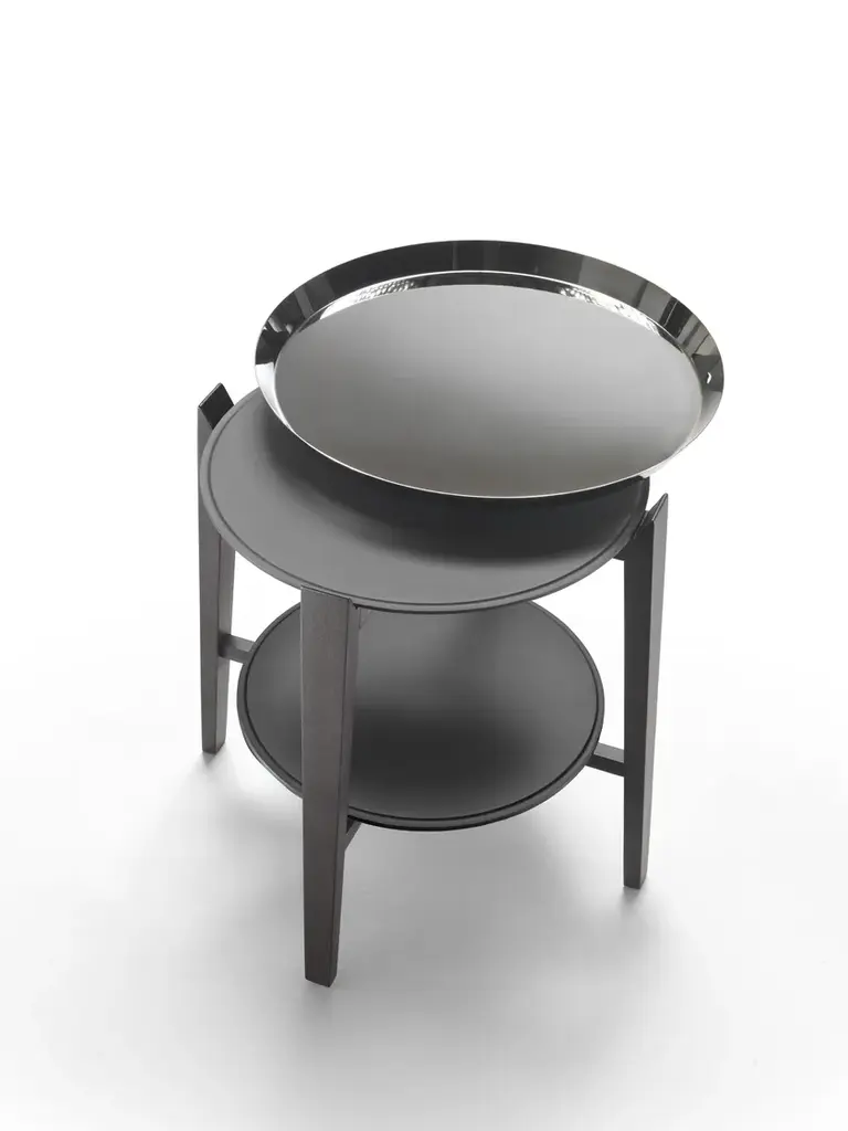 As elegant as it is functional, Cabaré is a side table that fits serenely alongside any of the seating options in the Flexform collection. It has a sophisticated round solid-wood structure – in Canaletto walnut or ash, available in an array of finishes – and two stacked tops in cowhide-clad metal – the lower one can serve as a handy place for books or magazines. The upper top also comes with a removable tray, from which the Cabaré side table derives its name. The metal tray comes in satin, chrome, burnished, black chrome or champagne finish, making Cabaré an authentic multipurpose piece.TECHNICAL SPECIFICATIONSFrame in solid wood canaletto walnut, canaletto walnut extra, canaletto walnut stained coffee. Ashwood natural, stained teak, stained ebony, stained wenge, stained cherry, stained walnut , stained coffee, stained brown Top in metal covered in hide in the following colors: russian red (5008), white (5007), olive (5006), black (5005), dark brown (5004), dark brown extra (5013), grey (5003), sand (5001), tobacco (5015). And removable metal tray in satined, chromed, burnished, black chromed or champagneMATERIALS Frame: wood finishes Top: hide leather - suede - metal finishes
