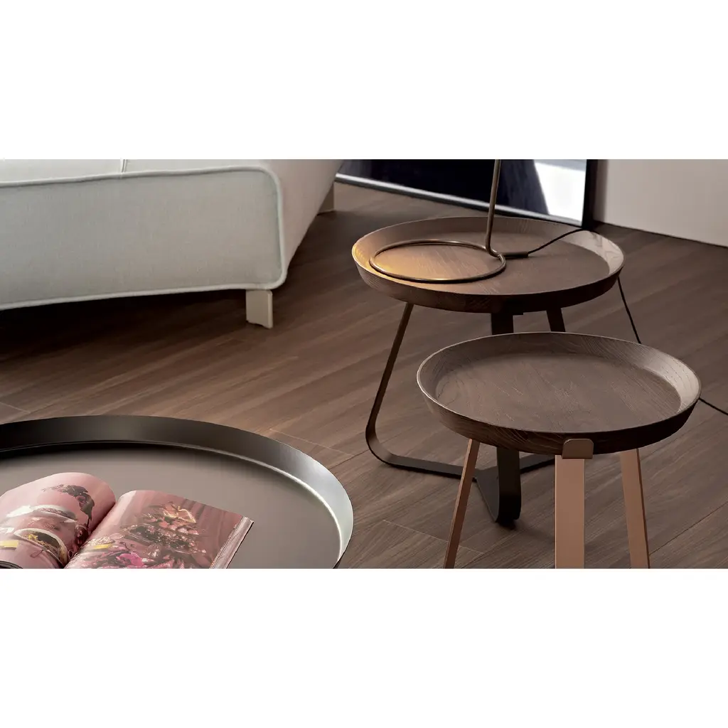 An expressive onomatopoeia that recalls the sounds of cicadas: this is the image that inspired the line of coffee tables by Bonaldo. The geometric, slender and rounded design of the structure makes them lightweight, while a game of balances between sharp corners and rounded angles supports a practical removable tray, an element that can be further embellished with an elegant ceramic top. In the single material version, the effect is of essential elegance and functionality; in the version with the ceramic top, the contrast between the two materials adds further character. Frinfri modern round wooden coffee tables are available in three different heights and all models are available in multiple colour variants, thus making it possible to choose the one that is most suitable to individual stylistic needs. The Frinfri modern wood coffee table variant features a wooden top and is available in two sizes (high and medium).
