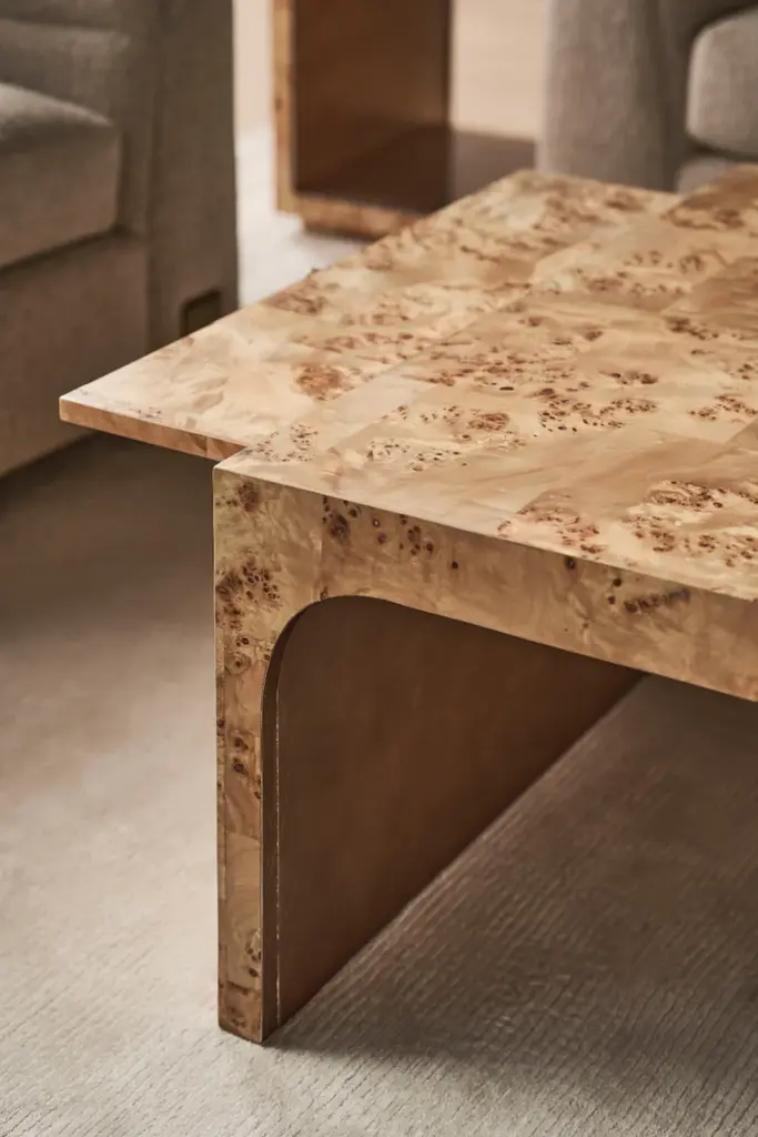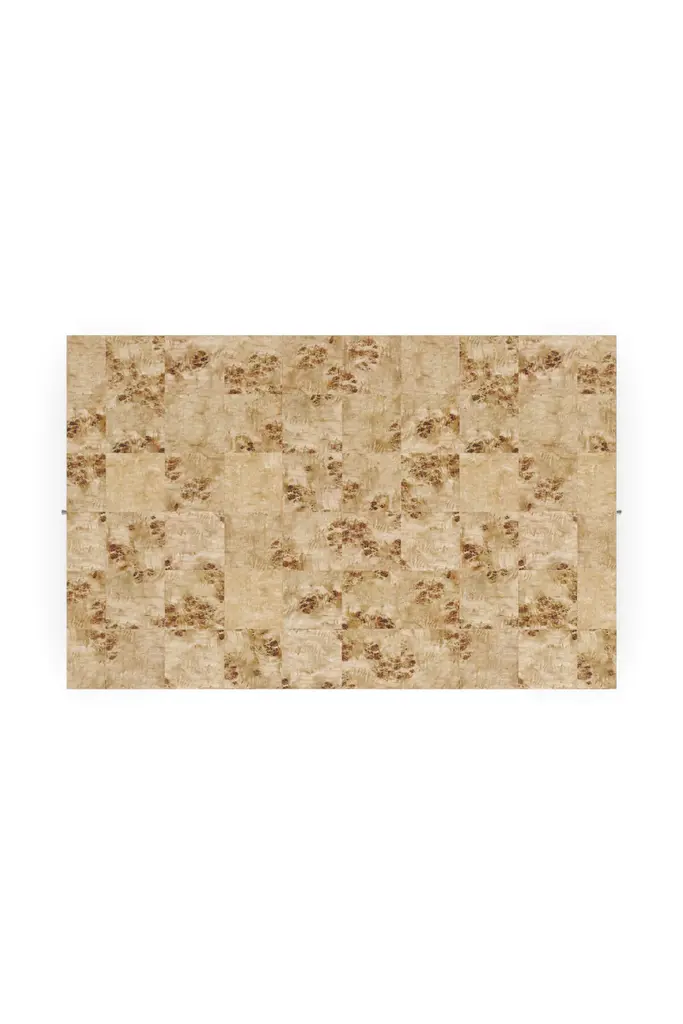 Classic in form and material, this multifunctional cocktail table makes an organic yet glamorous statement. Crafted from exotic mappa burl veneers, intricately pieced to showcase its highly figured, swirling grain. A Brazen bronze leaf finish underneath adds warm contrast and a soft glow. Features two pull-out trays on either end to extend the top surface when entertaining guests.