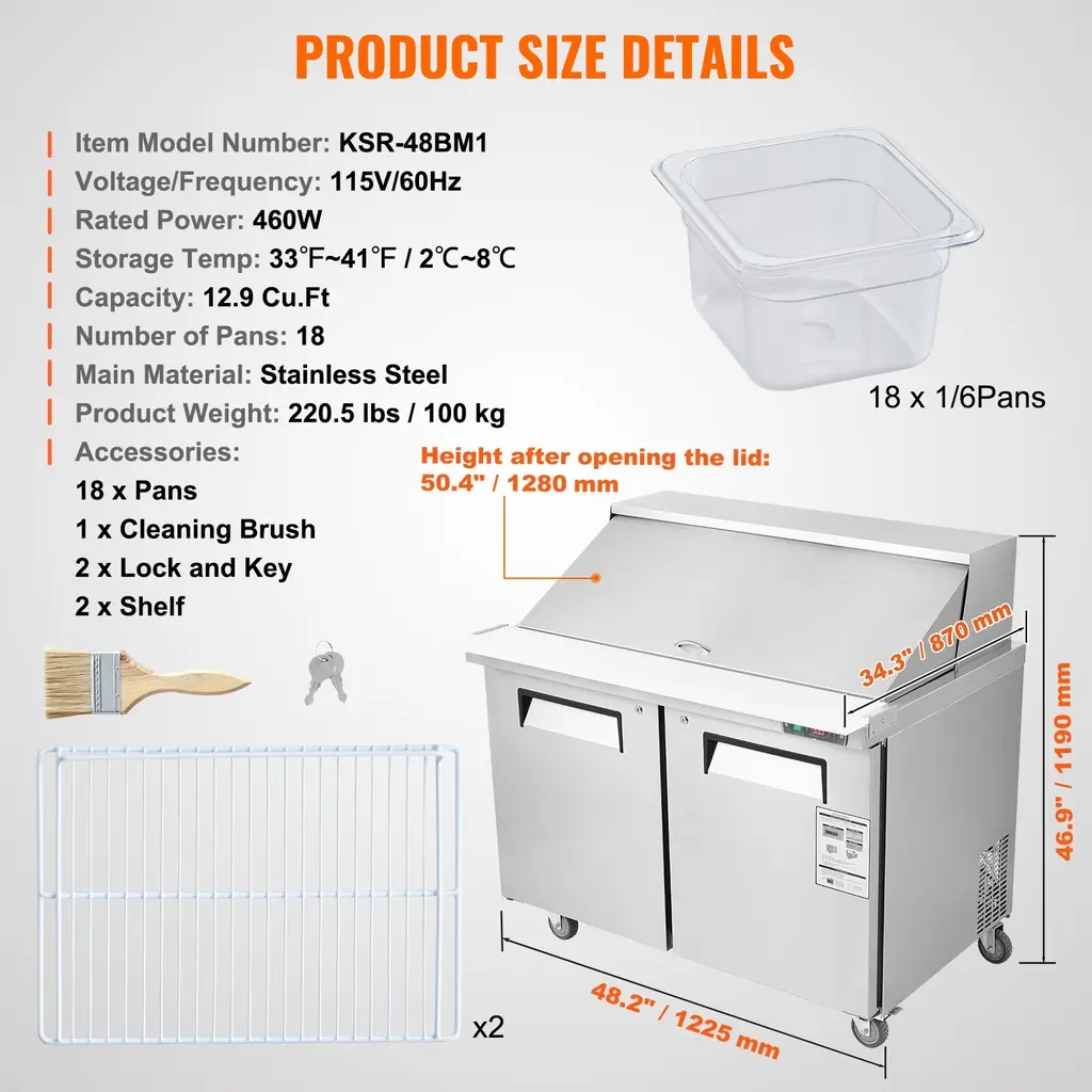 7.4 Cu.Ft/16.4 Cu.Ft/12.9 Cu.Ft Capacity: This large-capacity refrigerated prep table features a digital control screen to maintain internal temperatures between 33-41°F / 2-8°C. Adjustable shelves allow for dual-zone storage, and internal lighting makes it easier to access and organize items. Spacious Work Surface: Equipped with a 8.3" / 210mm wide removable cutting board, providing ample space for making sandwiches and 14-inch pizzas. The open shelving includes 9 x 1/6 pans and 3 x 1/9 pans, made of food-grade PC material that is easy to clean.Rapid Cooling: The unit features a branded compressor and finned copper tubing for consistent and even cooling, ensuring long-lasting freshness for your ingredients. The cabinet door is insulated with a foam layer and closes automatically within a 75° angle without needing to be pushed, enhancing food preservation and energy efficiency. High-Quality Materials: Constructed with stainless steel, the body is durable and resistant to corrosion. The evaporator uses electrophoretic coating with anti-rust paint to protect the welds from corrosion and prevent refrigerant leakage. The bottom is equipped with pre-installed anti-slip brake casters for easy movement, and a cleaning brush is included for removing dust from the evaporator. Use with Peace of Mind: This sandwich prep table is designed with security in mind, featuring overload protection that automatically shuts down the unit during abnormal use. The insulated button design significantly reduces the risk of electric shock. Package Content 1 x Refrigerated Prep Table 12/16/18 x Pan 1 x Cleaning Brush 2 x Lock and Key 1 x Shelf