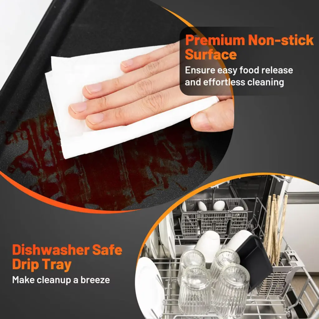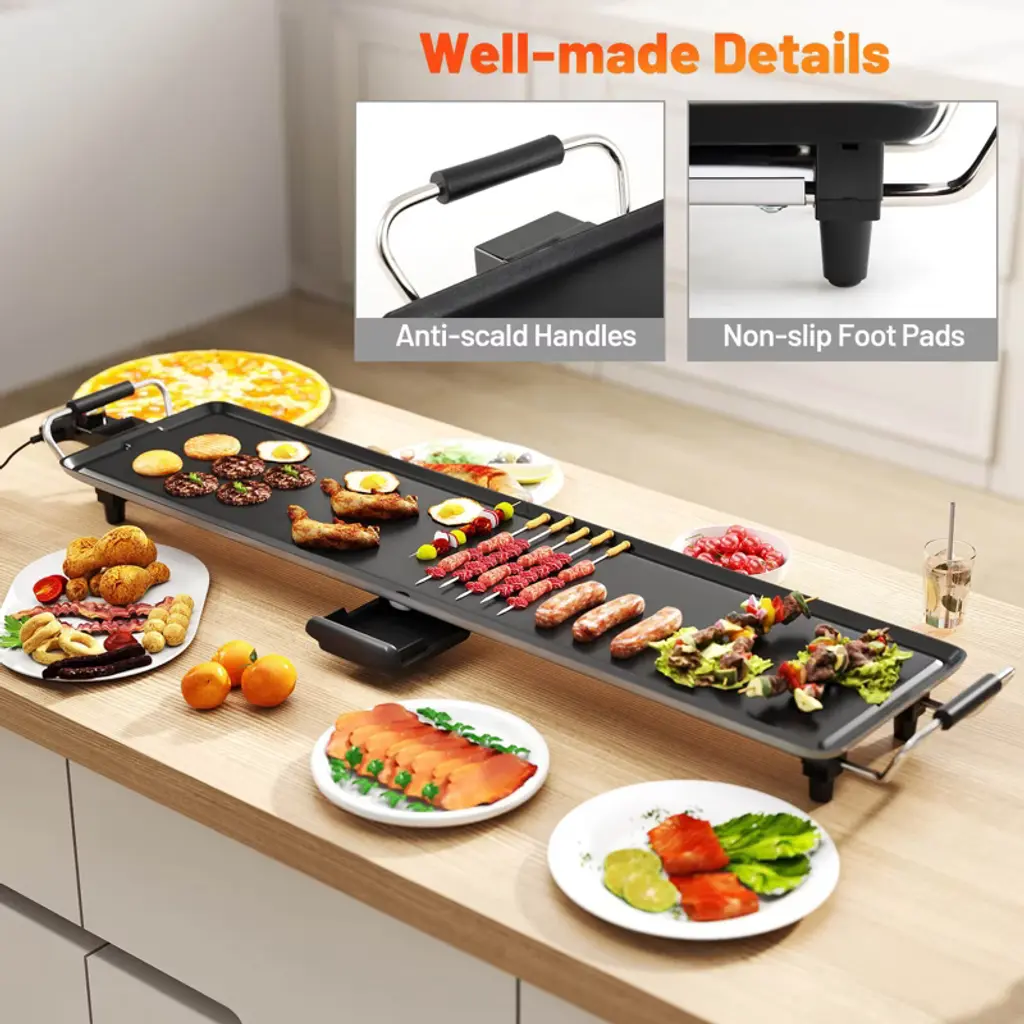Entertain your family and friends with our electric griddle! With dimensions of 35" × 9"/39.5" × 9", the expansive cooking surface easily accommodates 8-10/10-12 people, featuring a nonstick coating to ensure easy cleaning after use. The teppanyaki grill offers 4 adjustable temperature settings ranging from 200 to 425°F, allowing for versatility in cooking a variety of dishes. Made from die-casting aluminum, this long griddle is reliable and efficient, designed with a built-in thermostat for quick heating. The tabletop BBQ grill is perfect for both indoor and outdoor use, whether for family gatherings, BBQ parties, and outdoor excursions. Safety is a top priority with overheat protection, as well as UL and ETL certifications, providing peace of mind while you cook up a storm.FeaturesSuitable for different foods with 4-level adjustable temperatures Built-in thermostat keeps the set temperature stable for even heating Controller with a UL-certified plug and power indicator light for easy operation Entertain 8-10/10-12 people thanks to a 35" × 9"/39.5" × 9" non-stick grilling surface Die-casing aluminum material promises long-lasting service time Simple to move and secure to use with anti-scalding handles Slide-out drip tray and 6 wooden spatulas for added convenience Non-slip foot pads provide enhanced stability on the tabletop Ideal for the family gathering, barbecue party, RV trip and campingColor: Black Material: Die-casting Aluminum Product Dimensions: 41.5" × 9.5" × 4"/46" × 9.5" × 4" (L x W x H) Sizes of Cooking Area: 35" × 9"/39.5" × 9"(L x W) Length of Power Cord: 3 ft Net Weight: 6/8 lbs Power: 1400W Voltage: 120V Frequency: 60Hz Current: 11.6A Package Includes: 1 × Electric Griddle 1 × Power Cord 2 × Egg Rings 6 × Wood Spatulas 1 × Instruction