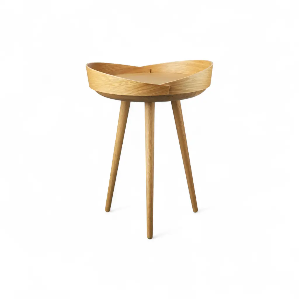 The D106 Bakketop Tray Table brings a sculptural touch to everyday living. Designed by Philip Bro, it plays with soft curves and precise joinery to create a piece that feels both grounded and light. Raised edges form a subtle tray, offering a practical surface for drinks, books, or bedside essentials. Supported by three tapered legs, the table stands confidently on its own yet fits easily into small spaces. Originally created for Denmark’s Cabinetmakers’ Autumn Exhibition, the Bakketop table shows an artisan’s care for detail while embracing the simplicity of good design.