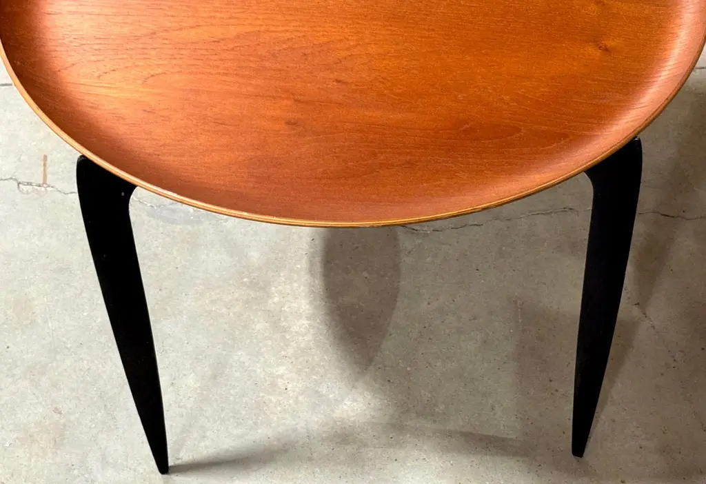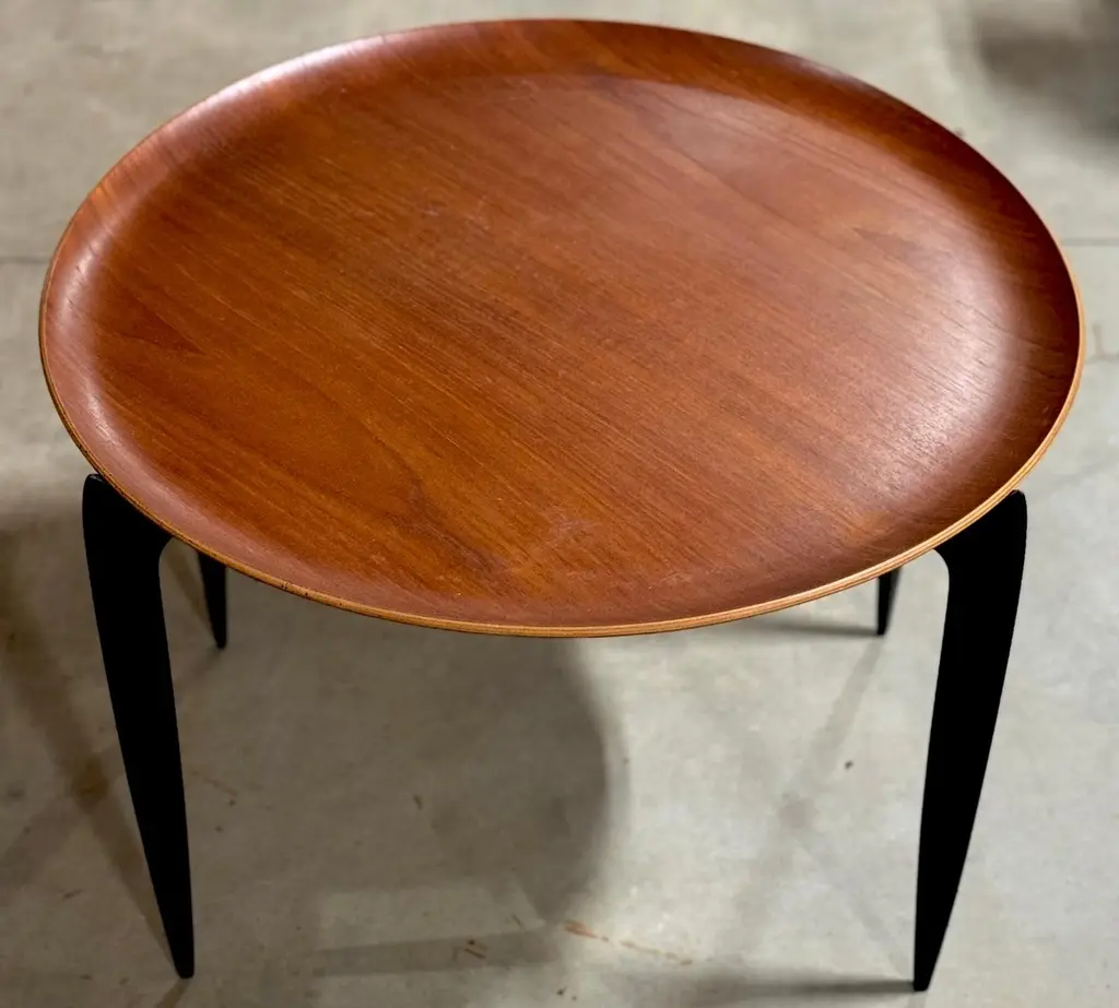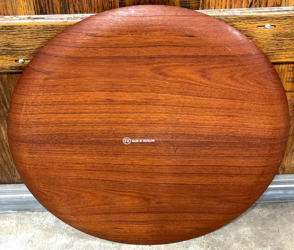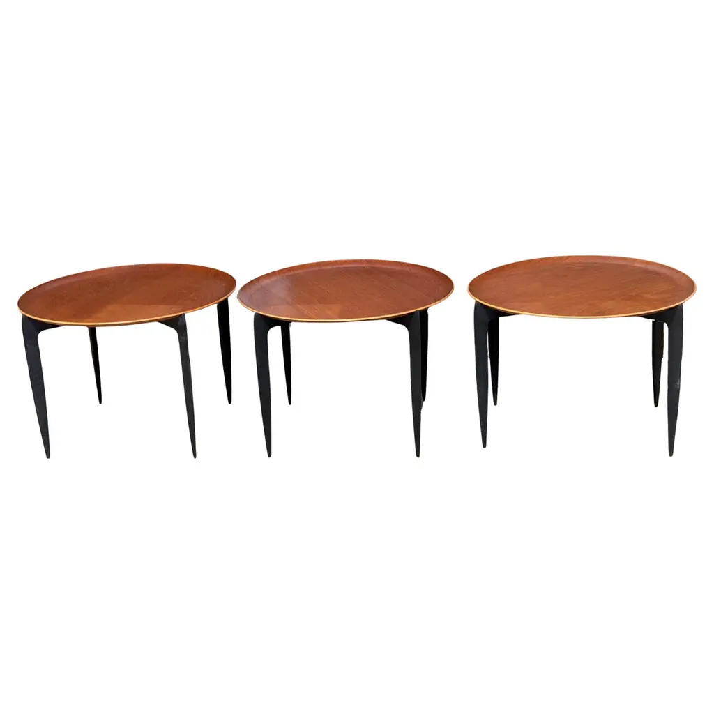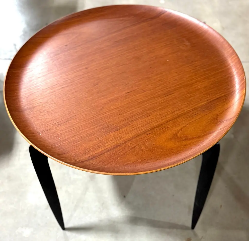Danish Teak & Ebonized Circular Campaign Tray Tables by Fritz Hansen Denmark, 1960s, Sold Individually This is a rare opportunity to acquire up to three iconic Danish Teak & Ebonized Circular Campaign Tray Tables by Fritz Hansen, Denmark, 1960s. Designed with versatility and timeless elegance, these tables serve beautifully as end tables, coffee/cocktail tables, or accent pieces, whether used individually, as a pair, or as a floating trio in a cohesive setting.Crafted in the campaign style, each table is constructed in two parts: a rimmed, book-matched teak tray top, measuring 23.5 inches in diameter, and a sculptural blackened folding wood base. The combination of warm teak grain and contrasting ebonized legs exemplifies Danish modern craftsmanship, offering both functionality and refined aesthetics. Standing at 16.75 inches high, these tables maintain a sleek and low-profile silhouette, making them ideal for a variety of interiors.Perfect for flexible arrangements and easy mobility, these tables can be used as stylish side tables or impromptu serving trays, adapting effortlessly to any living space.Sold individually, with three tables available at the time of listing, this is a sought-after Fritz Hansen design, ready to place and use, bringing Scandinavian sophistication and mid-century design to any interior.Price is per table.Overall Measurements:23.5 inches in diameter x 16.75 inches high
