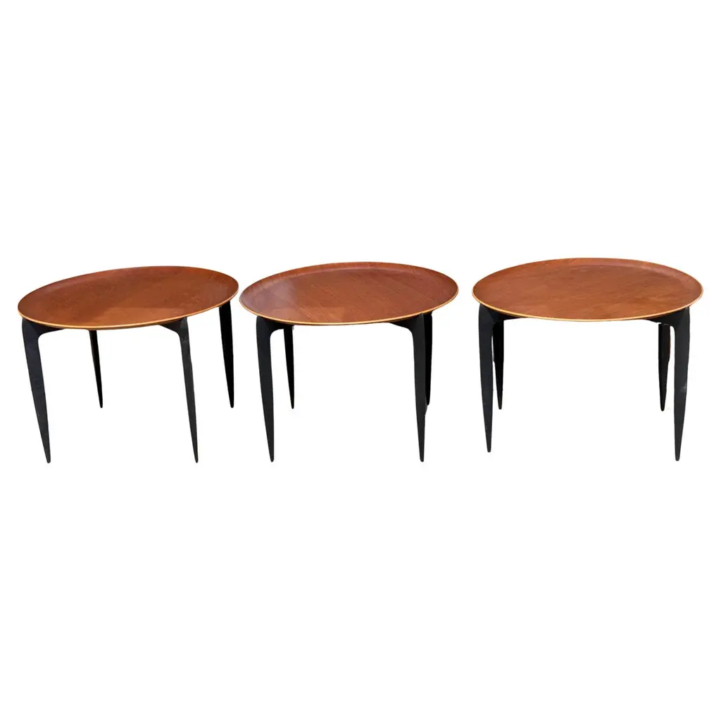 Danish Teak & Ebonized Circular Campaign Tray Tables By Fritz Hansen