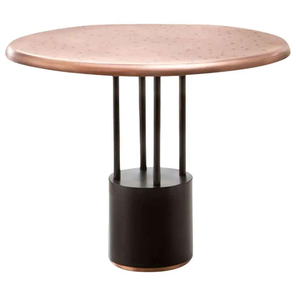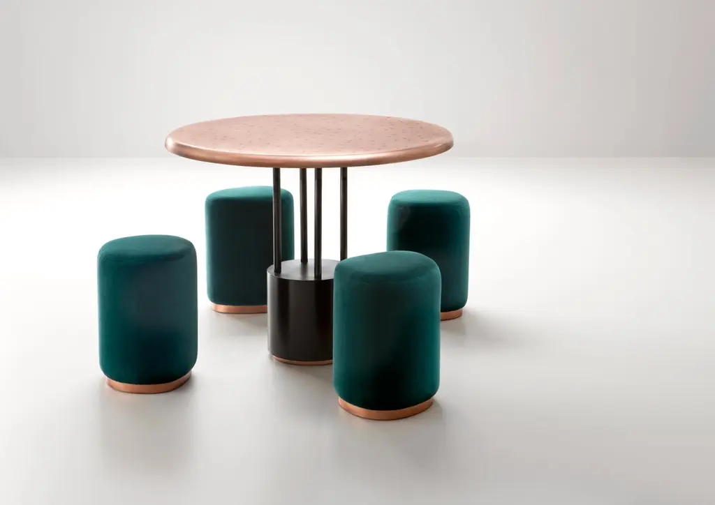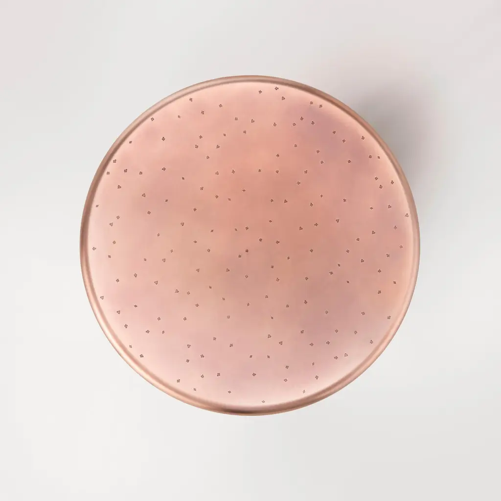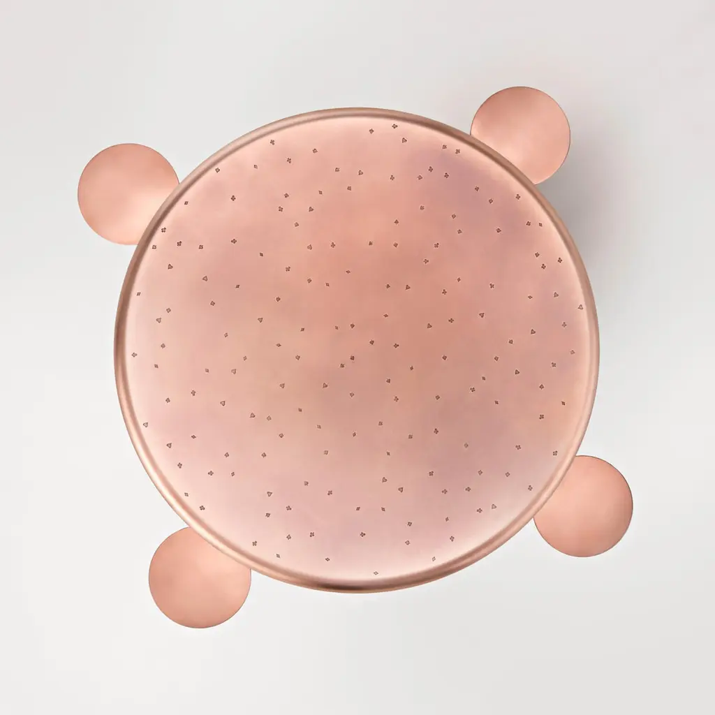 This games table is a throwback to yesteryear with a refined allure, which takes on a whole new value as we find ourselves with increased leisure time at home. The round table top in natural fire-treated copper is characterised by the distinctive DeErosion finish, made even more special by the playful inclusion of the suits of the different playing cards. Four small serving trays can be extracted from beneath the table top when needed, for placing playing cards or a glass. The table is rounded off with four organically-shaped stools, featuring a copper base and seat with velvet upholsteryAdditional Information:Materials: CopperFinish: Brushed copper M10Dimensions: Ø 95 x H 76 cmAvailable in other finish options: Natural brushed copper M10N
