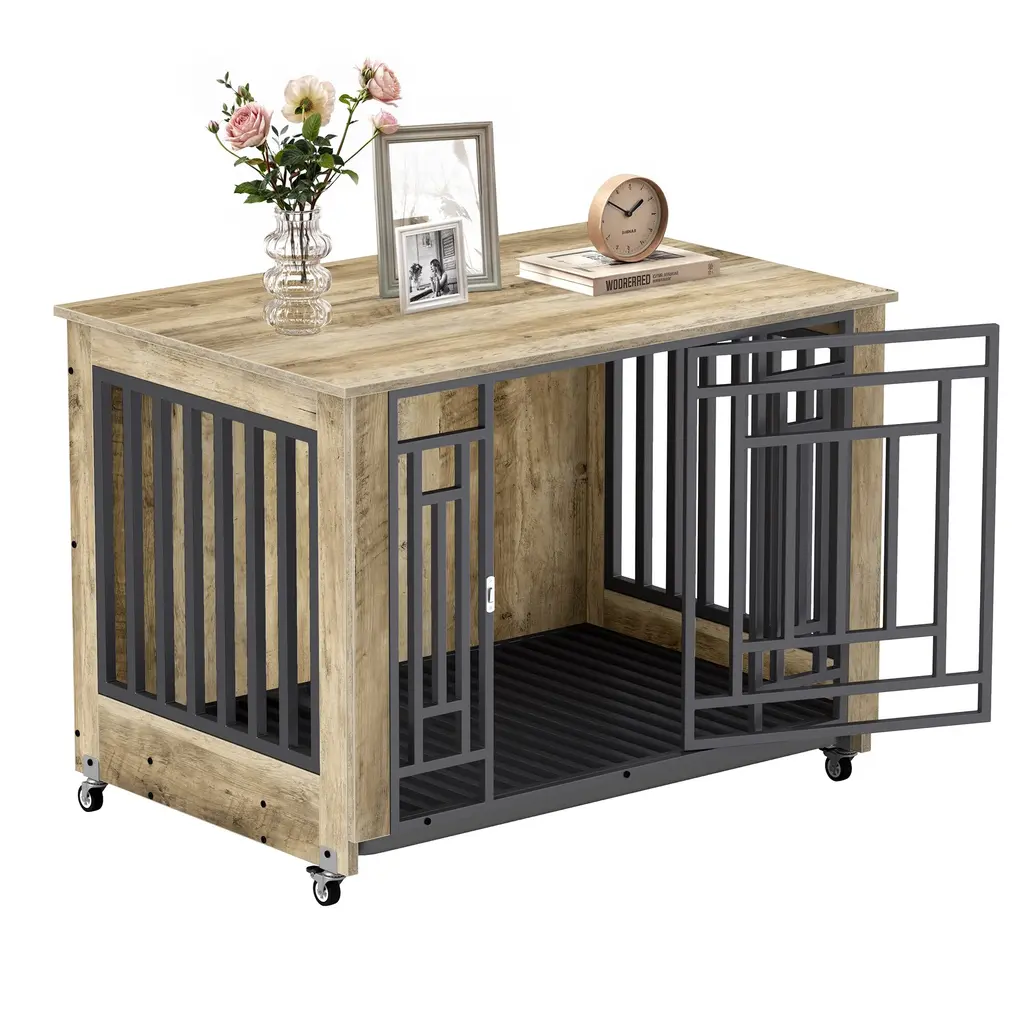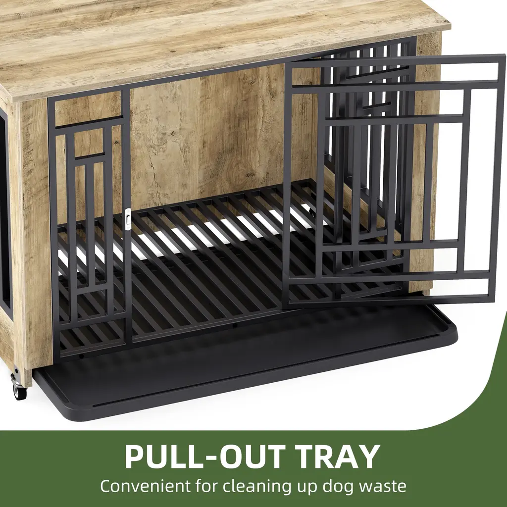Dog Crate 32"/36" Furniture Wooden Side End Table With Wheels And Tray - 38" - Grey