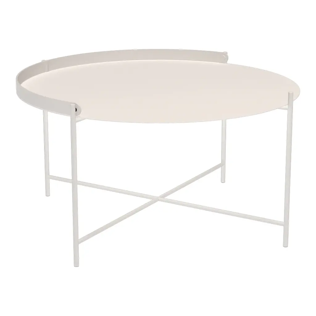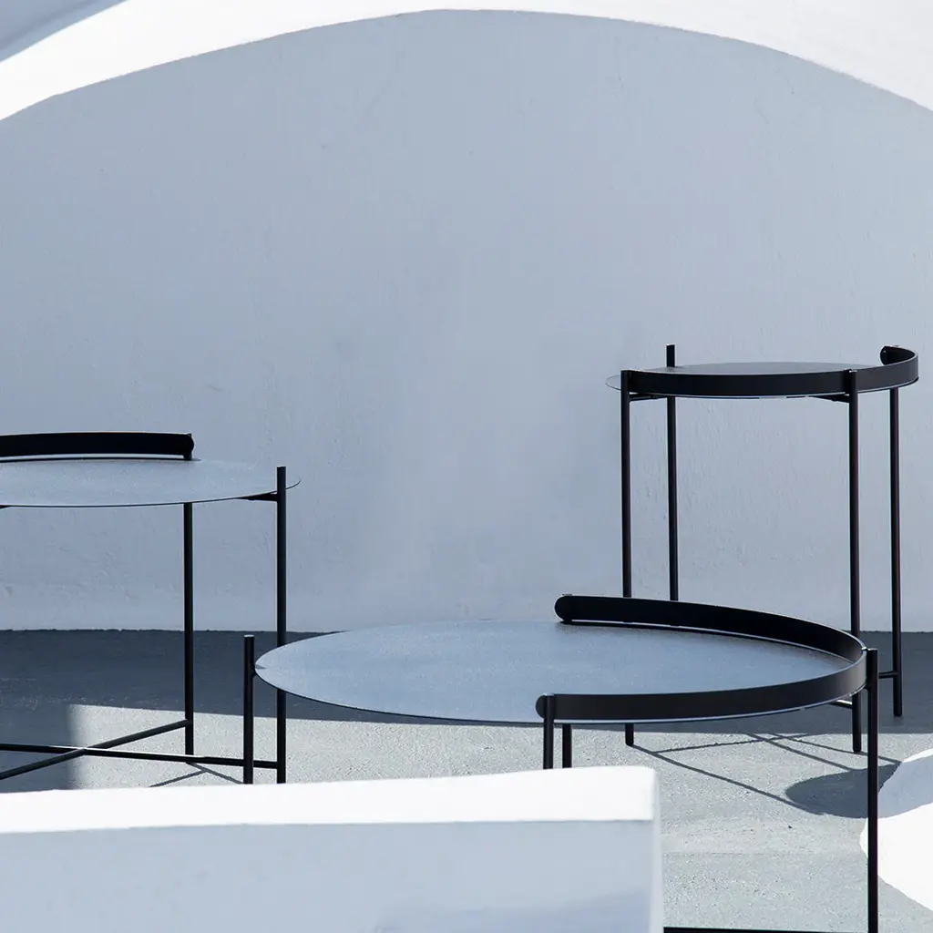 EDGE tray table is suitable for both indoor and outdoor use. The half ring shaped handle makes it easy to move the table between the living room and the garden, and when laid down it functions as a table edge making sure everything stays in place.