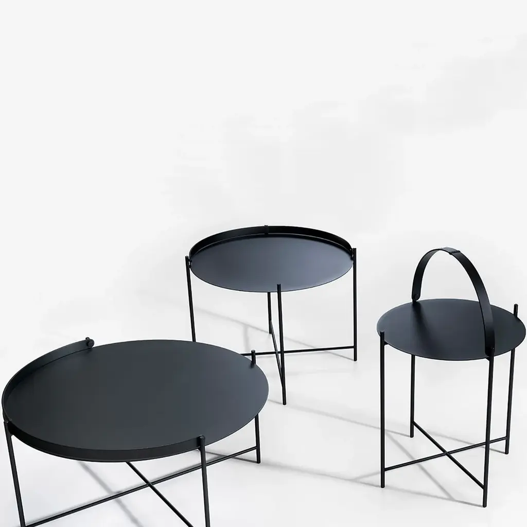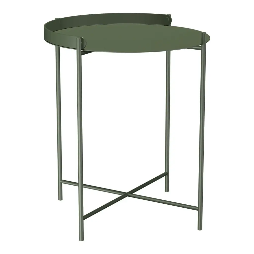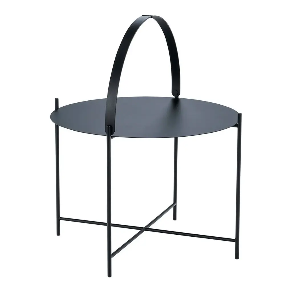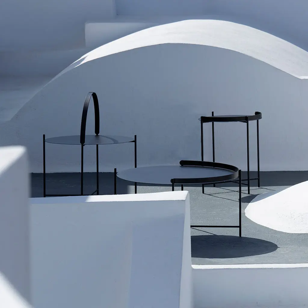 EDGE tray table is suitable for both indoor and outdoor use. The half ring shaped handle makes it easy to move the table between the living room and the garden, and when laid down it functions as a table edge making sure everything stays in place.