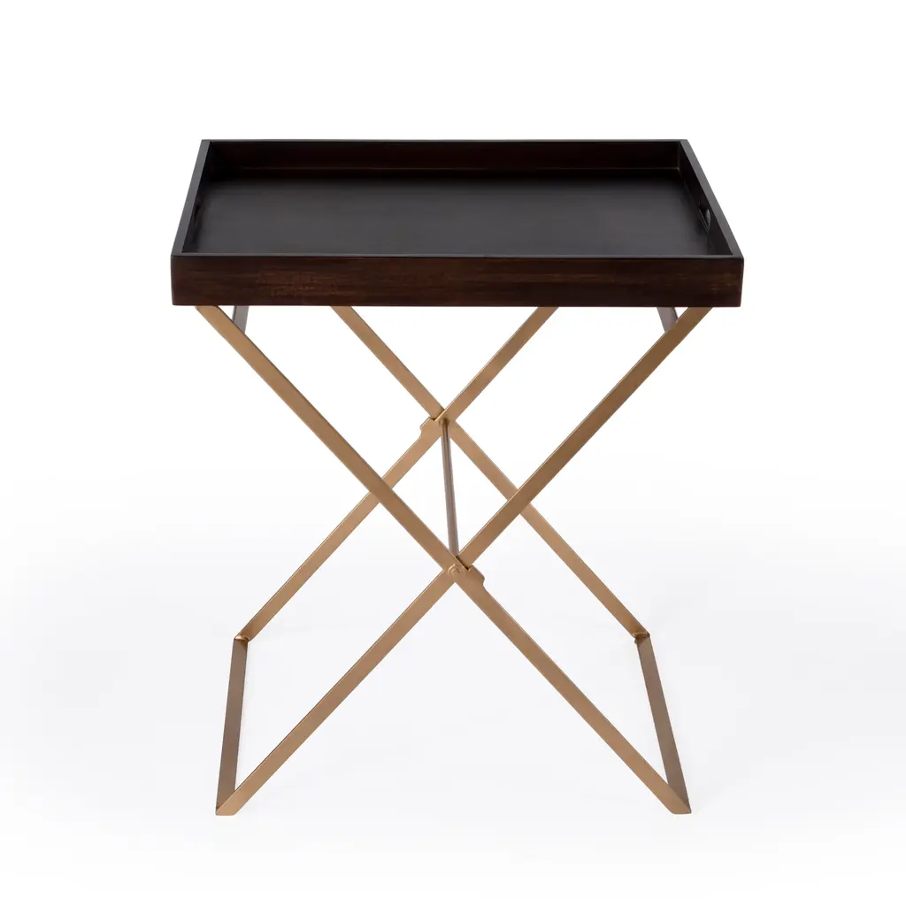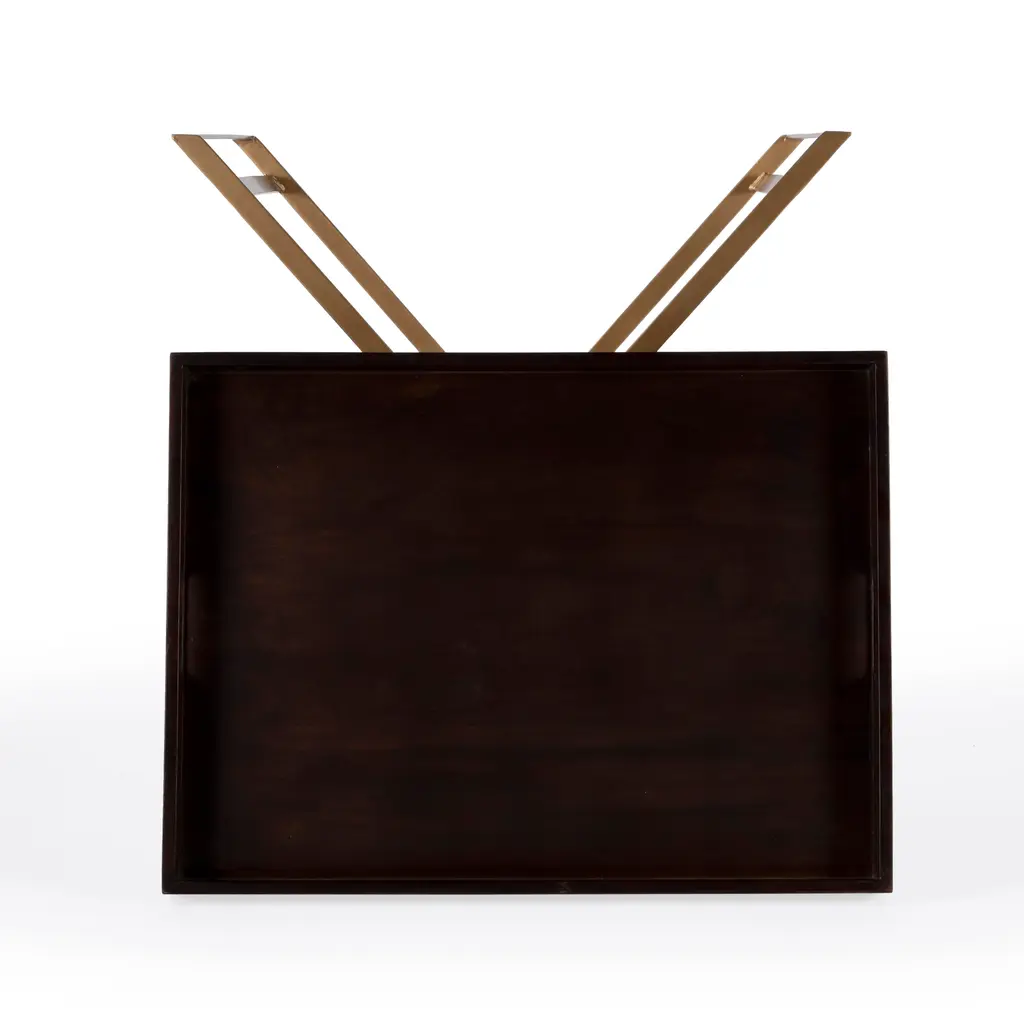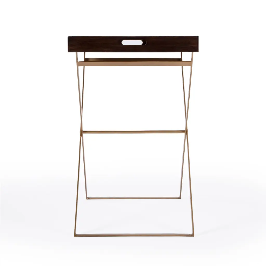 This tray table works wonderfully for many purposes whether it's a side table, end table, or bar tray table. The tray can be easily lifted off the base for multi-purpose use and the legs can collapse for easy storage. Bring this piece out for drinks and snacks when guests are over, or keept it out as an everday side table. The metal legs are finished in a bright gold that pairs perfectly with the rich brown of the tray top. Durably Constructed With: Mango Wood Solids, Iron Product Construction Features: Finish Distressing Product Assembled Measurement & Weight: 27.0" H x 23.75" W x 17.75" D -- 14.9 lbs. 55.11 lbs. Suggested weight capacity Item Arrives: Needs Assembly Photo may slightly differ from actual item in terms of color/finish due to the lighting during photo shoot or the monitor's display.