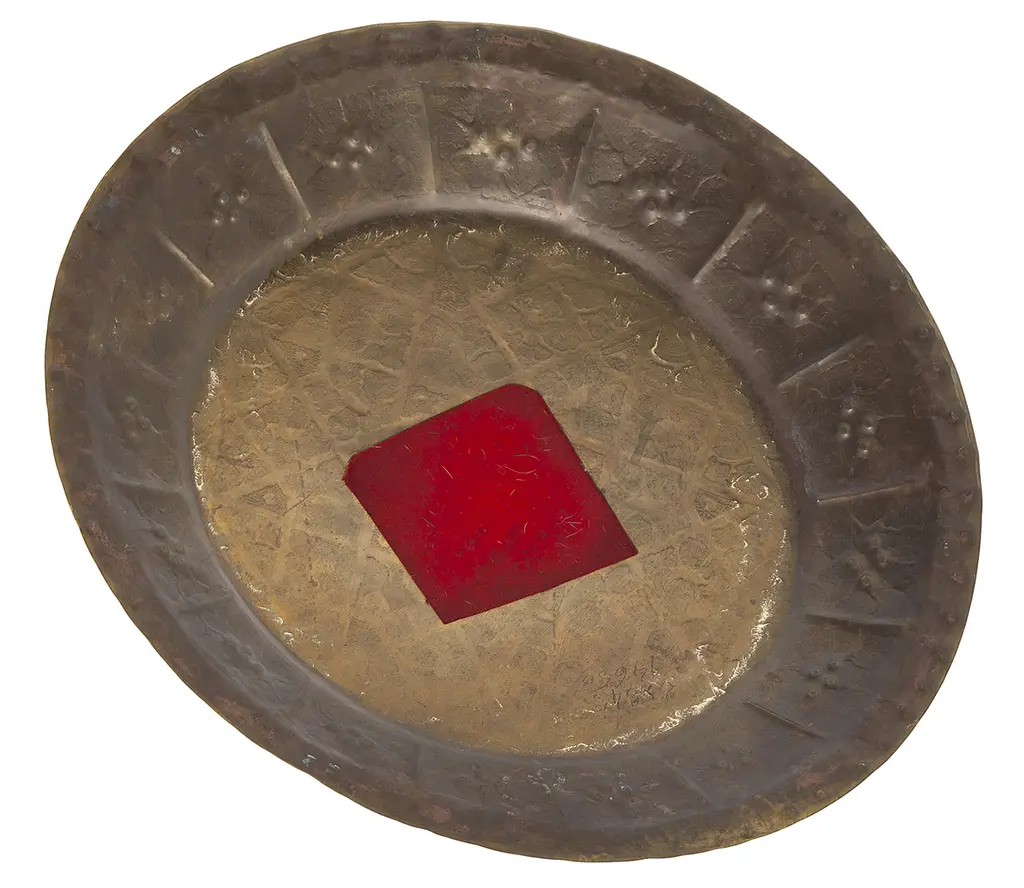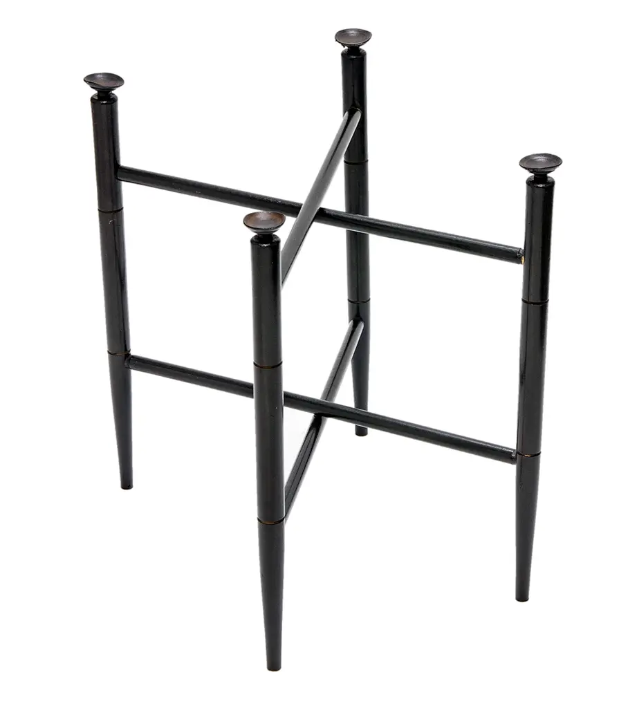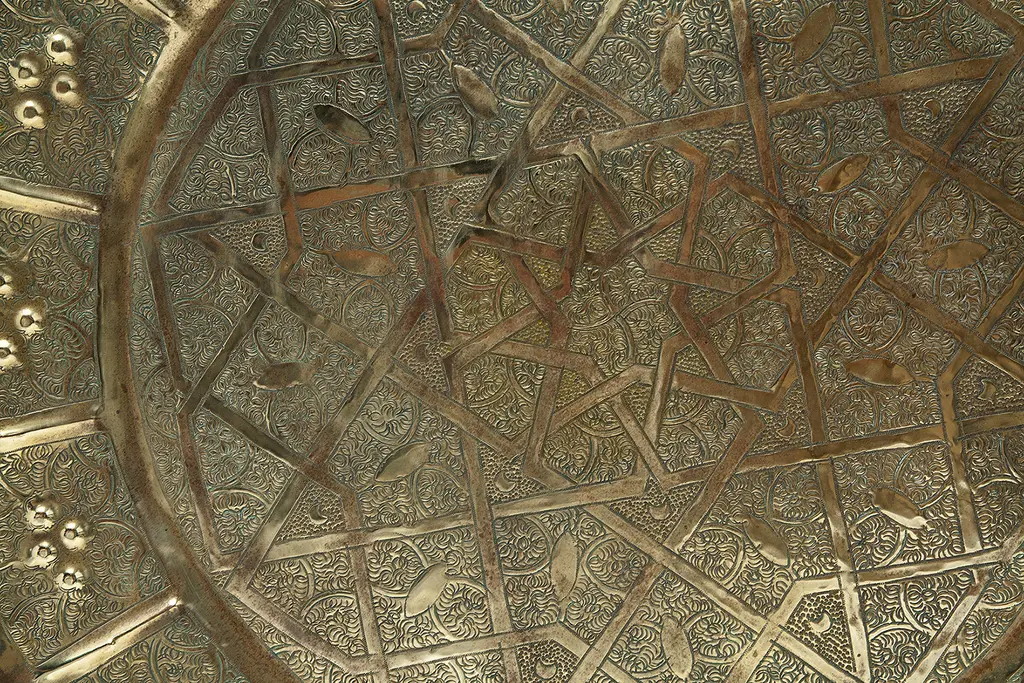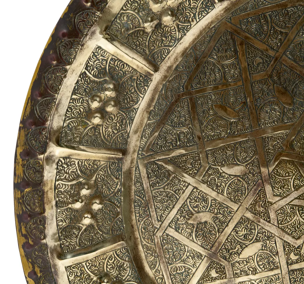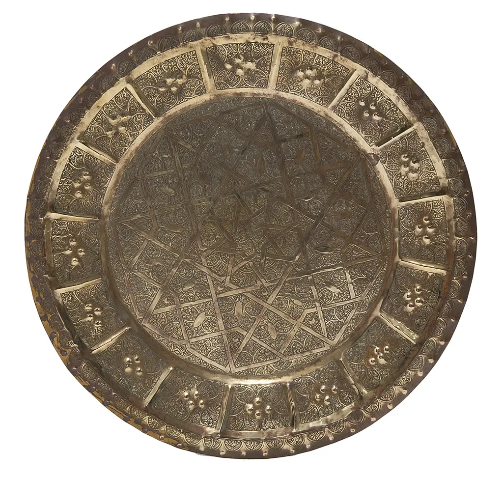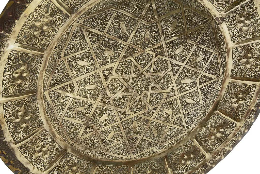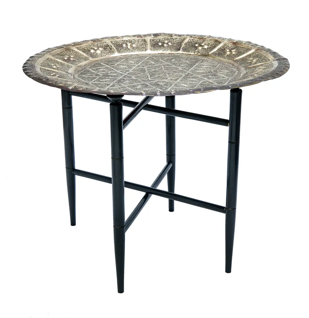 Engraved brass tray table with hand tooled brass tray top in an intricate geometric pattern. The ebony, teak base is accented with gold and folds flat when needed.