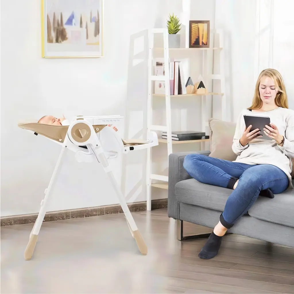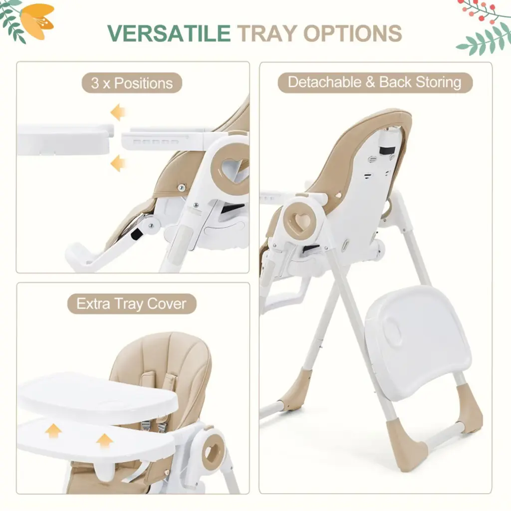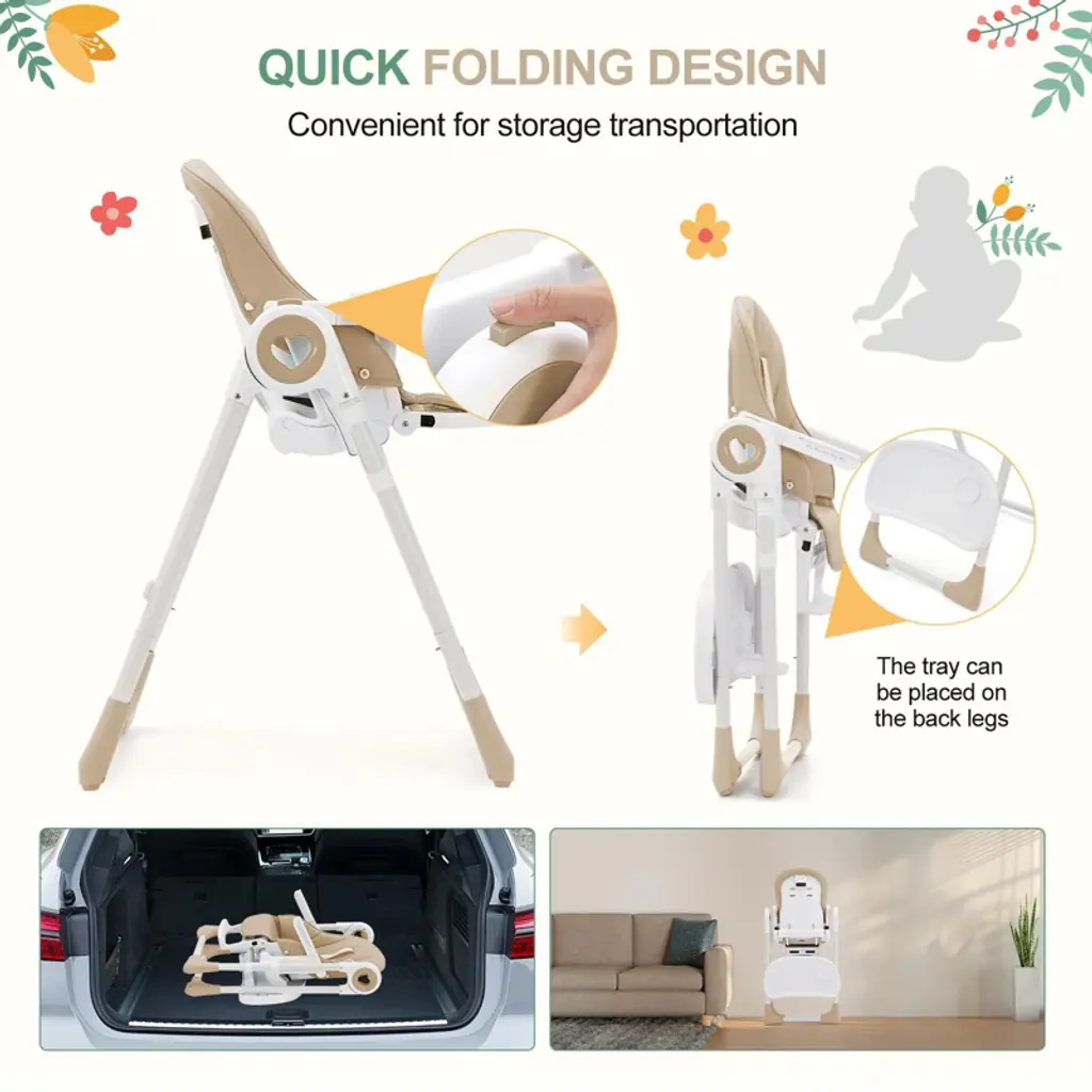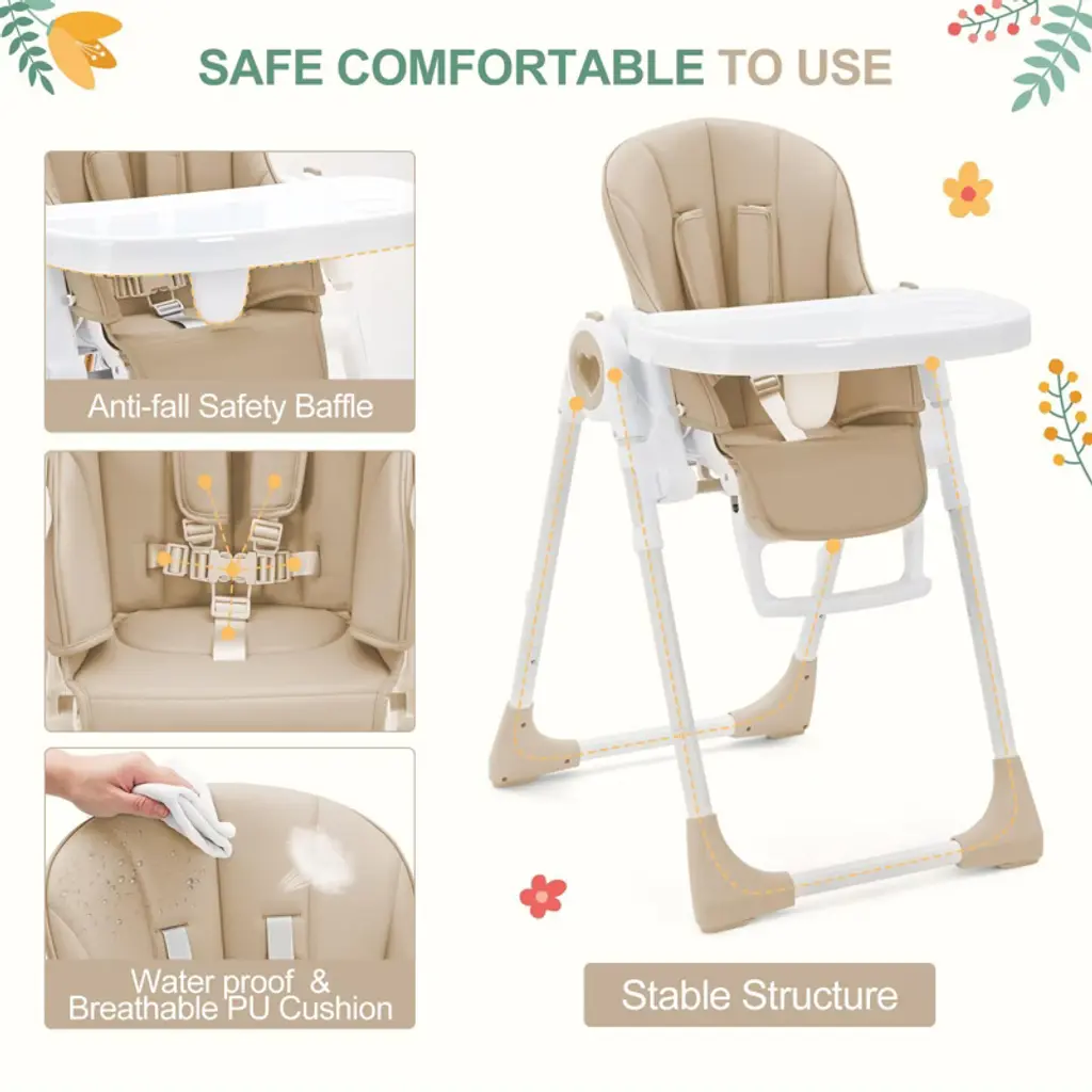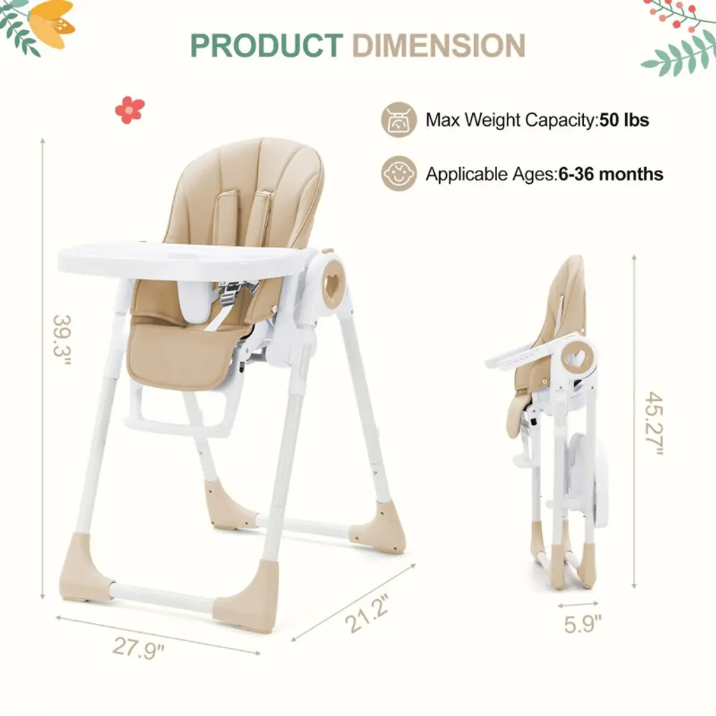 Foldable High Chair for Babies and ToddlersLooking for a high chair that adapts to every stage of your child's growth? What if mealtimes, play, and clean-up could all be simpler and safer—no matter where life takes you? Ready to upgrade your parenting routine?Highlights at a Glance:adjustable high chair for toddlersfoldable and portable baby chaireasy-to-clean convertible seatsecure 5-point harness systemmulti-position tray and footrestgrows with your childSpecification:Color: Dutch Green/ Champagne/ GreyProduct Dimension: 21.2" D x 27.9" W x 39.3" HFoldable Size: 5.9" D x 27.9" W x 45.3" HMaximum Weight Recommendation: 50 PoundsPacking List:1 x Baby High Chair1 x Accessory Kit1 x Instruction ManualFriendly Note:Always use the high chair under adult supervision.Ensure the harness is securely fastened before each use.Regularly check for loose parts or damage before use.Clean all surfaces thoroughly before and after feeding.