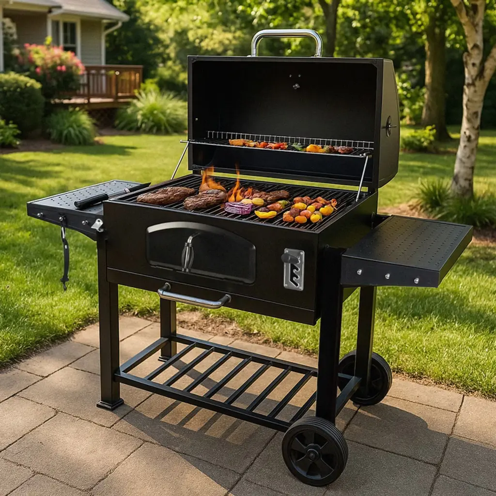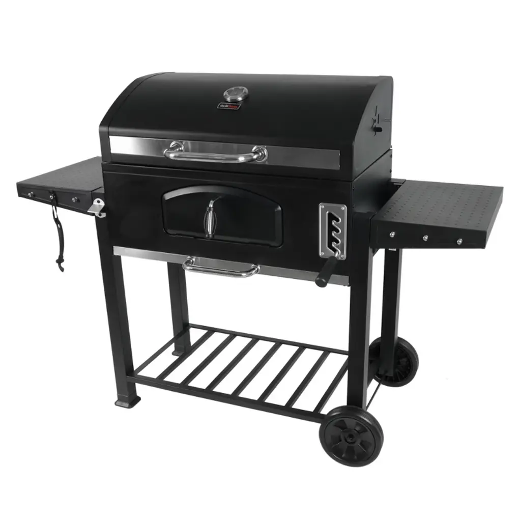 Grill Boss 32” Steel Charcoal Bbq Grill And Side Shelves, Front Access Door, Adjustable Charcoal Tray, Built In Thermometer, Large Cooking Area, Black
