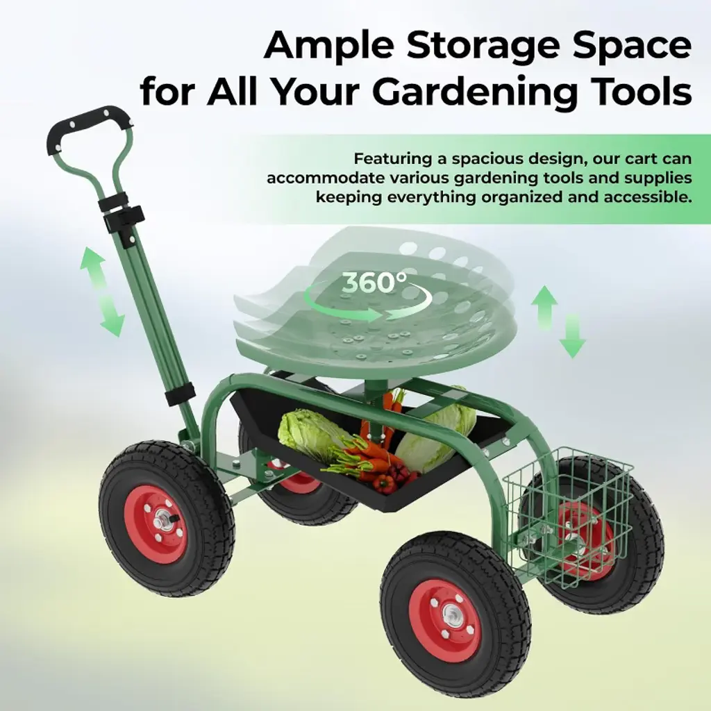 Heavy-duty Rolling Garden Cart With Swivel Seat & Tool Tray,all-terrain Wheels, Adjustable Height,for Planting, Weeding, And Yard Work,steel