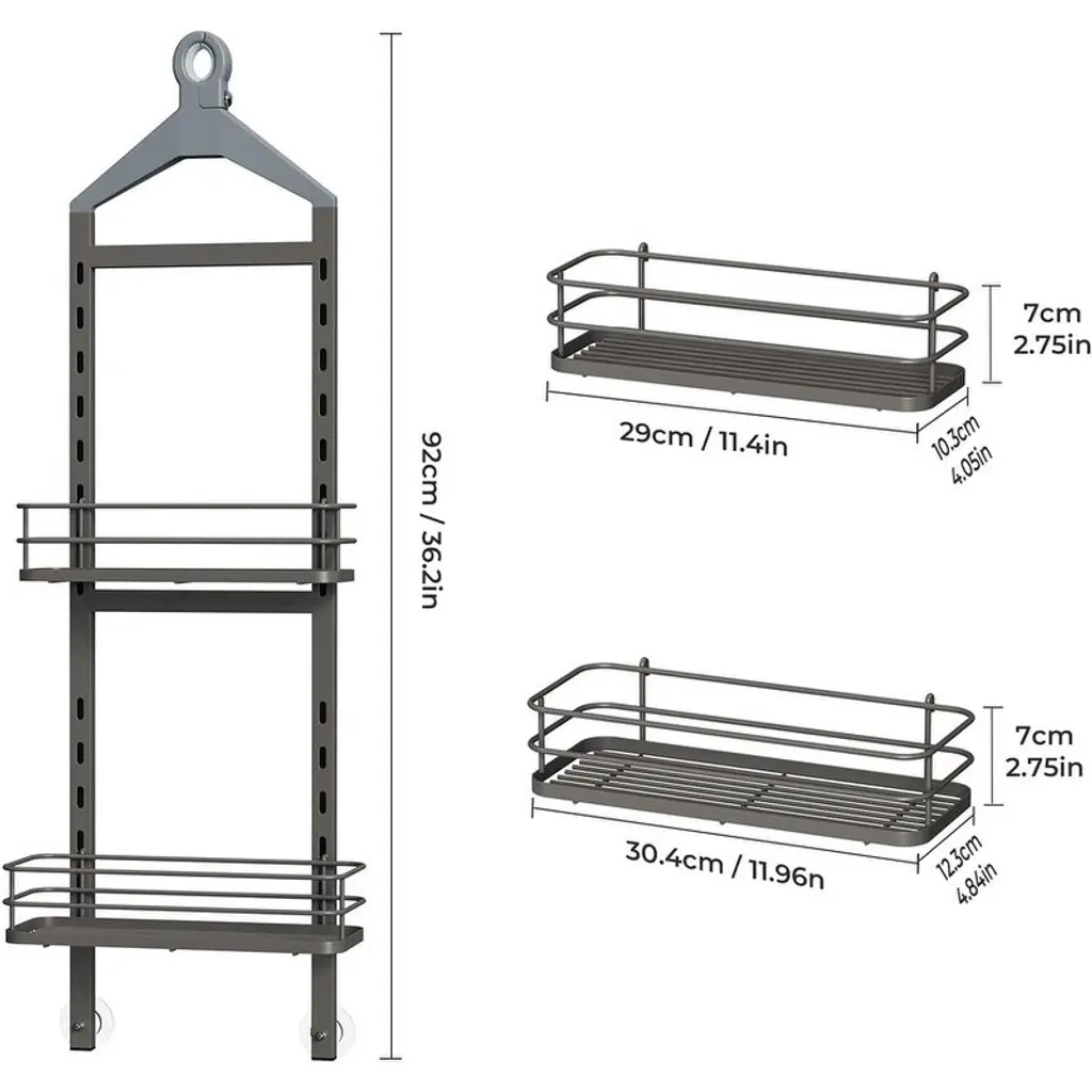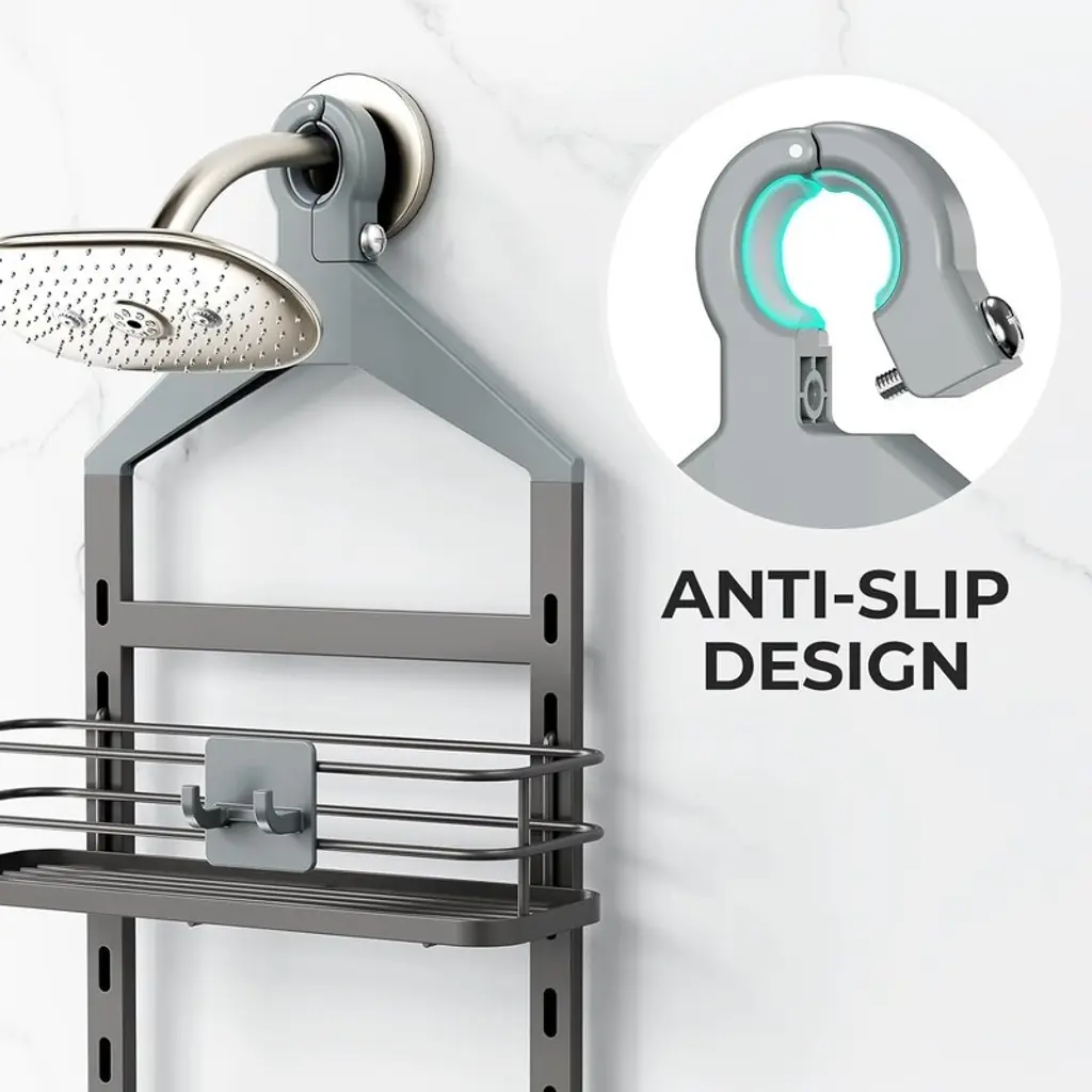 Customizable Spacing – Adjust shelf heights effortlessly to accommodate tall shampoo bottles, lotions, and toiletries of any size for a perfectly organized shower space.Secure Anti-Slip Top – Features a screw-fixed top to prevent sliding or scratching, ensuring stable placement even during frequent use.Sturdy Anti-Swing Design – Dual stabilization with a rubberized shower head gripper and adhesive stickers keeps the shelf firmly in place, preventing wobbles when removing bottles.Quick-Drain & Clutter-Free – Integrated shelf design with drainage holes keeps water from pooling, while compartments neatly organize small items for a tidy shower experience.Rustproof & Durable – Made from high-quality, water-resistant materials to prevent rust and ensure long-lasting performance in wet bathroom environments.