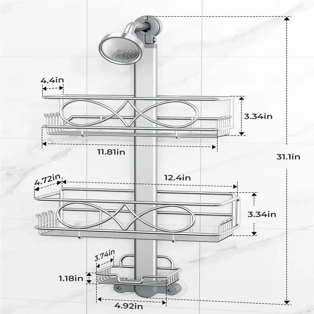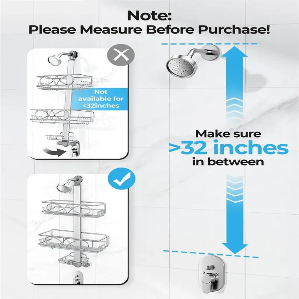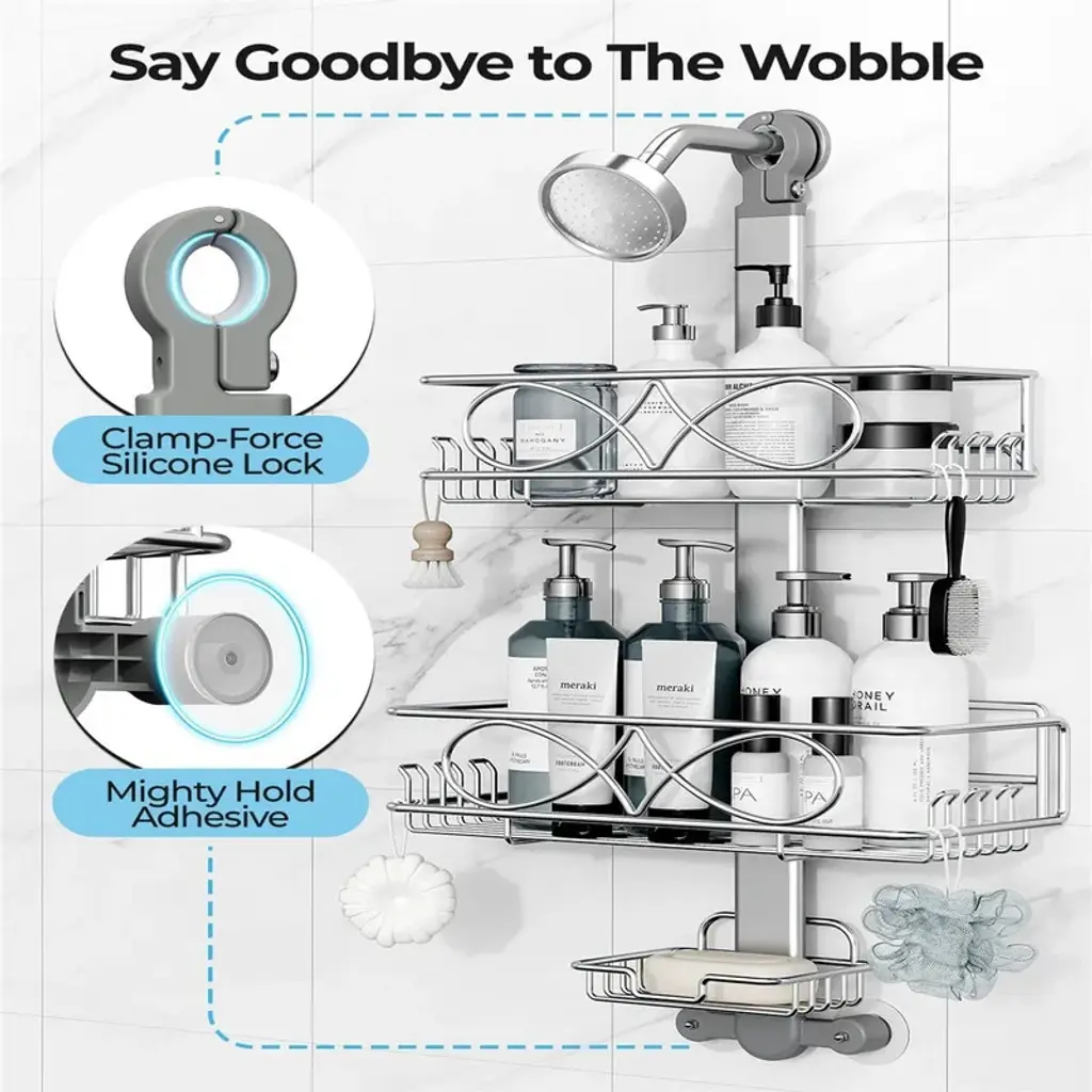 Customizable Spacing – Adjust shelf heights effortlessly to accommodate tall shampoo bottles, lotions, and toiletries of any size for a perfectly organized shower space.Secure Anti-Slip Top – Features a screw-fixed top to prevent sliding or scratching, ensuring stable placement even during frequent use.Sturdy Anti-Swing Design – Dual stabilization with a rubberized shower head gripper and adhesive stickers keeps the shelf firmly in place, preventing wobbles when removing bottles.Quick-Drain & Clutter-Free – Integrated shelf design with drainage holes keeps water from pooling, while compartments neatly organize small items for a tidy shower experience.Rustproof & Durable – Made from high-quality, water-resistant materials to prevent rust and ensure long-lasting performance in wet bathroom environments.