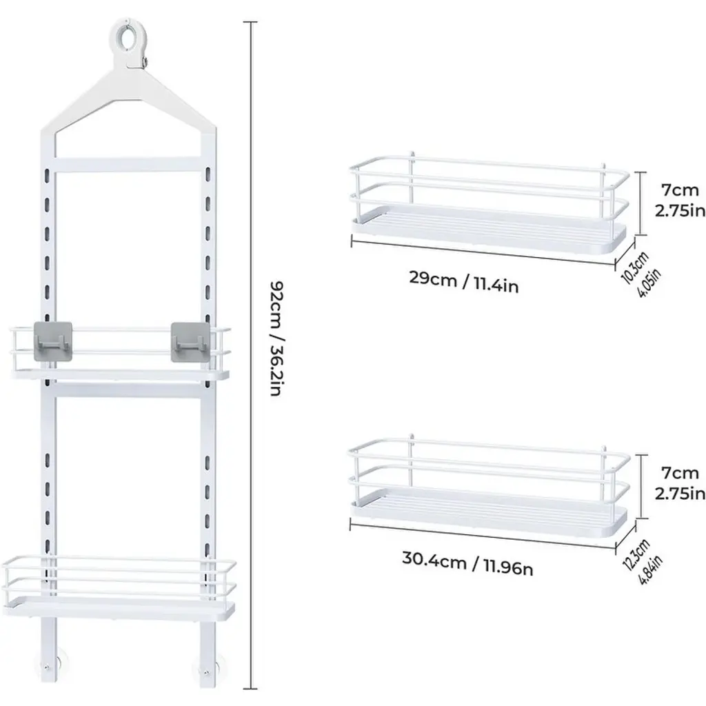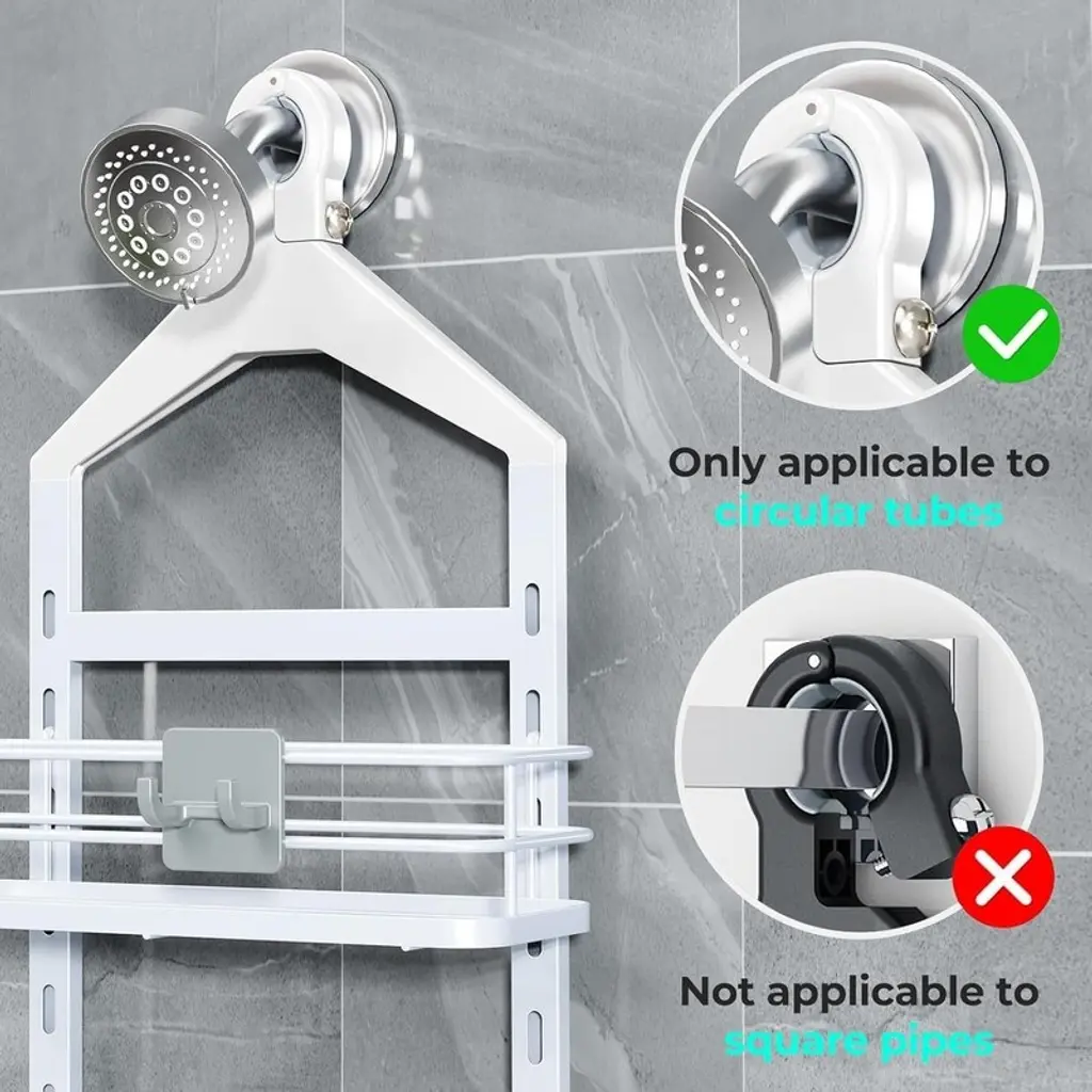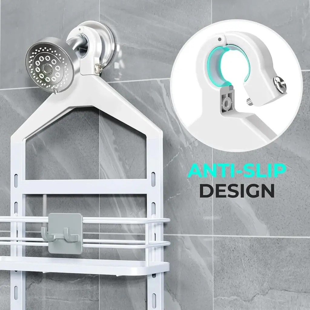 Customizable Spacing – Adjust shelf heights effortlessly to accommodate tall shampoo bottles, lotions, and toiletries of any size for a perfectly organized shower space.Secure Anti-Slip Top – Features a screw-fixed top to prevent sliding or scratching, ensuring stable placement even during frequent use.Sturdy Anti-Swing Design – Dual stabilization with a rubberized shower head gripper and adhesive stickers keeps the shelf firmly in place, preventing wobbles when removing bottles.Quick-Drain & Clutter-Free – Integrated shelf design with drainage holes keeps water from pooling, while compartments neatly organize small items for a tidy shower experience.Rustproof & Durable – Made from high-quality, water-resistant materials to prevent rust and ensure long-lasting performance in wet bathroom environments.