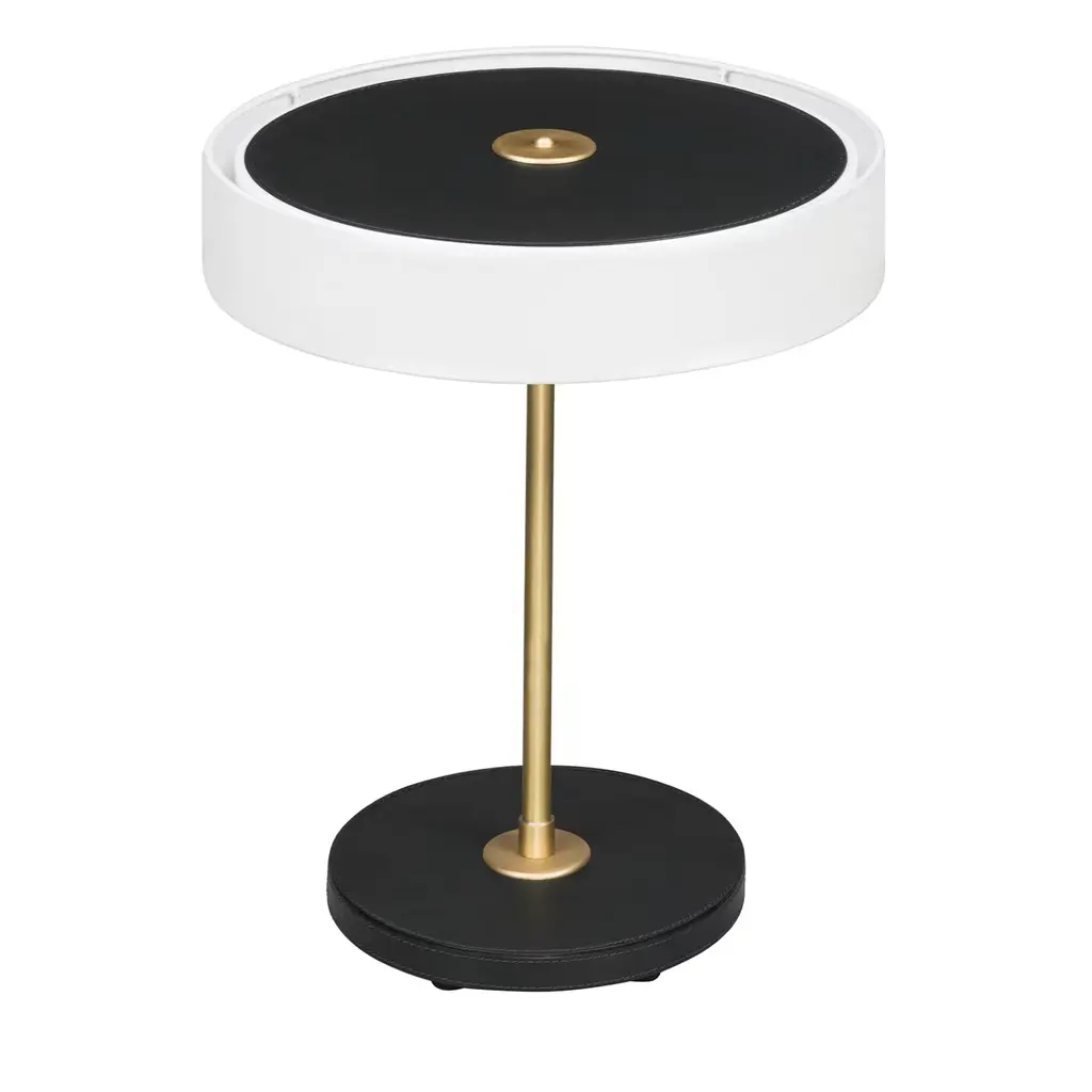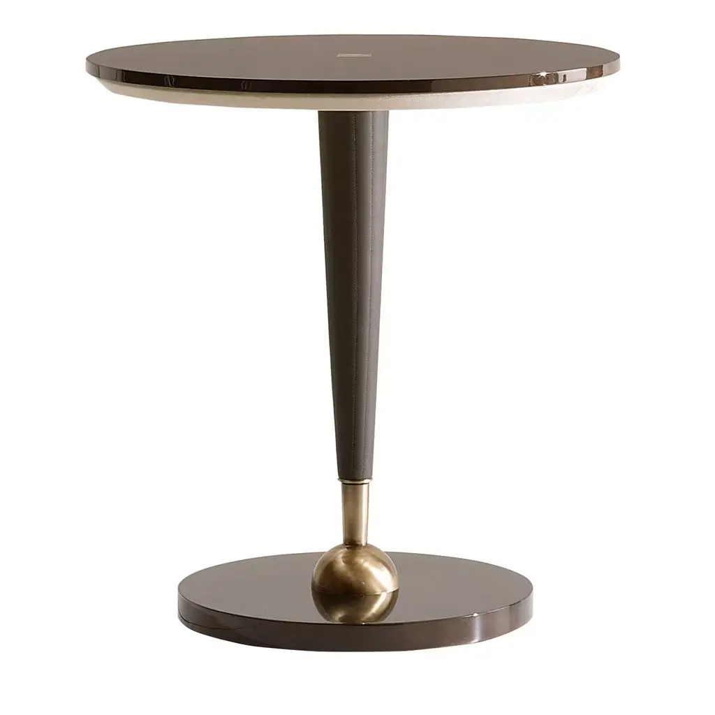 An elegant balance between classic and on-trend, this side table is a versatile piece whose compact size makes it an ideal addition to a small dining room, entryway or bedroom. The round wooden top is fully covered in soft, beige leather and can be detached from the stainless steel column base to be used as a practical tray.