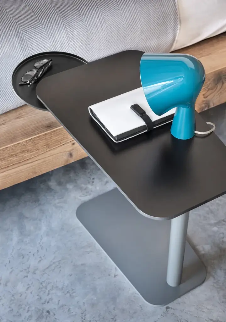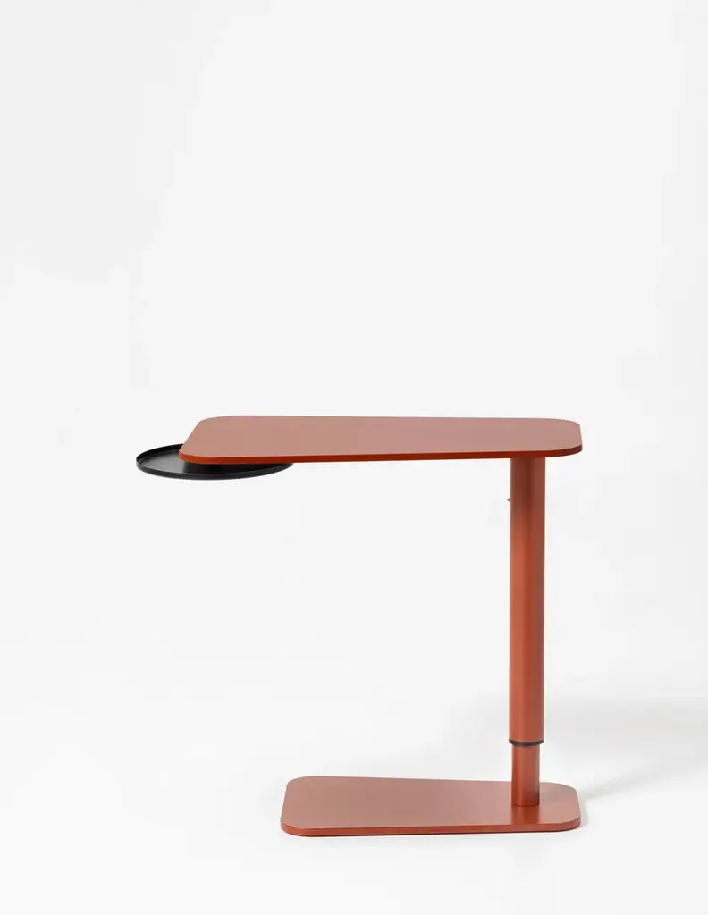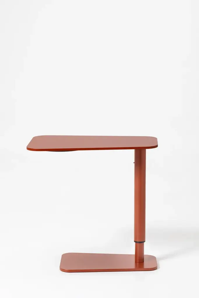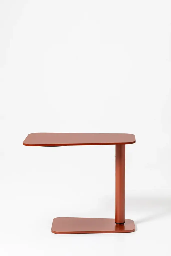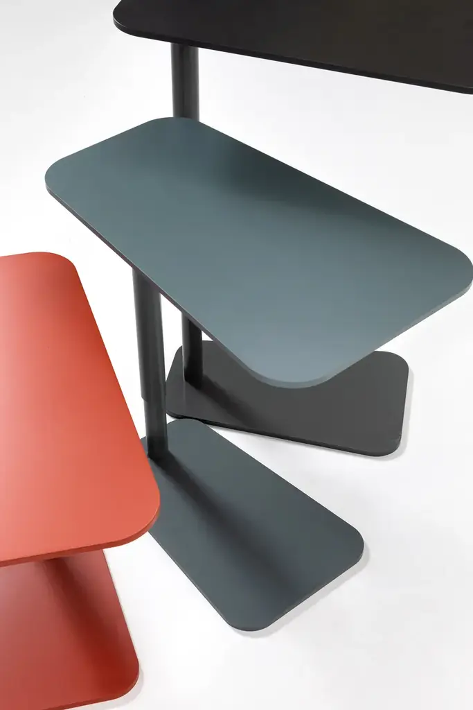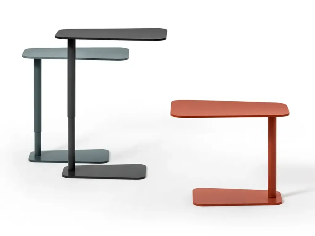 Jens is a design coffee table, ideal to be placed next to the sofa or bed, adjustable in height in three positions, with a small metal tray under the top. Low table with adjustable height, metal structure painted in different RAL colors and HPL top in the same color or lacquered in RAL.