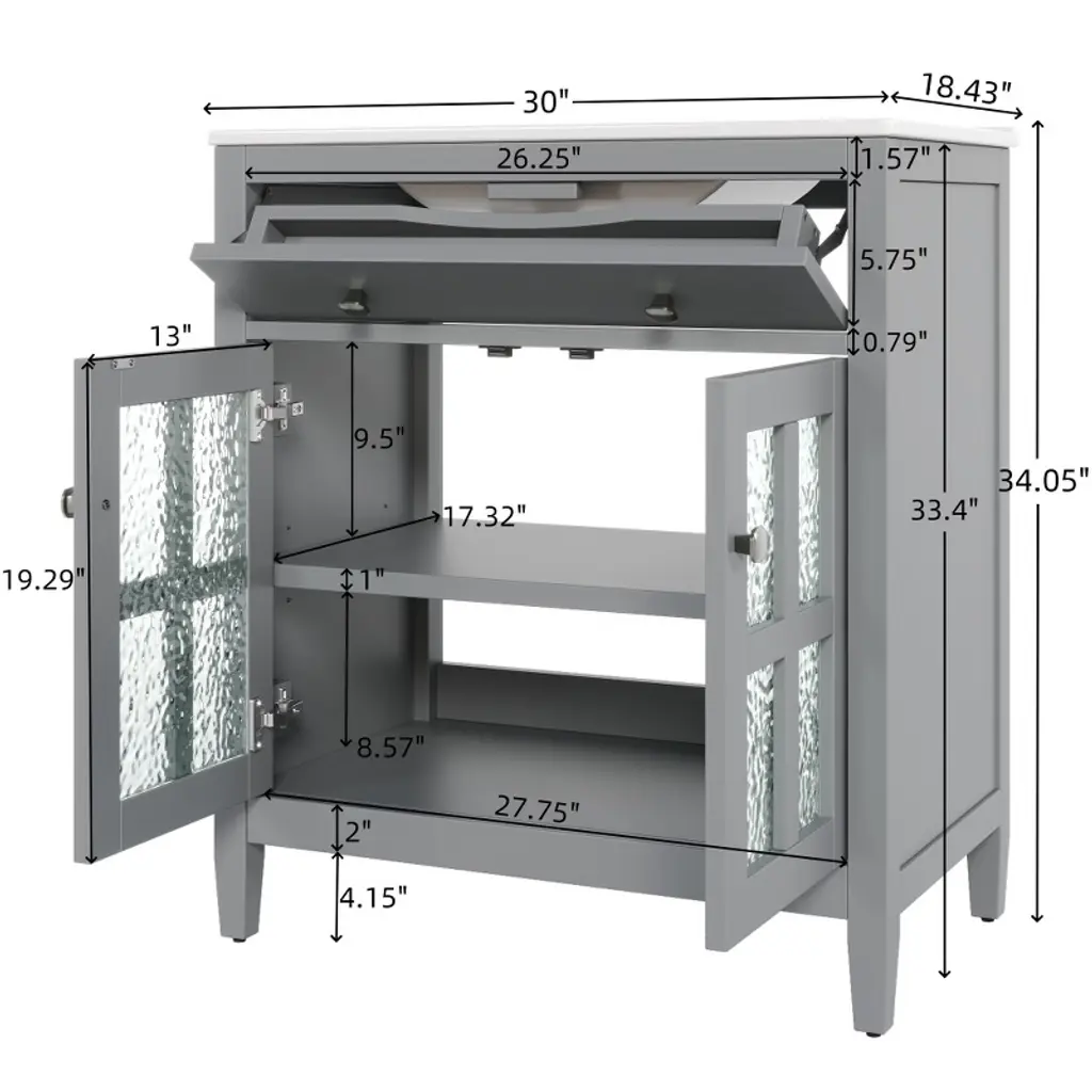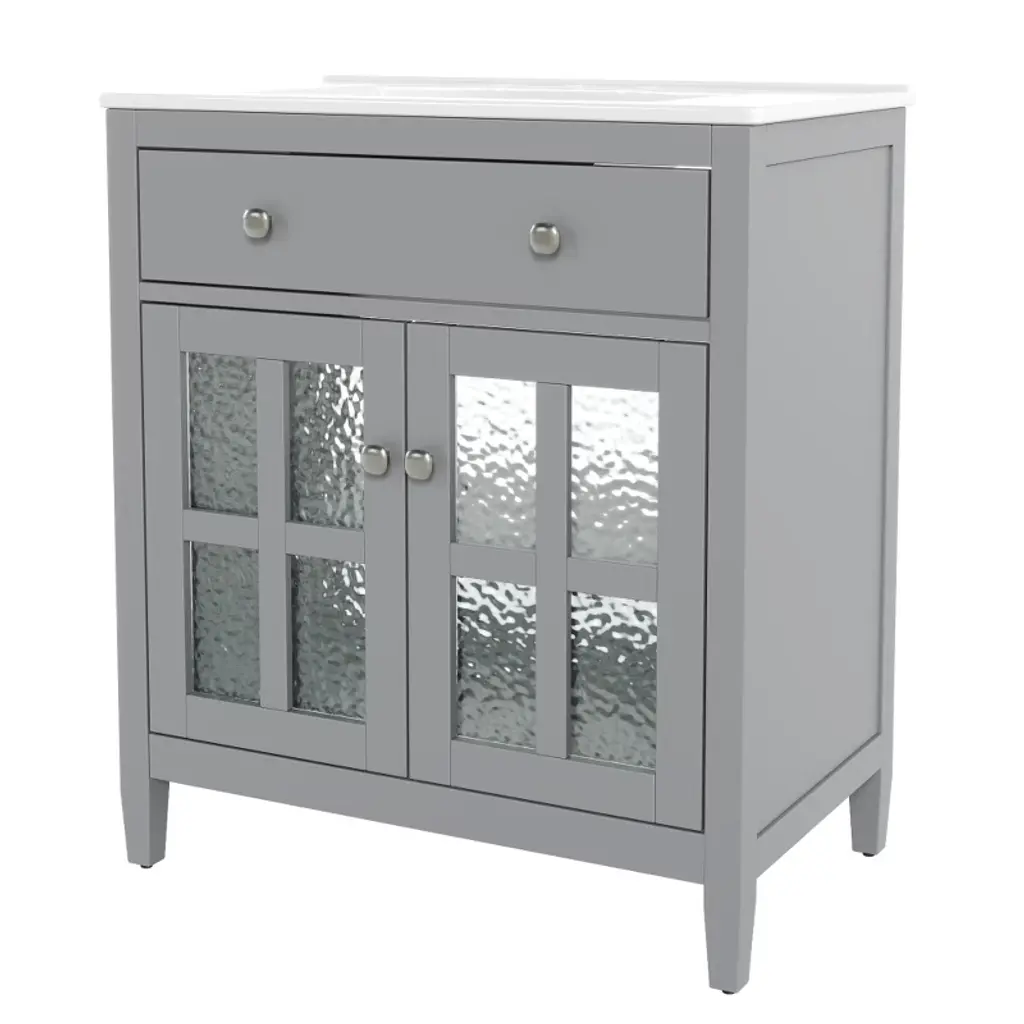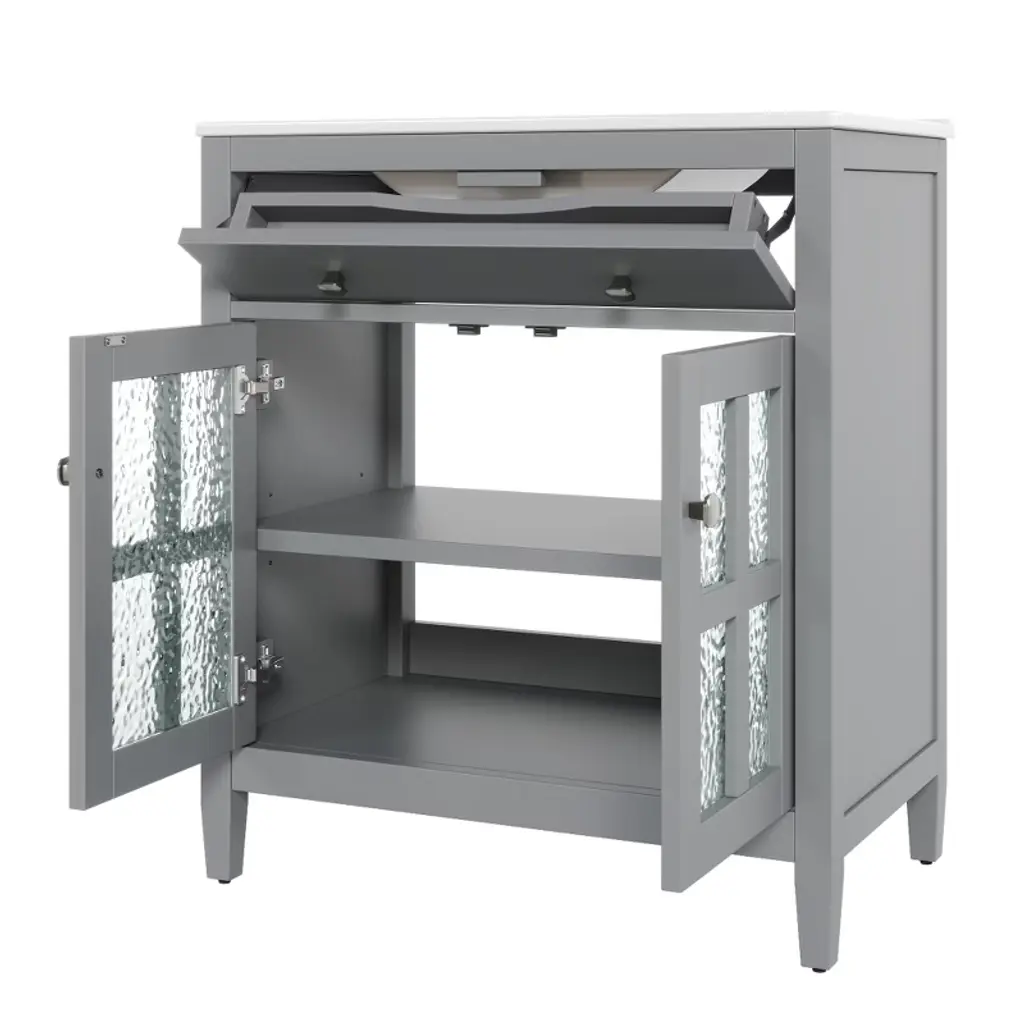 This 30-inch bathroom vanity blends compact design with functionality, perfect for small to medium bathrooms—its space-saving footprint fits most layouts while offering ample storage and counter space. Supported by sturdy solid wood tapered legs, it resists floor moisture, adds a modern, airy look, and ensures lasting stability. A convenient tip-out tray/flip-out drawer keeps small essentials (razors, sponges) within reach, paired with a textured glass door that balances style and privacy for concealed storage. The vanity features a waterproof painted finish to repel moisture, warping, and stains, plus premium silver knobs and soft-close hinges for smooth, durable use. An adjustable shelf lets you customize under-sink storage, while the easy-to-clean surface (wipes clean with a damp cloth) maintains its fresh appearance, making it a practical and stylish addition to any bathroom.