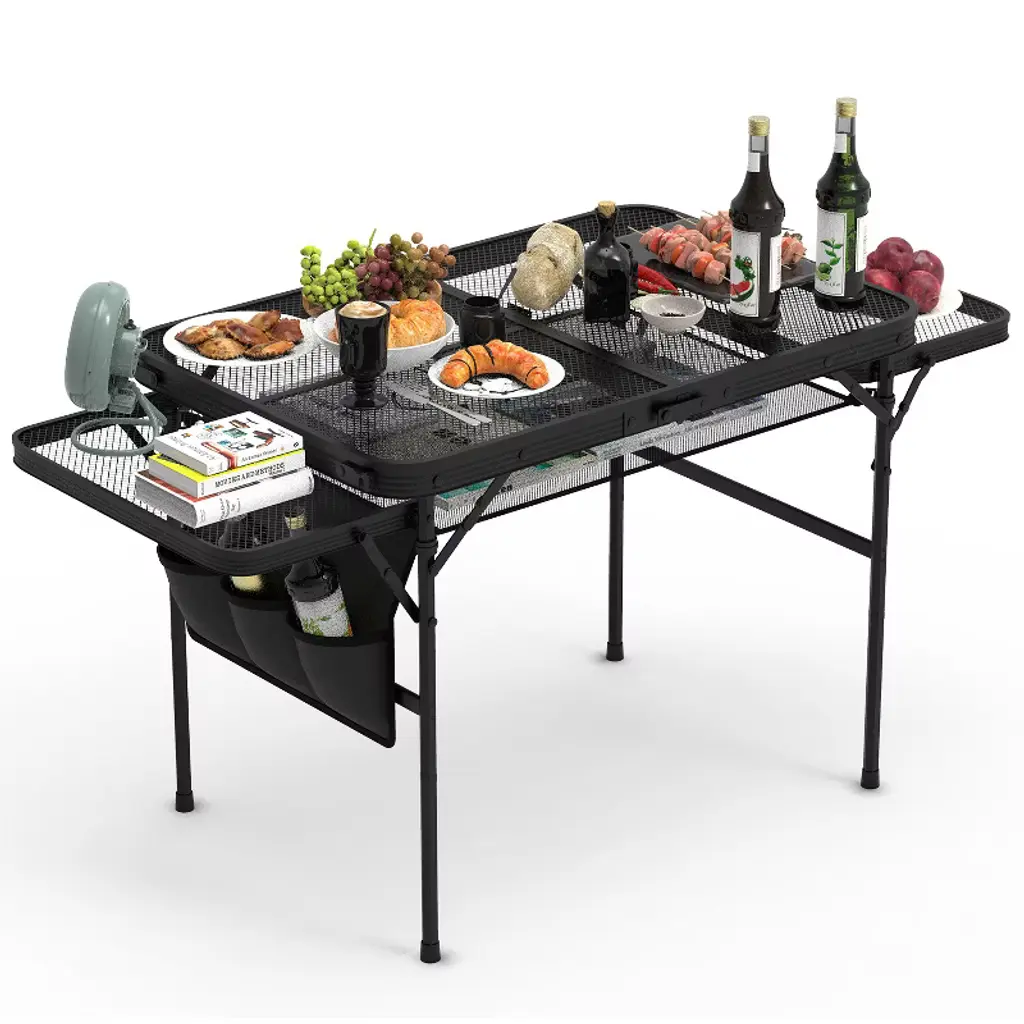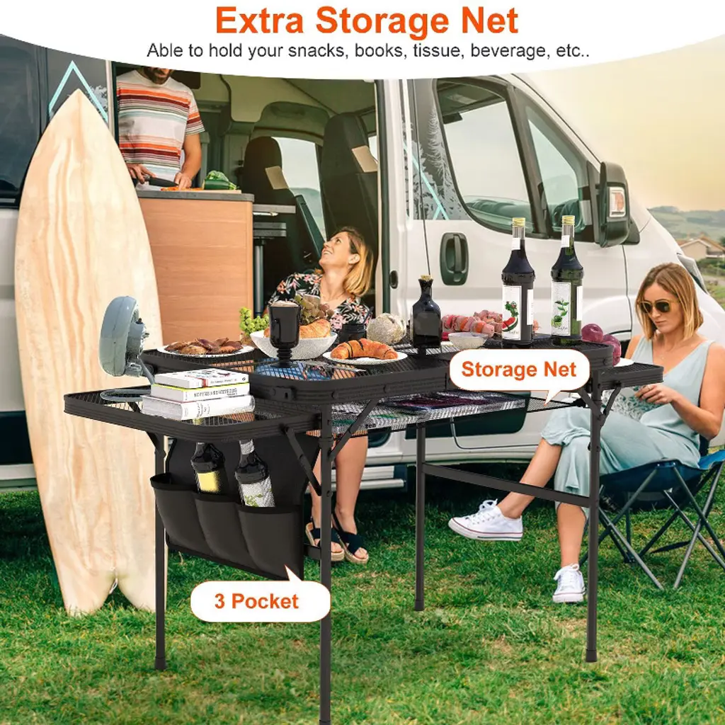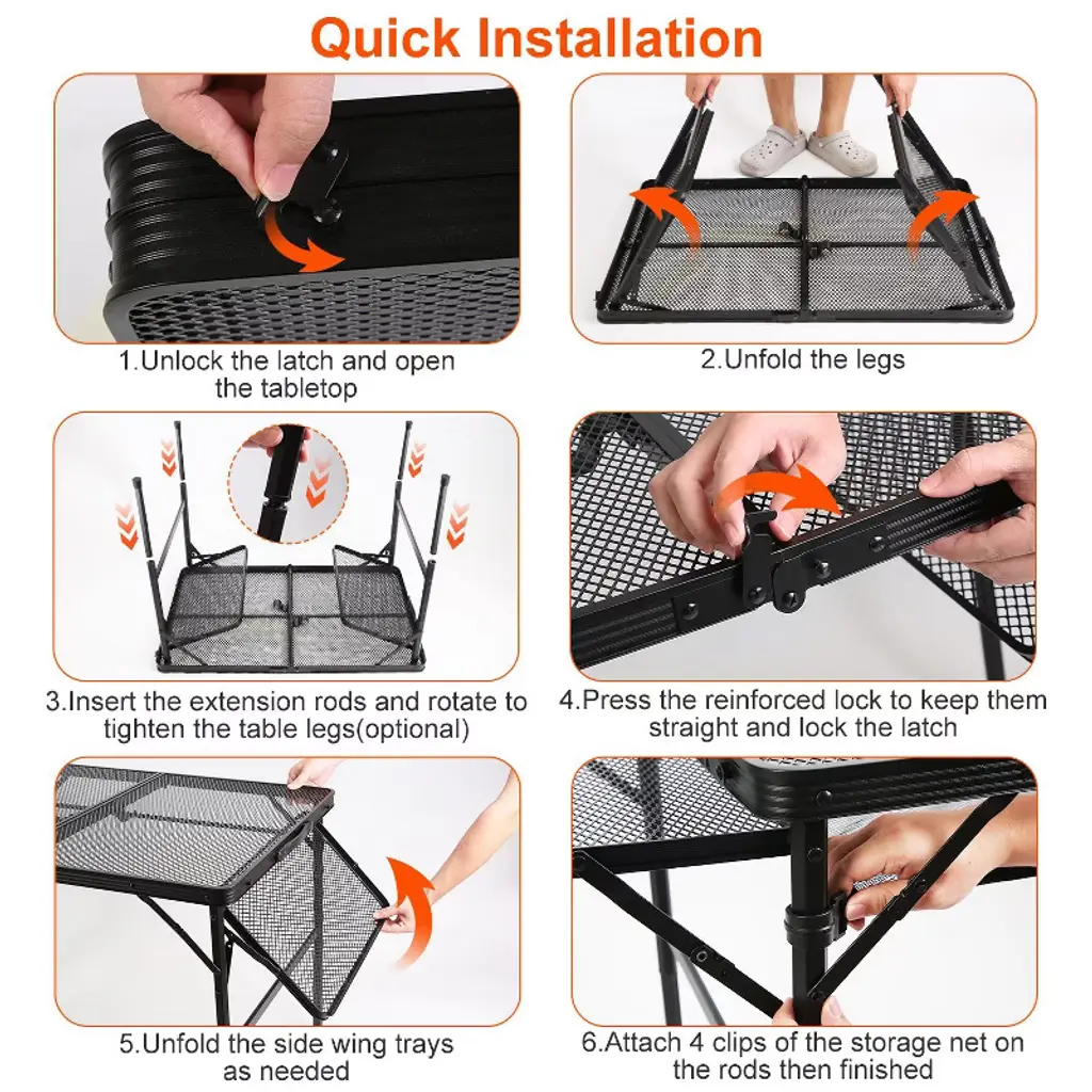 Product Features: 66LBS Load Capacity: This durable folding camping table features a strong iron mesh desktop and an aluminum alloy frame, capable of supporting up to 66 lbs. It includes safety latches and locks to ensure maximum stability. Four detachable, anti-slip feet provide extra support for outdoor activities. Dual Height Options: Equipped with four detachable bottom rods, you can adjust the table height from 16.54 inches to 26 inches, making it suitable for both kids and adults. Convenient Dual Side Trays: The table comes with two side trays (19.3 x 11.8 inches each), providing extra space for seasonings, bowls, or dishes. The 0.6-inch inner edge prevents items from falling off easily. Hanging Storage Net: This camping table includes a hanging net with three side pockets, which can be clipped to the table's poles. It’s perfect for holding snacks, keys, books, drinks, and other small items. Portable & Foldable Design: The table is lightweight, weighing only 10.69 lbs, and easily folds into a compact size for space-saving storage. Take it anywhere – simply throw it in the trunk or store it for later use. Versatile Use: Ideal for camping, hiking, BBQs, fishing, picnics, travel, and backyard use. Its sturdy build and thoughtful features make it perfect for a variety of outdoor activities. Care Instructions: Wipe clean with a wet cloth and dry immediately to prevent rusting. Keep away from fire and place on a flat surface. Gently press the middle of the tabletop to ensure it remains flat. Specifications: Brand: LakeForest Color: Black Material: Aluminum Alloy, Iron Mesh, 210D Oxford Cloth Hanging Net Table Load Capacity: 66 lbs Hanging Net Load Capacity: 11 lbs Adjustable Height: 16.54in (low) / 26in (high) Tabletop Size: 35.43 x 23.62 inches Side Tray Size: 19.3 x 11.8 inches Folded Size: 23.62 x 17.72 x 2.56 inches Unfolded Size (Without Extension Rods): 53.54 x 23.62 x 16.54 inches Unfolded Size (With Extension Rods): 53.54 x 23.62 x 26 inches Item Weight: 10.69 lbs Package Weight: 11.9 lbs Package Includes: 1 x Camping Table 1 x Hanging Net 4 x Extension Rods 1 x User Manual