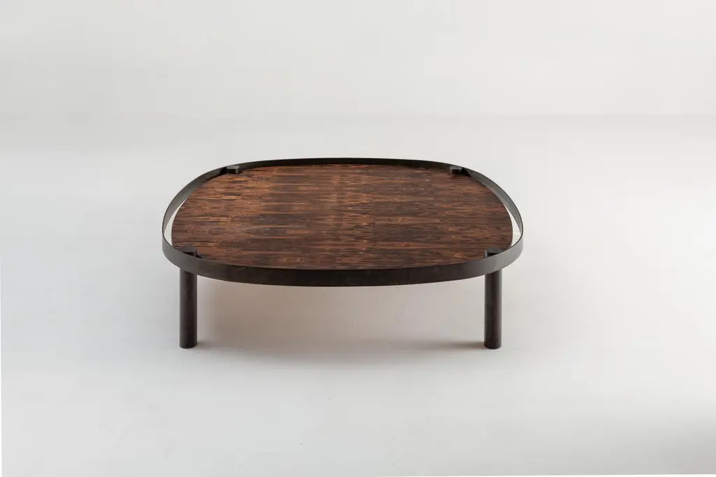 Low squared coffee table with "tray effect". Tubular base in acid-etched iron "Storm" and top in Ziricote wood.The tray coffee tables, with a modern and creative design, are designed to create magnificent multiple compositions of juxtaposition and overlapping.They offer the chance to play with materials, shapes and colours to create flexible, artistic and personal pieces and compositions.Customization:Top available in all wood essences of the collection and in dyed or special wood, in Garza, in Alambra Brown marble and in bronze, copper or tin back-lacquered glass.