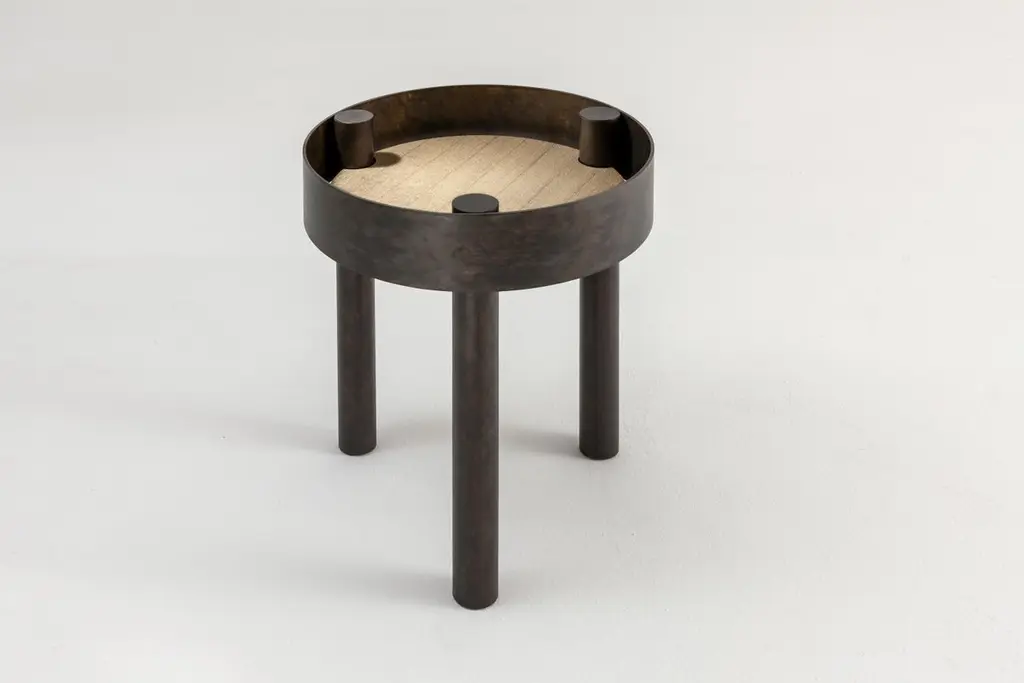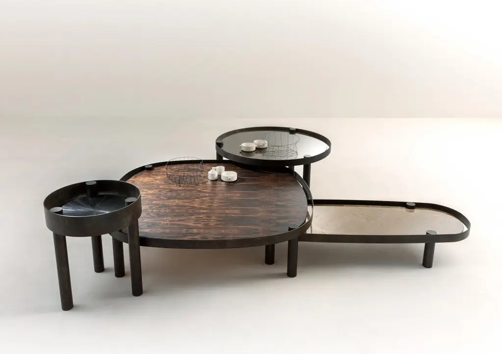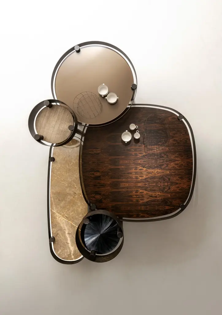 Round tall coffee table with "tray effect". Tubular base in acid-etched iron "Storm" and top with Garza finish.The Tray coffee tables, with a modern and creative design, are designed to create magnificent multiple compositions of juxtaposition and overlapping.They offer the chance to play with materials, shapes and colours to create flexible, artistic and personal pieces and compositions.Customization:Top available in all wood essences of the collection and in dyed or special wood, in Garza, in Alambra Brown marble and in bronze, copper or tin back-lacquered glass.