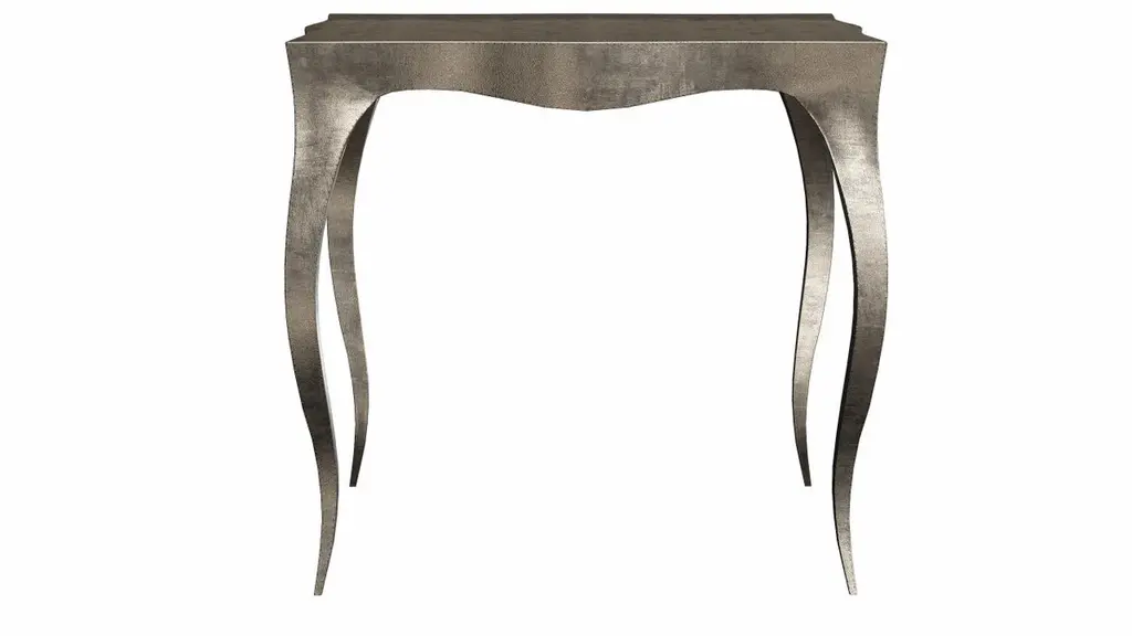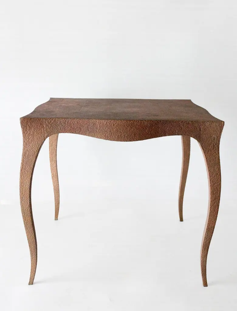 Louis Card Tables from our Louise Collection. The renowned designer Paul Mathieu chose the name “Louise” when he created his more feminine version of Louis XV (1730-1760) furniture. The characteristic cabriole leg, curving outward at the knee and inward towards the foot in an "S" shape was born during this period. It is during the same era that English furniture makers produced the Queen Anne and Chippendale styles.Crafted with utmost care and attention to detail, these Louis Card Tables are made to order and are available in twelve metal clad finishes, ensuring that you can choose the perfect one to match your individual style and taste. The use of high-quality materials and expert craftsmanship ensure that each Art Deco Louis Card Tables is not only beautiful but also a true piece of art.The curved legs and side arms of this Art Deco Louis Card Tables are hand carved from solid pieces of teak. Pattern makers trace and cut complex forms that will cover the chair in a skin of copper, white bronze, brass or antiqued white bronze The metal finishes will tarnish over time. Regular non-abrasive household metal polishes can be used to restore the original luster.Overall, if you're looking for a piece of furniture that combines luxury, comfort, and style, then the Art Deco Card Tables is an excellent choice. With its distinctive curved profile and multiple finish options, this Chair set is sure to elevate the look of any room it is placed in, and be a beloved addition to your home for years to come.The images shown in this listing are shot in different lighting conditions and/or are 3D illustrations. We encourage our customers to please request a sample or a full sample set of 12 finishes so that they can experience the finish first hand. Louise Art Nouveau Tray Tables Fine Hammered Antique Bronze by Paul MathieuSize- 32"x 32"x 30"HMaterials - Antique Bronze, Metal sheet, Teak, Wood, MetalTechniques: Hand-Crafted, Hand-Carved, Metal Work, Wood Work, Metal Wrapping, PolishedPlease note that moisture in air, sudden change in temperature and natural movement of wood over time causes the metal to wrinkle or bubble up. We use well seasoned, reclaimed teak and high quality marine grade MDF (wherever technically possible) to avoid and delay the mentioned changes. However a perfect stability of metal cannot be guaranteed. Please note that our smooth finish metal clad pieces will have some unavoidable tool marks. This is proof that everything is done by hand. The smooth finish will not come out like a machine made perfect surface and the master artisan will do their best to make it look as good/clean/stable/perfect as he possibly can.The antique white bronze finish is hand done by using an acidic chemical over the white bronze finish to recreate a natural patination. Like with the natural patination of silver, copper, or brass, the final result and color uniformity of the patina cannot be guaranteed. The goal of this finish is to achieve rainbow-like shades with dull, shiny, cloudy, and streaky patches to give an illusion of antiquing. Please note:None of our metal clad pieces are treated with a protective “finish” thus enabling the items to age naturally over time. We will of course polish them well before we pack them. a) Copper oxidizes faster than the other metals. In six to twelve months it will most likely lose its shine and will gradually turn to different shades of brown and/or green/blue. This aging process and its effect is referred to as verdigris. After a year the piece should not change much more. Copper does not rust, but does require periodic cleaning in order to retain its original shine if that the preferred option. ('BRASSO' or any known copper polish can be used to polish copper).b) Brass retains its shine for far longer than others, but will tarnish if not cleaned on occasion. ('BRASSO' is made to polish brass).c) White bronze, has the least tendency to show age or tarnish. If kept in a controlled climate, this metal will hold its shine for years. It can be cleaned with a cleanser and polished with a cloth. d) The antiqued white bronze finish will react with the natural elements the fastest in the beginning but it too will stop reacting and will settle down in a stable state like copper after 6-12 months. Since it is already antiqued and looked like it is tarnished, as described in an earlier message, this fast reaction will not change the over all look. In that way this surface is most forgiving. The images shown in this listing are shot in different lighting conditions and/or are 3D illustrations. We encourage our customers to please request a sample or a full sample set of 12 finishes so that they can experience the finish first hand.