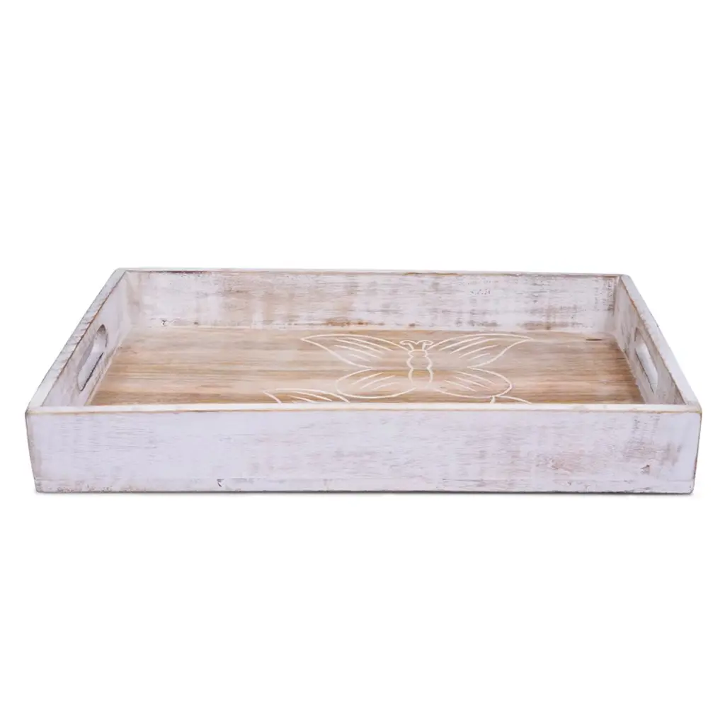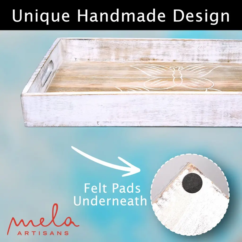 This Butterfly Whitewash Wooden Serving Tray is a perfect & elegant addition to your home. These serving boards are extremely reliable to be used as a kitchen organizer, indoor and outdoor platter, tabletop decor, and much more! The vintage tray with butterflies engraved on it, stands out as an eye-catching coffee table tray but is versatile enough for organizing all sorts of accessories and personal belongings. Our rustic tray is not only great for serving, but also for using as a home decor item base. The wooden serving board is perfect for placing and displaying it on your ottoman, desk, table, and more.