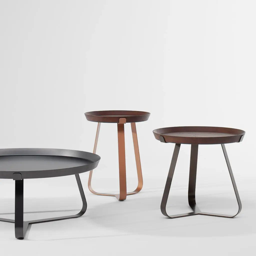 An expressive onomatopoeia that recalls the sounds of cicadas: this is the image that inspired the line of coffee tables by Bonaldo. The geometric, slender and rounded design of the structure makes them lightweight, while a game of balances between sharp corners and rounded angles supports a practical removable tray, an element that can be further embellished with an elegant ceramic top. In the single material version, the effect is of essential elegance and functionality; in the version with the ceramic top, the contrast between the two materials adds further character. Frinfri modern round wooden coffee tables are available in three different heights and all models are available in multiple color variants, thus making it possible to choose the one that is most suitable to individual stylistic needs. The Frinfri modern wood coffee table variant features a wooden top and is available in two sizes (high and medium).