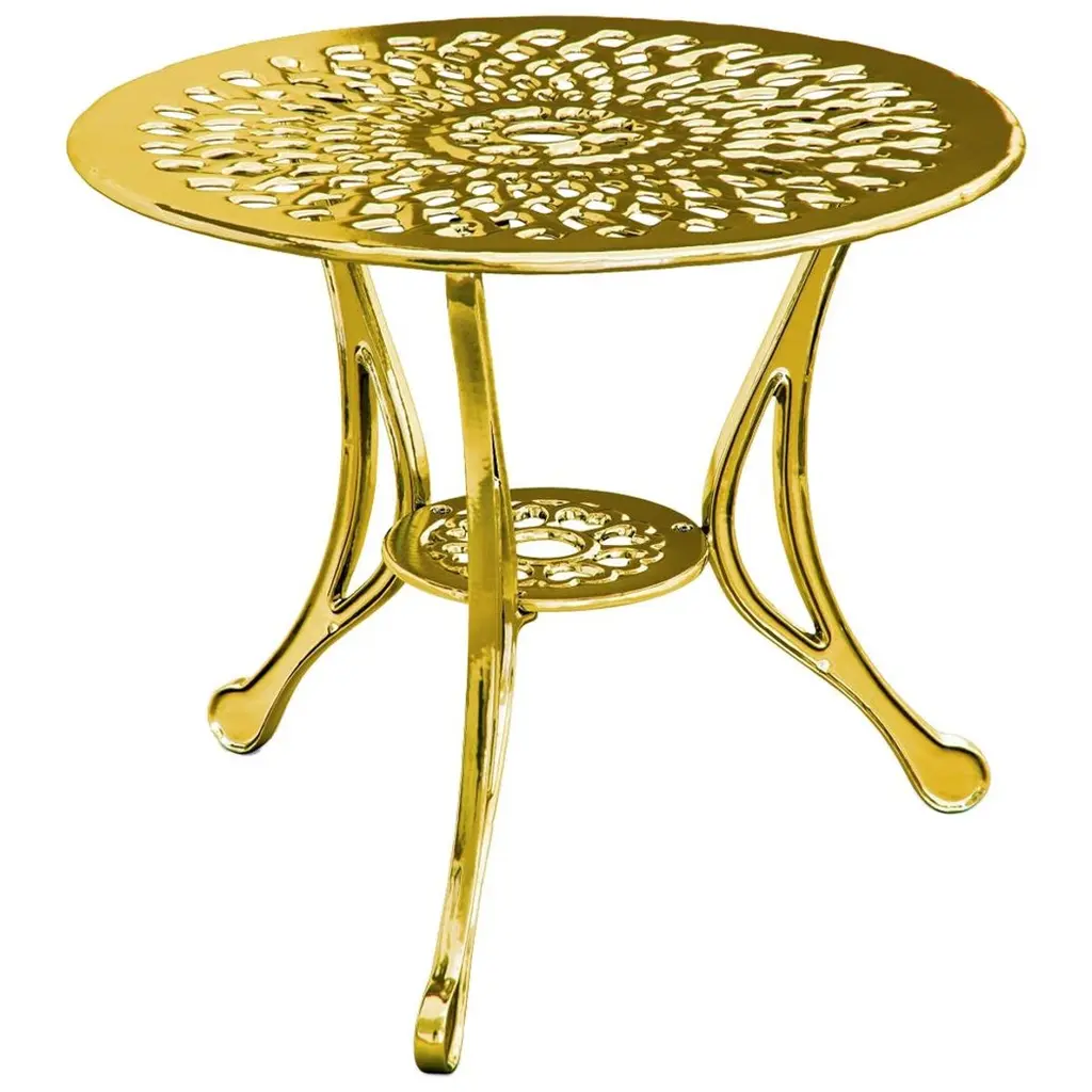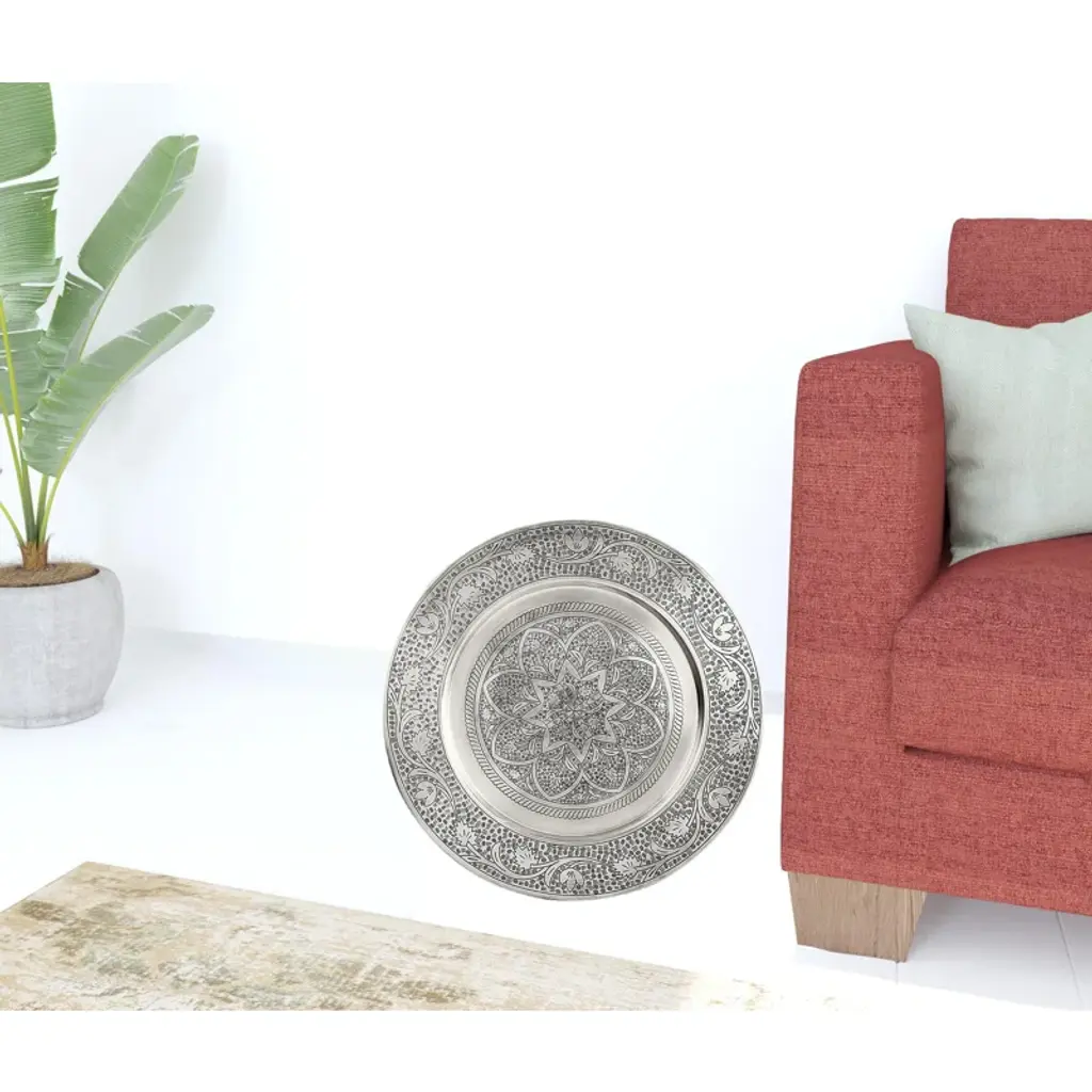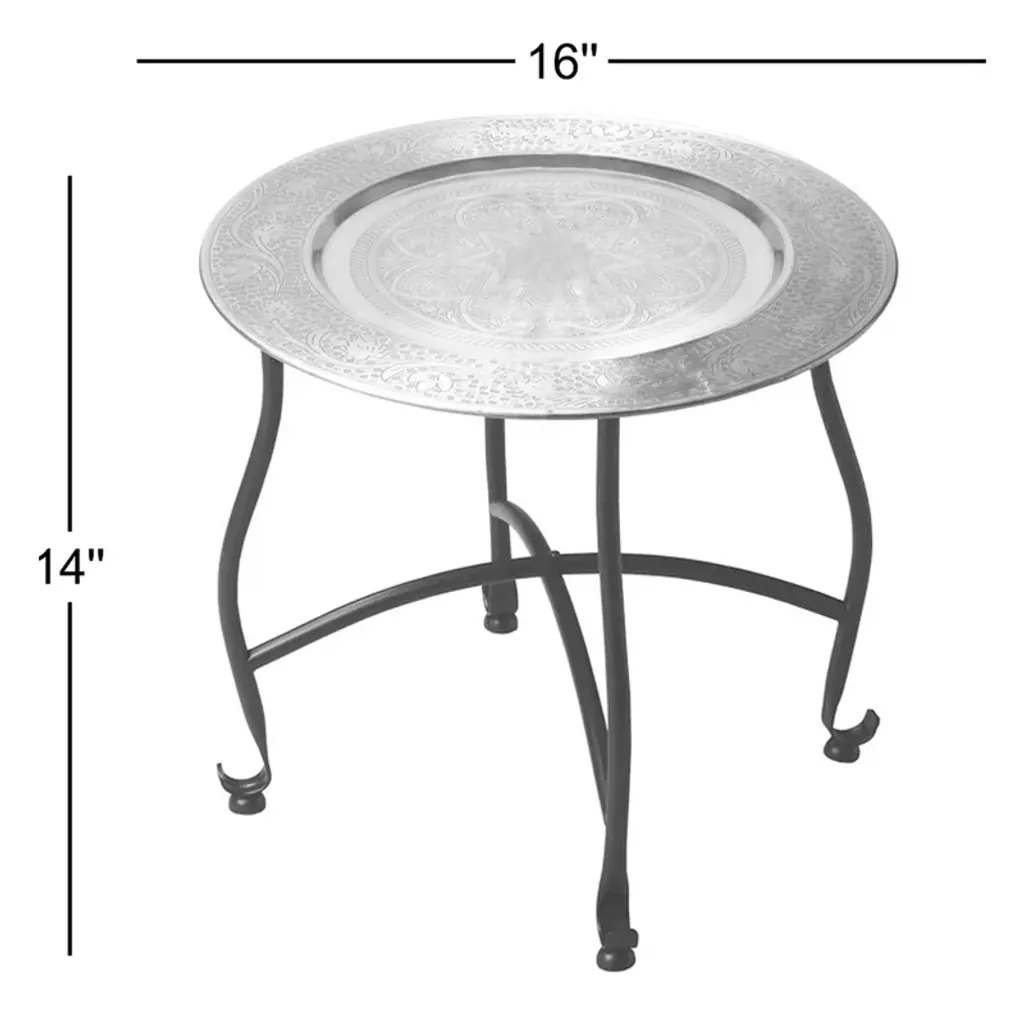 The Anaisha metal-works end table is a simple-looking piece of furniture that is sure to add a hint of charm to existing decor. Compact and versatile, the table can easily fit into any corner of a room. The traditional design and vintage look of this table are sure to catch everyone’s attention. The circular table is made of a lightweight aluminum tray that rests securely on a sturdy base. It stands on four aluminum legs to make for a strong and durable base. The tabletop is embossed with a charming Moroccan design which looks classy and chic. Place the table on one end of the couch to bring out its best features. You can keep a charming decor piece like a vintage lampshade on the tabletop to give it a personalized touch. The table with its traditional design lends an edgy look to the interiors. If you are a fan of antique pieces, this one is surely going to catch your eye. The Anaisha metal-works end table is lightweight and easily portable, making it easy to move around the house. The table is high on quality and low on maintenance. Clean it occasionally with a dry cloth to take pleasure in using it for a long time to come.