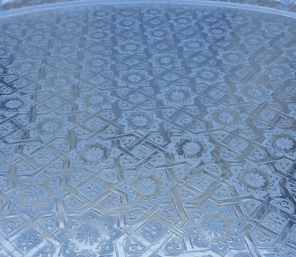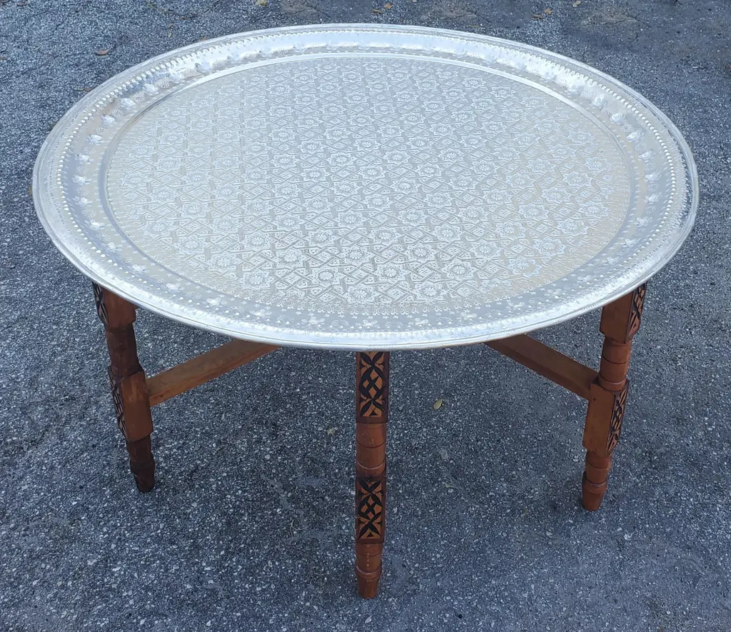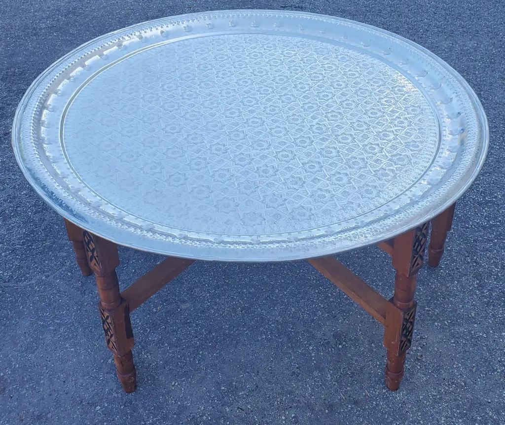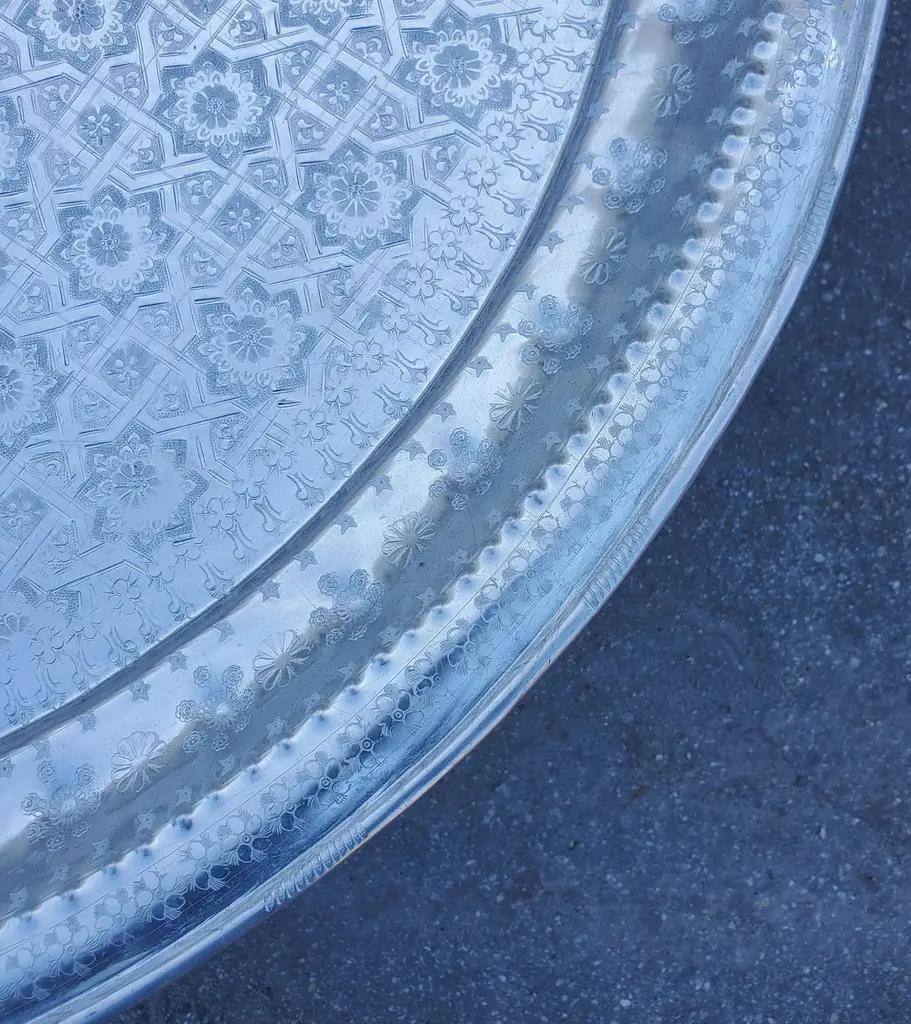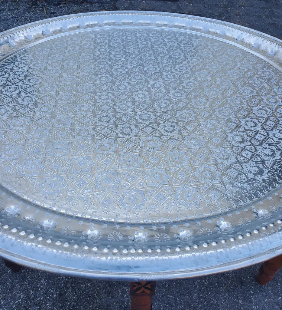 One of a kind Moroccan Metal tray table, ideal as a coffee table or a side table. Very exotic. Round shape and an amazing look. These amazing metal trays Tables will add an exotic look to your home, office, or place of work. Each tray has been hand-hammered by fair trade artisans in Marrakech, and the intricate patterns have been passed down through generations. It measures approximately 38" in diameter, and 19" in height.