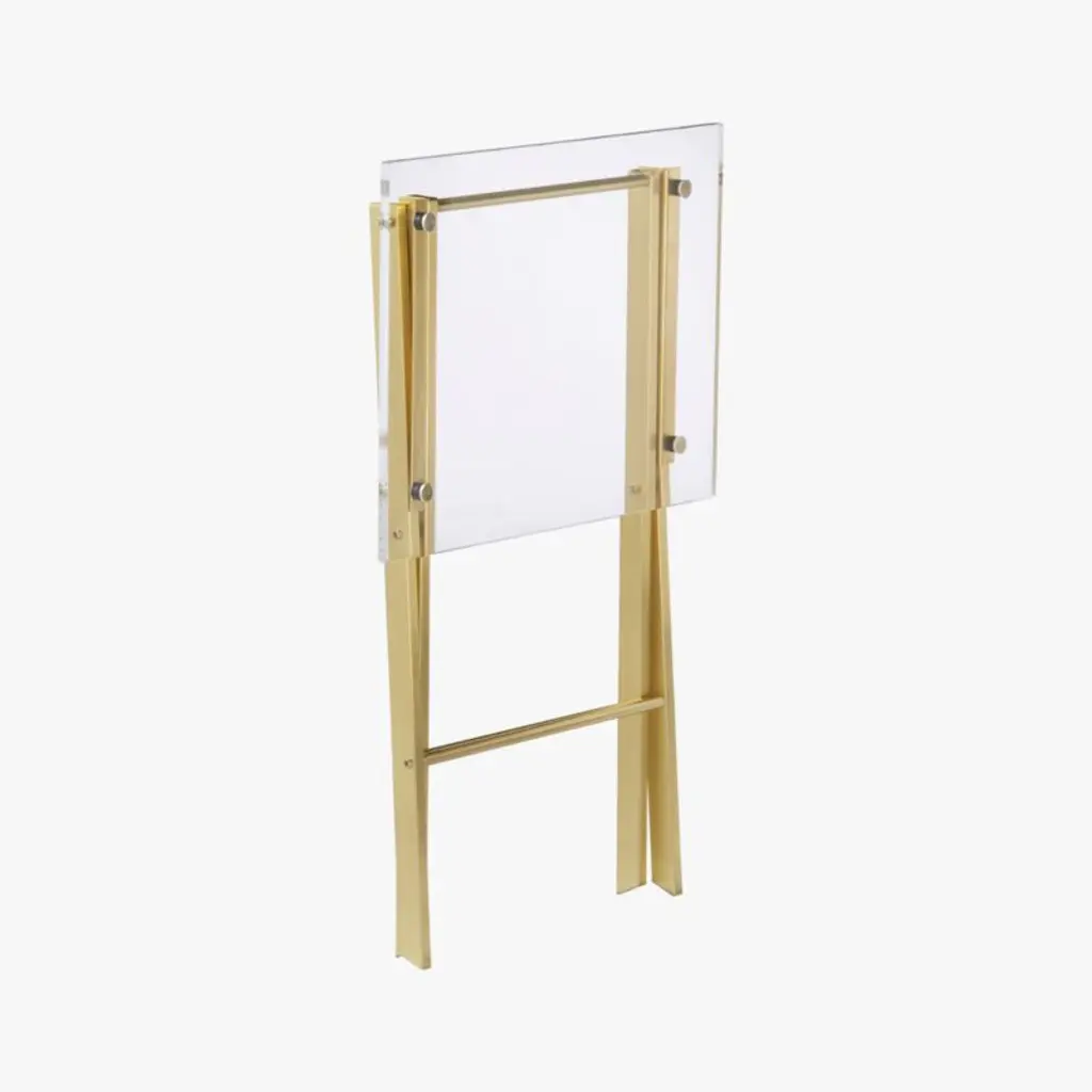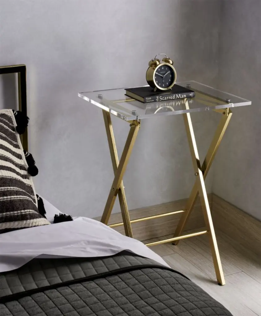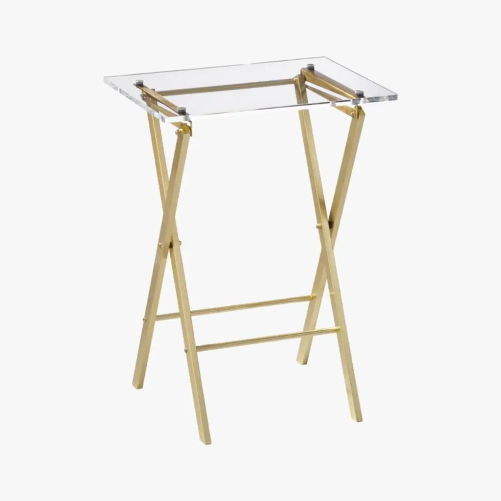 Clearly modern with a vintage stance, this space-saving design was created exclusively for CB2 by husband-and-wife-design duo Robert and Cortney Novogratz. The Novogratz Holiday Collection combines their eye for colorful bold modern with their love of vintage finds they've gathered for years to transform their New England country home every Christmas. "Our first apartment was so small that we didn't have room for a dining table," Robert says. "So instead, we found several folding tables that we'd bring out for entertaining. These acrylic and brass tables can be used for an impromptu dinner party and then fold up to tuck away. They also make great end tables and nightstands." Learn about Robert and Cortney Novogratz on our blog.