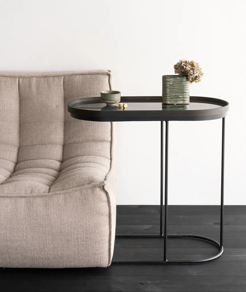The oblong tray table is one of our most versatile pieces: while it serves its function as a side table, its ability to adopt different trays allows you to mix or match various colors and patterns, creating a personal piece that is uniquely yours. To be combined with Oblong Angle Glass Tray, shown here.
