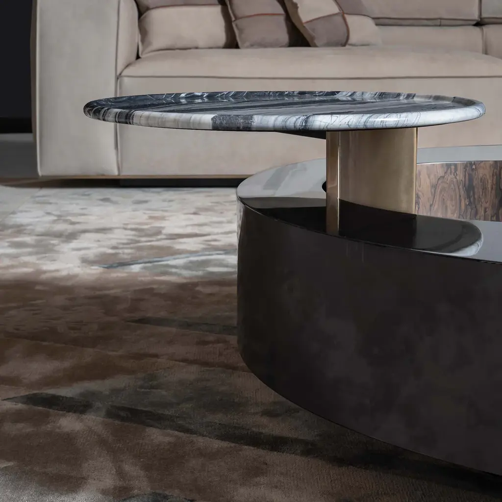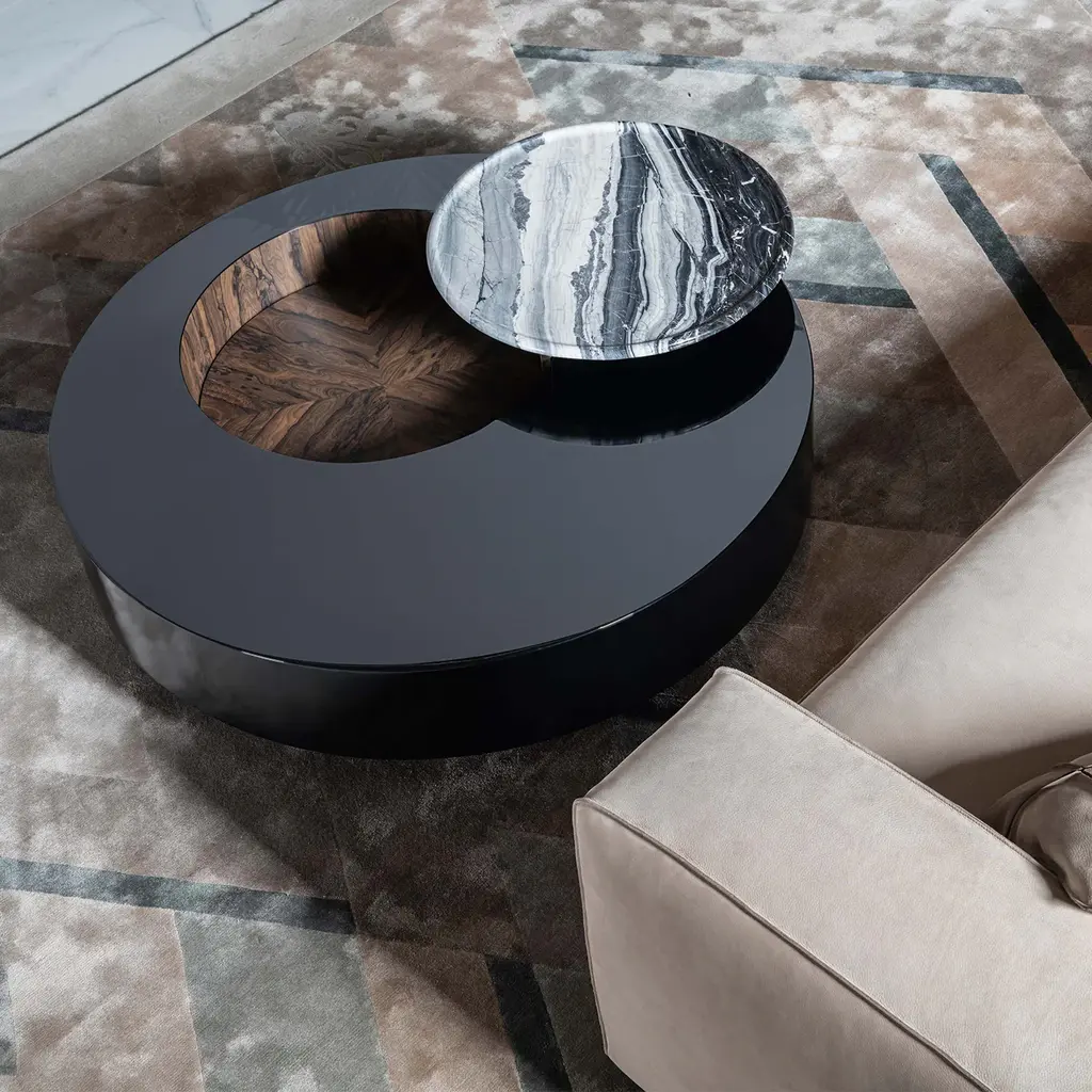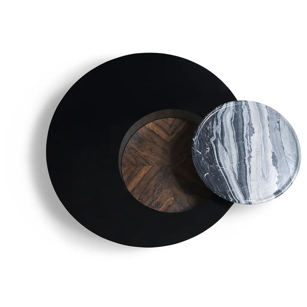 The Orbital is a round coffee table with a lacquered black wood structure and a wood-veneered storage compartment in zircote. Inside, it features a carved marble tray with a round relief edge, suspended on a rotating metal support. The metal parts are finished in jet black matte, adding a sleek, modern touch. The marble tray enhances the table’s functionality and sophistication, making it a stylish addition to any space.