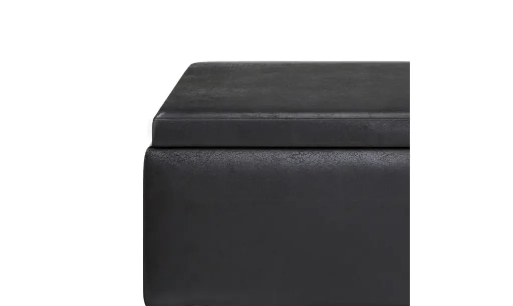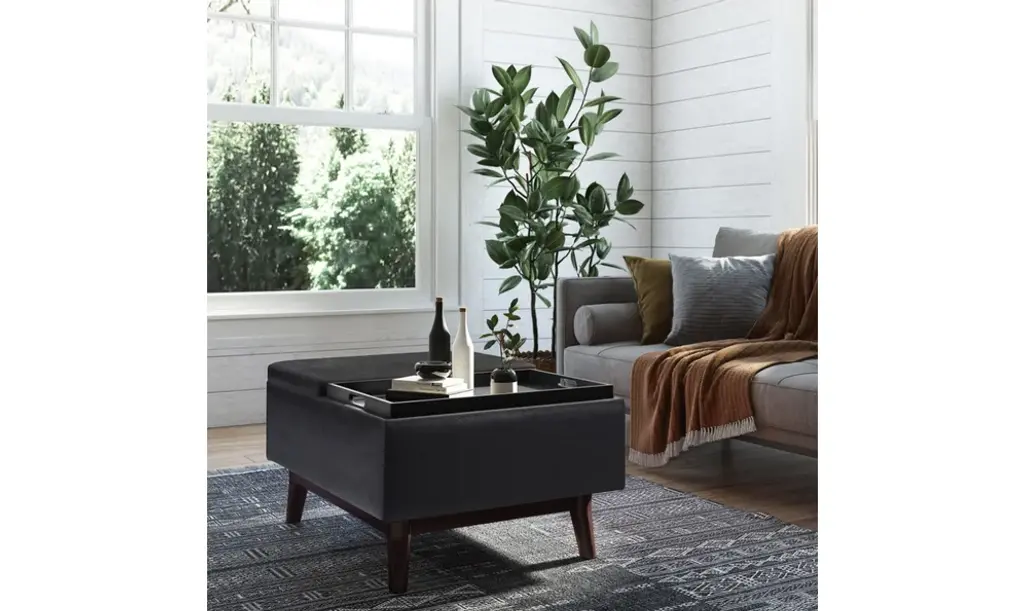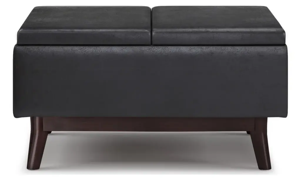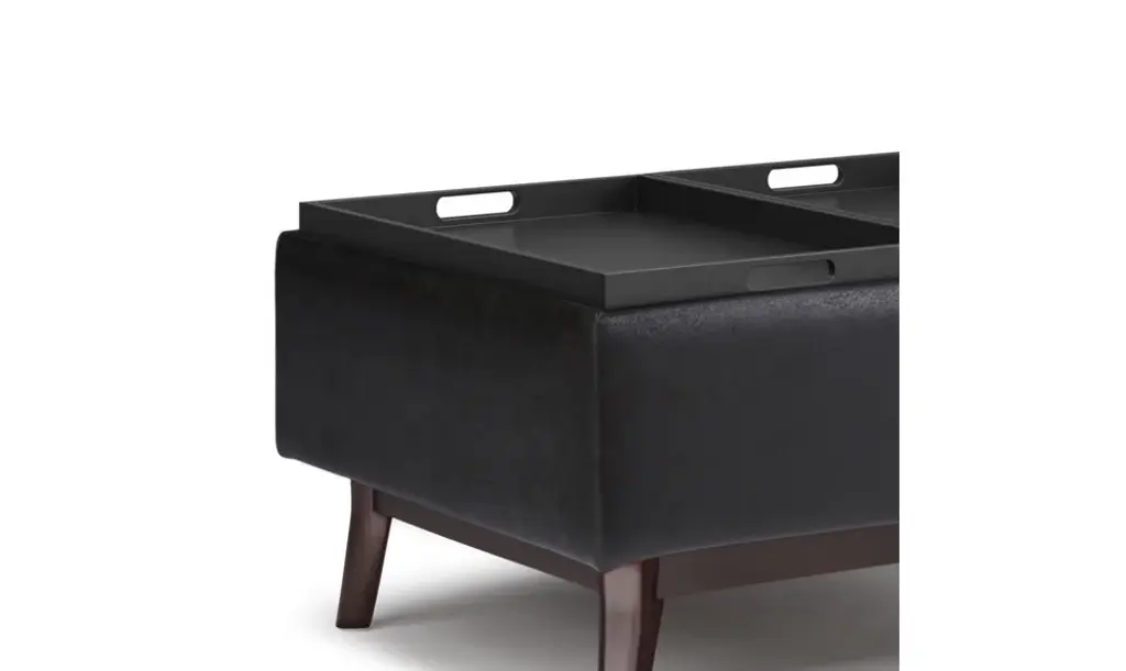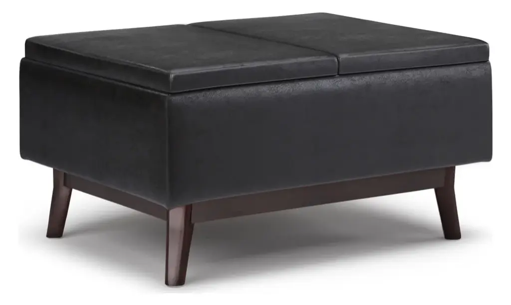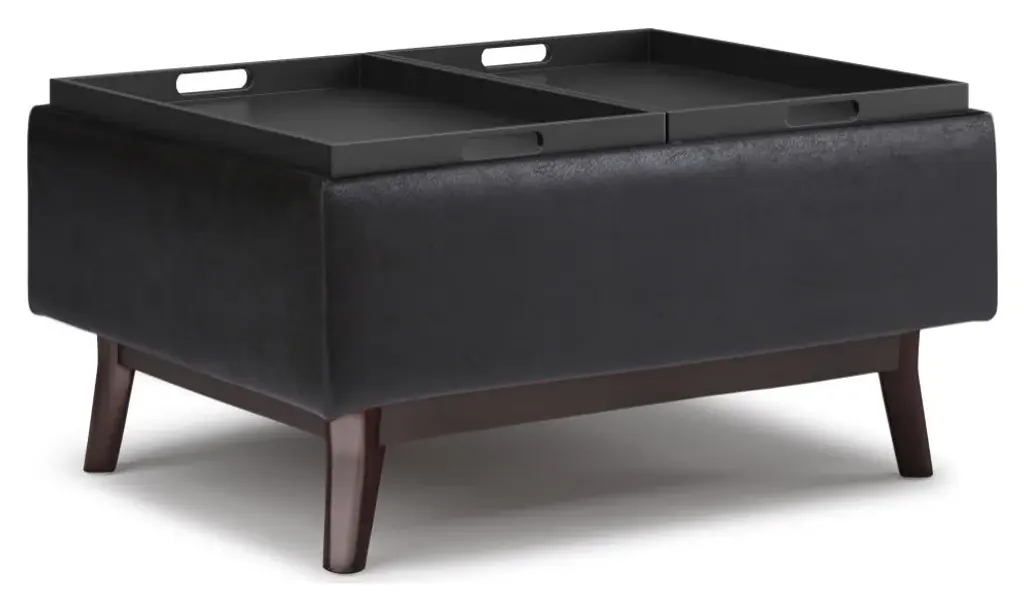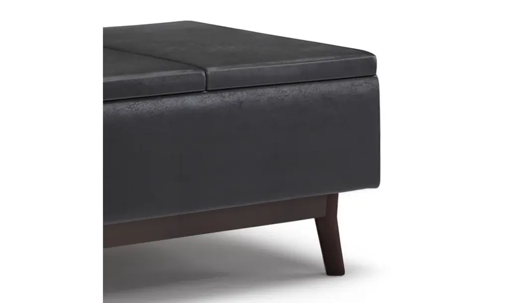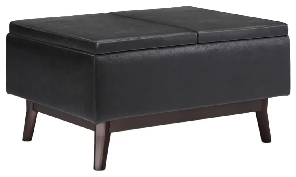 Update your space with the Owen Mid Century Tray Top Storage Ottoman. Its modern style will add a fresh on trend look to your home. It features flip over tray top and a large interior storage space. Made with solid wood and premium fabrics for stylish durability and comfort. Whether used in the living room, family room or den, it will be the showpiece that completes the room.# DIMENSIONS: 26" D x 34" W x 18.5" H# Hand constructed using solid wood, engineered wood and high density foam# Upholstered with a durable Distressed Black Vegan Faux Leather# Features large interior storage space with two flip over serving trays# Multi-functional ottoman can be used in, living room, family room as a coffee table, foot stool, accent furniture or provide additional sitting# Mid Century design and solid wood framed ottoman base# The main body of the ottoman is fully assembled. Simply attach the legs to the base and you�ll be enjoying your ottoman in just a few minutes!# Efforts are made to reproduce accurate colors, variations in color may occur due to computer monitor and photography# We believe in creating excellent, high quality products made from the finest materials at an affordable price. Every one of our products come with a 1-year warranty and easy returns if you are not satisfied.