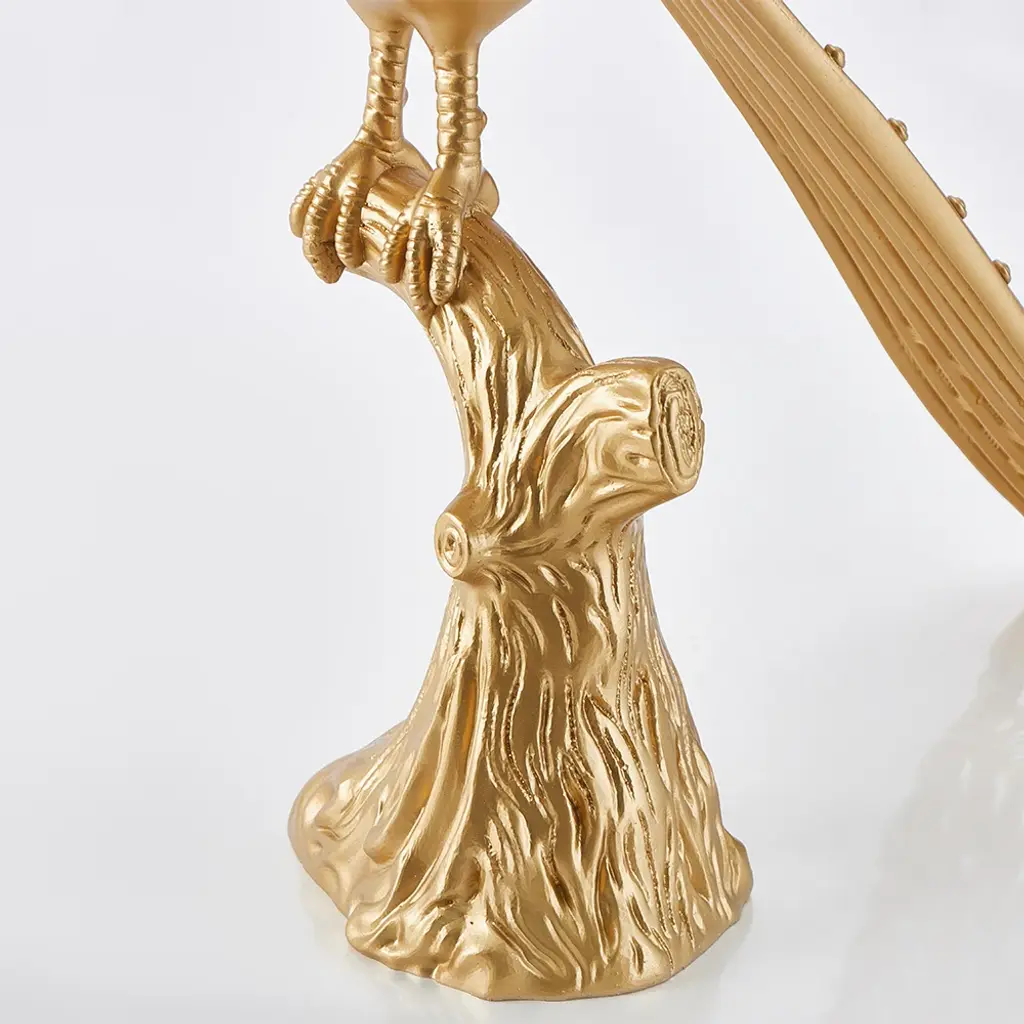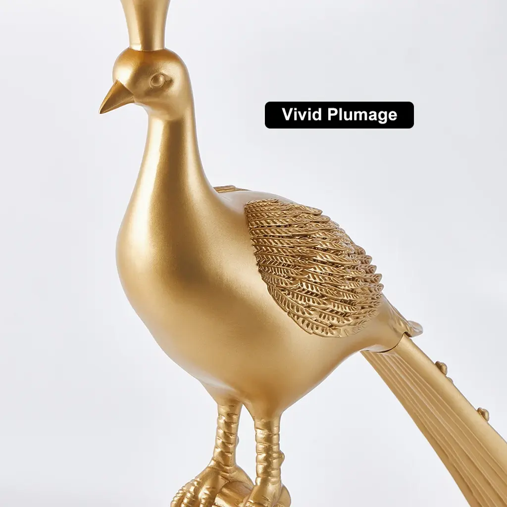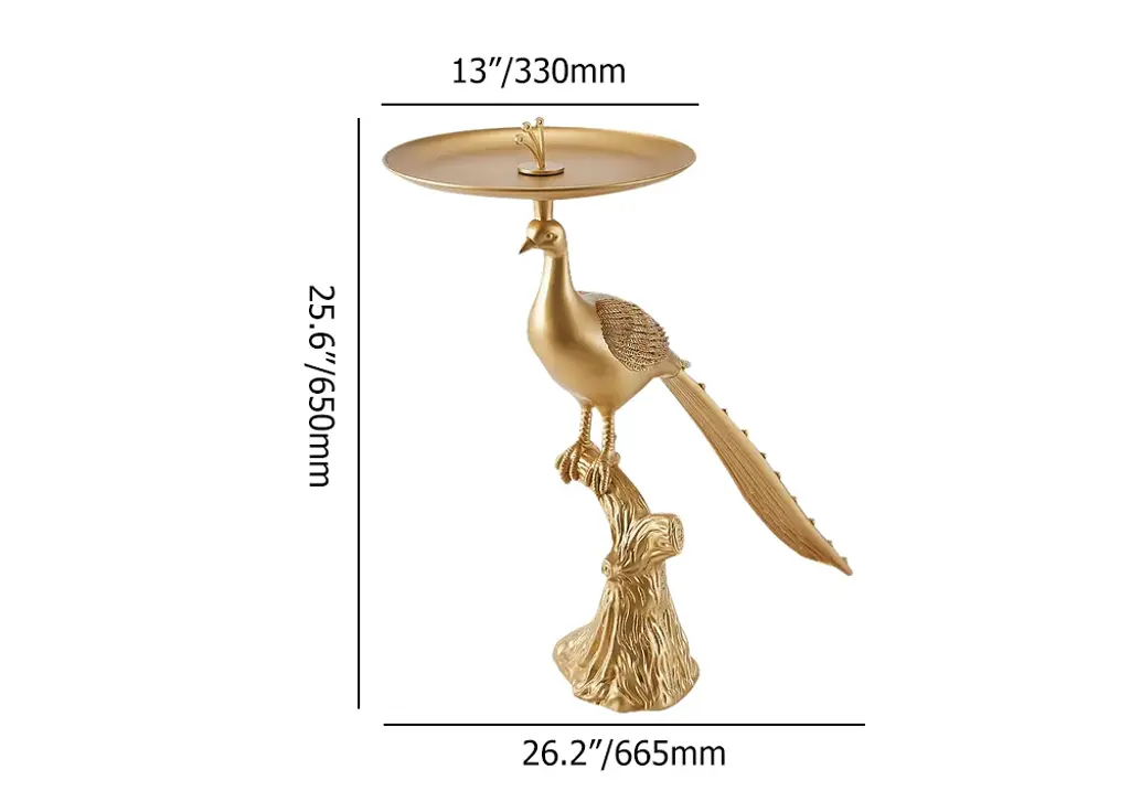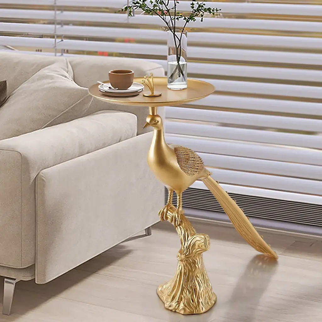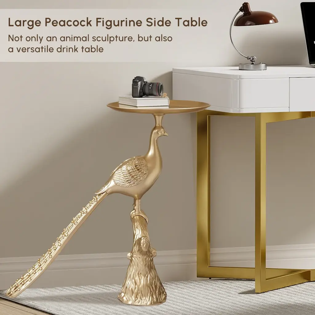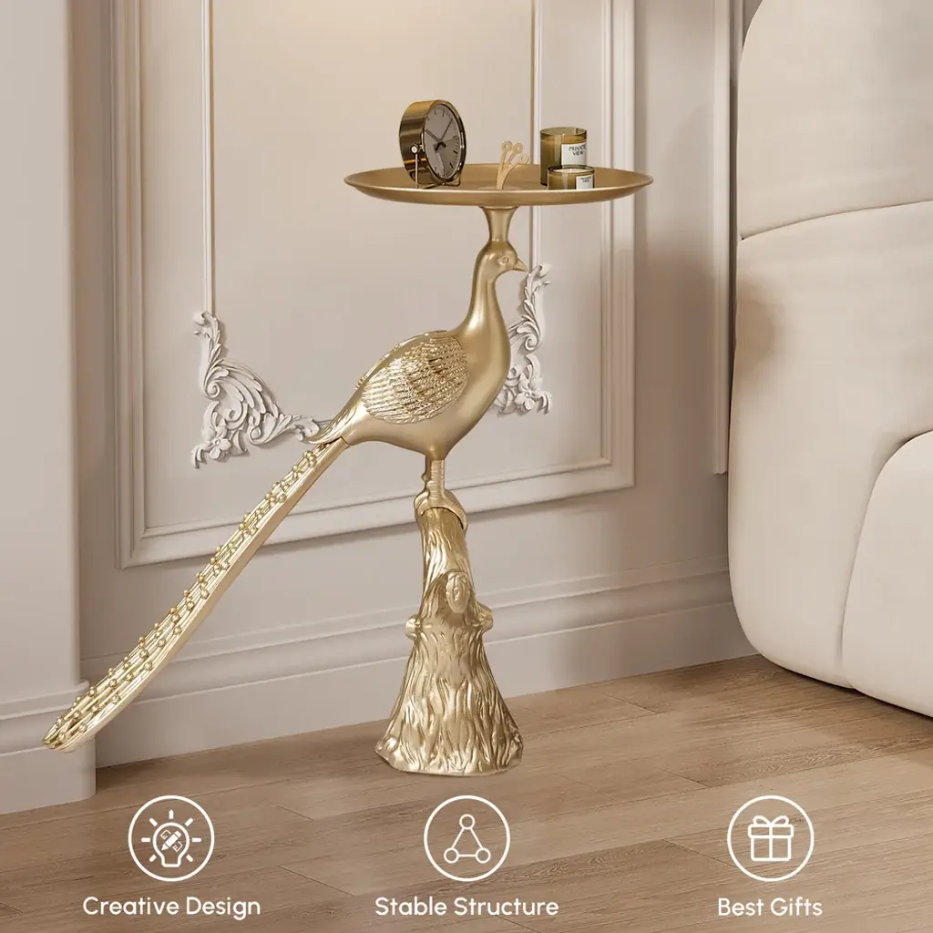 This elegant side table combines functionality with artistic flair. Featuring a golden peacock base, it adds a touch of sophistication and luxury to your living space. The round tabletop provides ample space for beverages or decorative items, making it both a statement piece and practical addition.