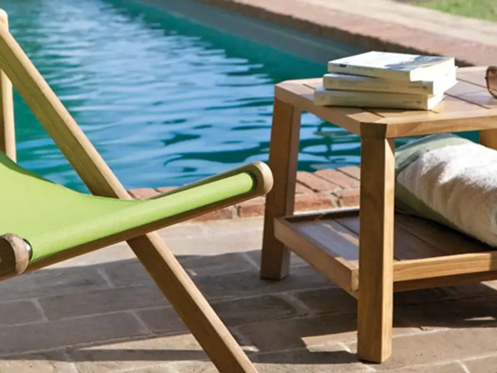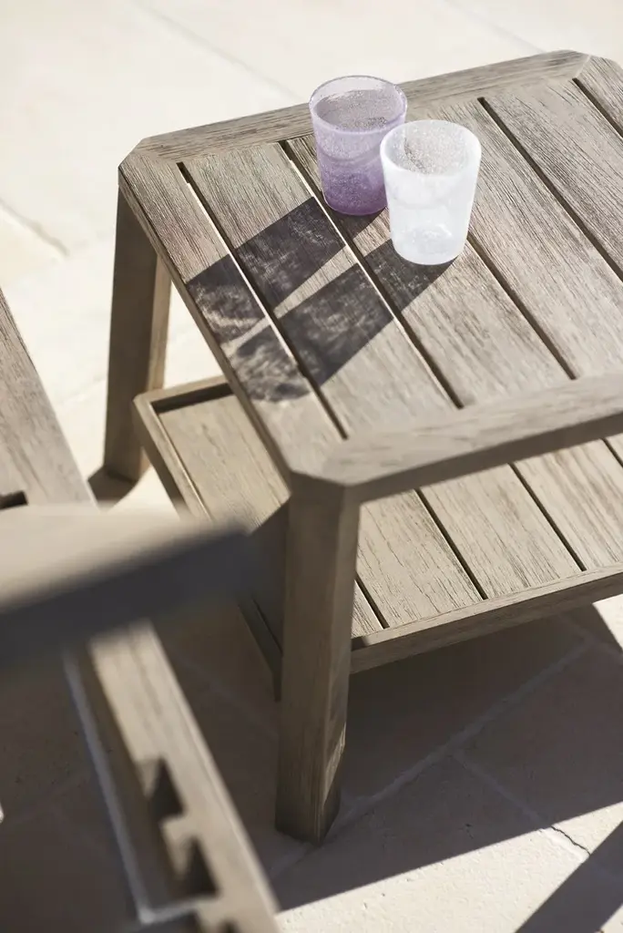 PETIT CLUB are versatile small square or rectangular tables, in natural or pickled teak. The supplementary level becomes a practical tray.