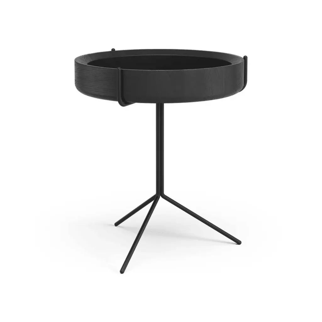 The drum side tables for Scandinavian company Swedese feature beautifully hand turned bowls made from either natural, black or white stained solid ash that are presented within a black or white lacquered steel frame.The frame consists of three equal profiles that form the base whilst also holding the bowl in place. The bowl simply rests on the frame and can be removed, or should a straight surface be required, reversed within the frame.The charming tables have a unique character and come in three different heights and sit individually or look great when clustered together.Available in three sizes:DimensionsD 15.75" x H 14" Small (D 40cm x H 36 cm)D 15.75" x H 18" Medium (D 40cm x H 46 cm) This listingD 15.75" x H 22" Large (D 40cm x H 56 cm)Table top (bowl): Ash wood in natural lacquer finish. Base: Steel base in white lacquer.