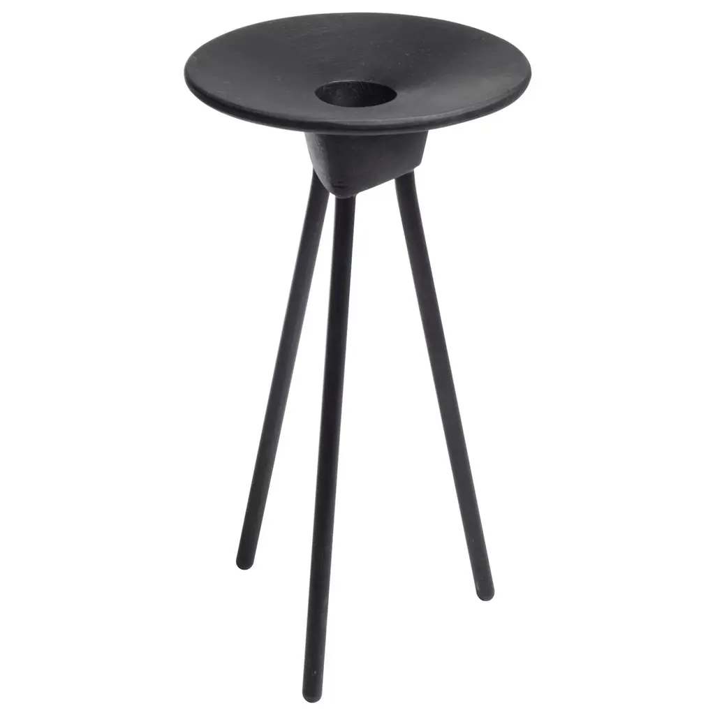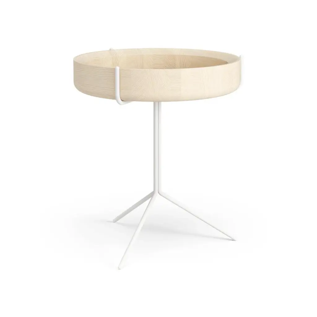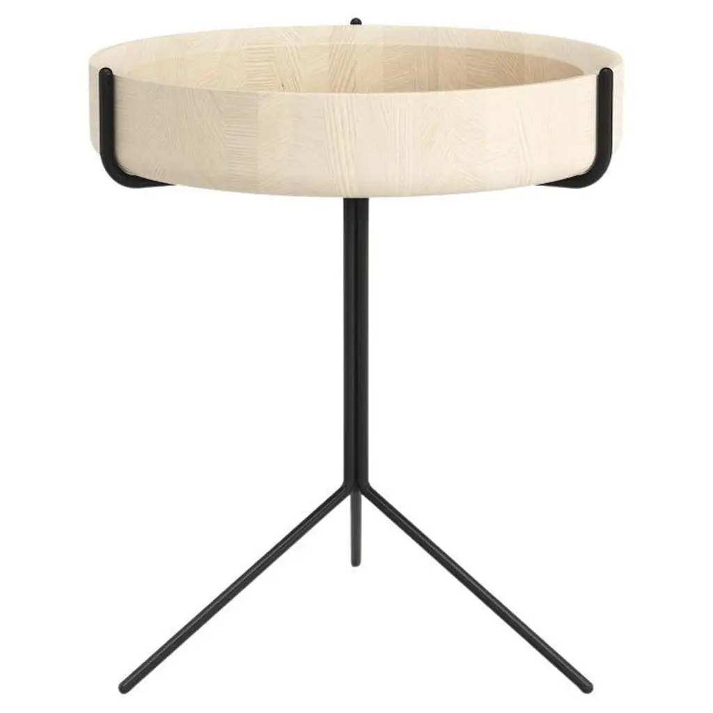 The drum side tables for Scandinavian company Swedese feature beautifully hand turned bowls made from either natural, black or white stained solid ash that are presented within a black or white lacquered steel frame.The frame consists of three equal profiles that form the base whilst also holding the bowl in place. The bowl simply rests on the frame and can be removed, or should a straight surface be required, reversed within the frame.The charming tables have a unique character and come in three different heights and sit individually or look great when clustered together.Available in three sizes:DimensionsD 15.75" x H 14" Small (D 40cm x H 36 cm) This listingD 15.75" x H 18" Medium (D 40cm x H 46 cm)D 15.75" x H 22" Large (D 40cm x H 56 cm)Table top (bowl): Ash wood in black lacquer finish. Base: Steel base in black lacquer.