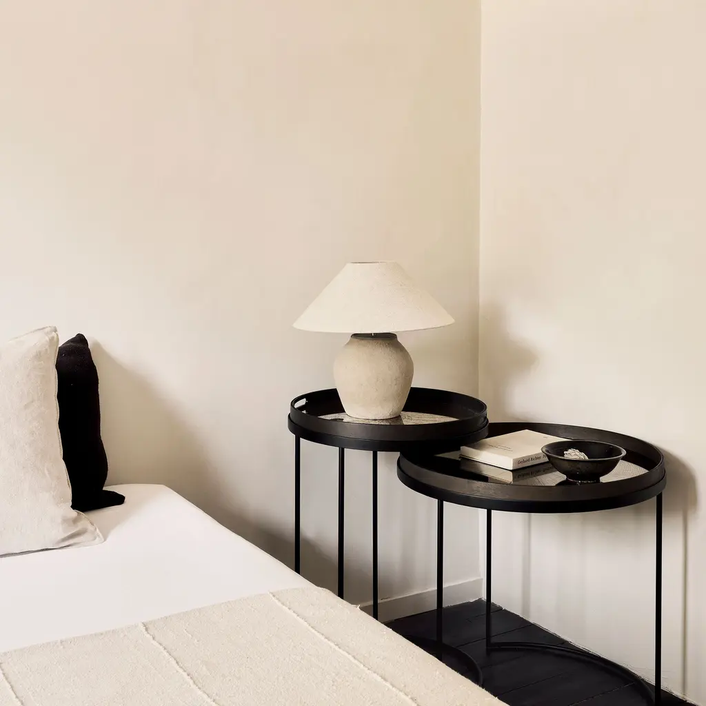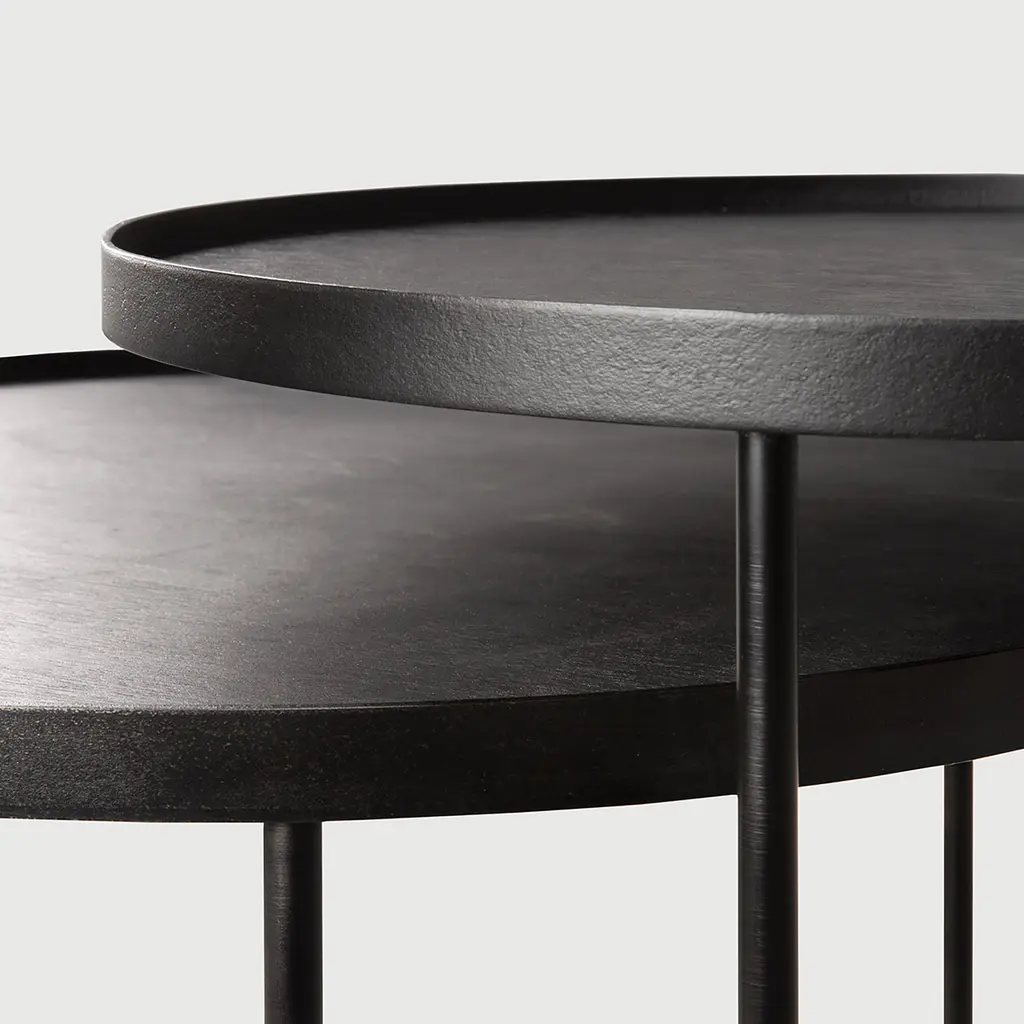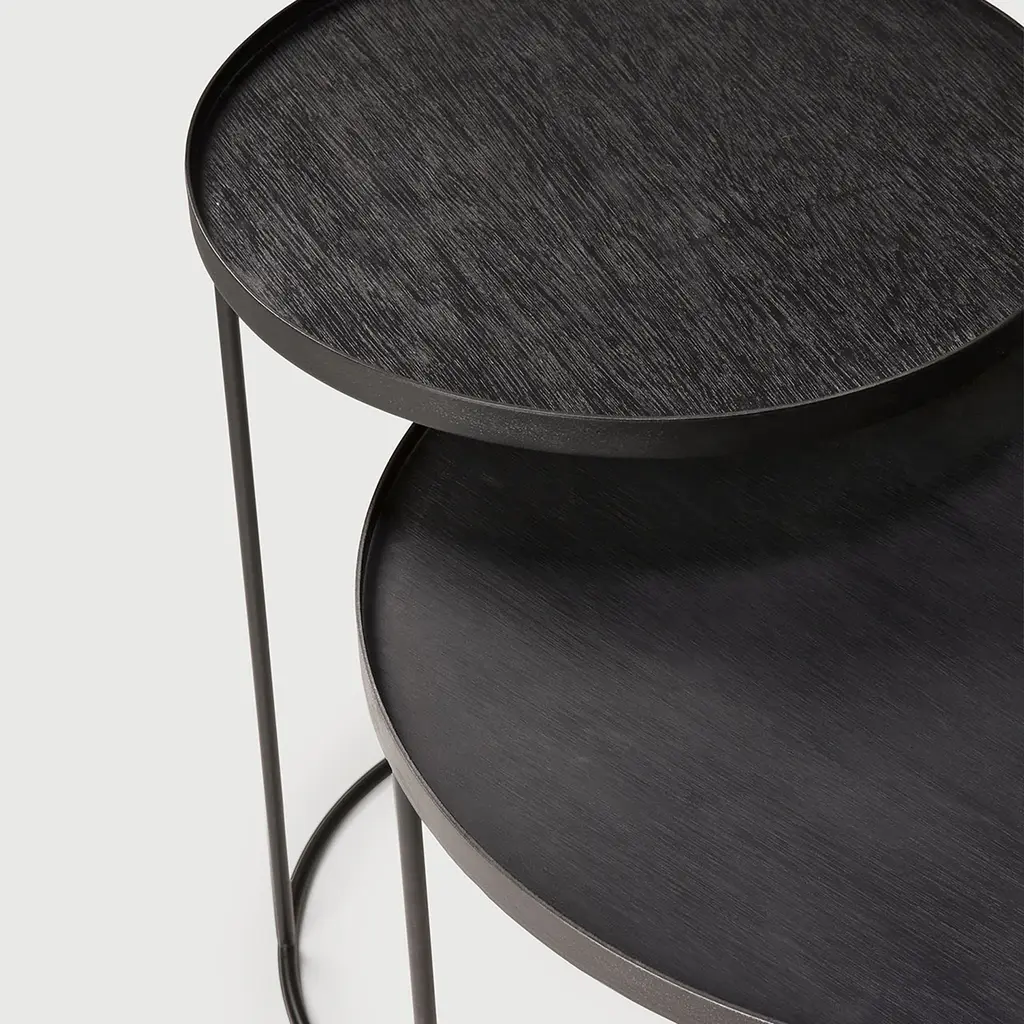 A graphic expression and the potential of customization make the Round Tray Coffee Table Set a perfect choice for your home. Designed by Dawn Sweitzer for Ethnicraft, this set comes with two metal table frames that nest into each other. The tops are crafted from wood with a black finish. Available separately, tray tops allow you to add a personal touch to the design, as you can mix-and-match patterns and colors to create the desired look. Made in two sizes, the two tables have circular, cylindrical bases manufactured from slim tubular metal with a black finish. Use them together on on their own – either way, the Ethnicraft Round Tray Coffee Tables double as side tables and are perfect for living rooms and bedrooms.