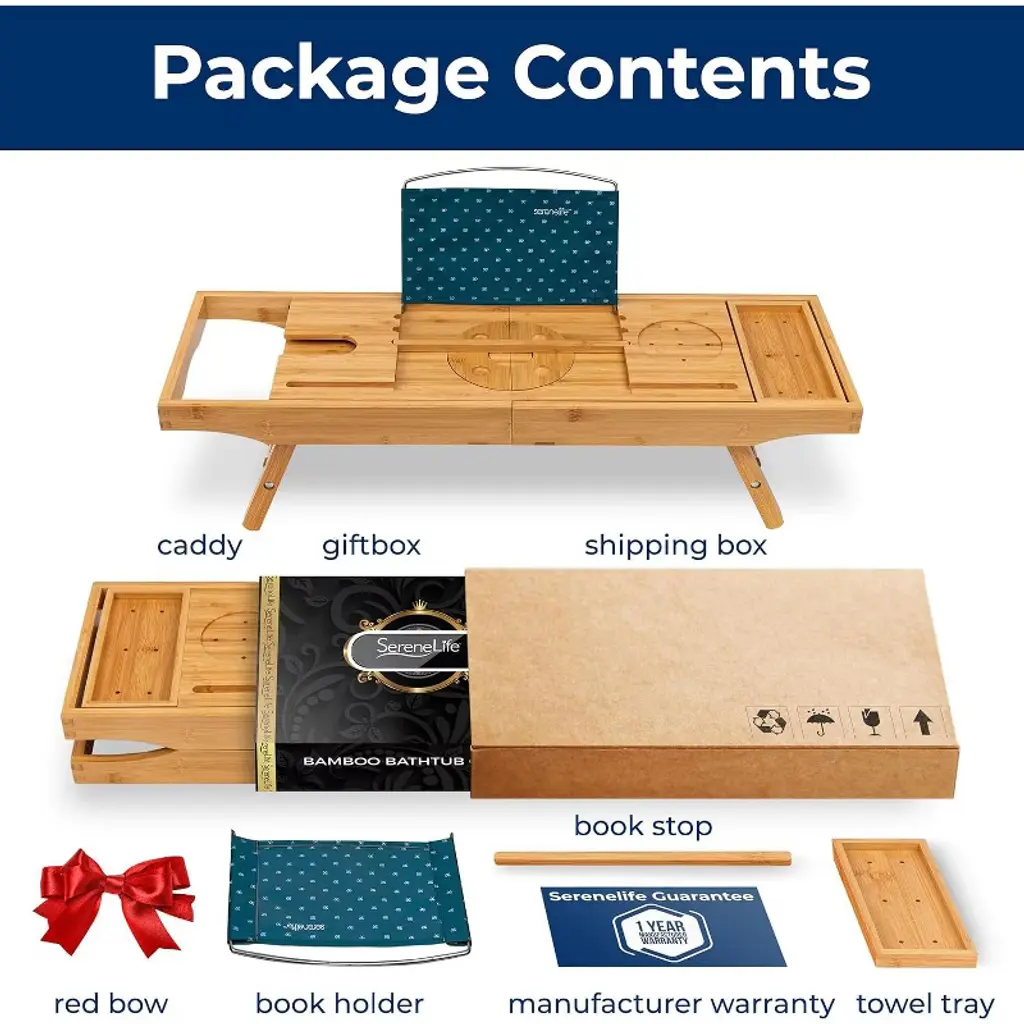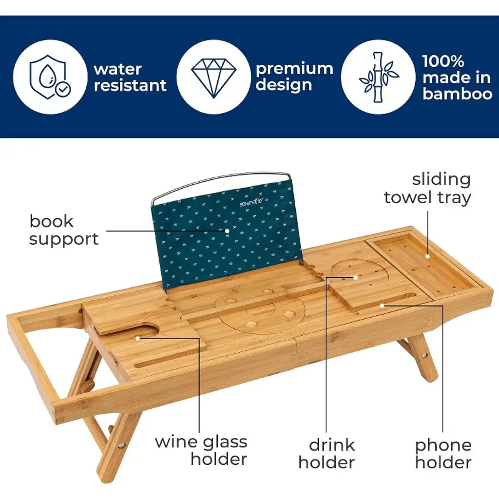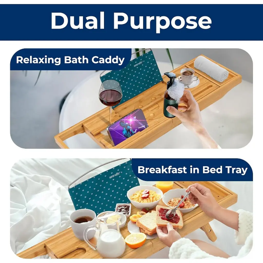 The SereneLife Bamboo Bathtub Caddy offers an elegant and practical solution for your bath time relaxation. Made from 100% natural bamboo, this caddy is designed to fit tubs up to 43 inches wide with adjustable slide-out arms. The lacquer-coated bamboo construction ensures long-lasting durability while being naturally waterproof and resistant to mold and mildew. The caddy features ergonomically designed grooves for holding wine glasses and candles, as well as an integrated holder for your smartphone, tablet, or book. It also includes removable trays for your bath essentials and a bamboo soap box. Whether you're enjoying a bath or using it as a laptop or bed tray, this versatile caddy is perfect for a relaxing experience.